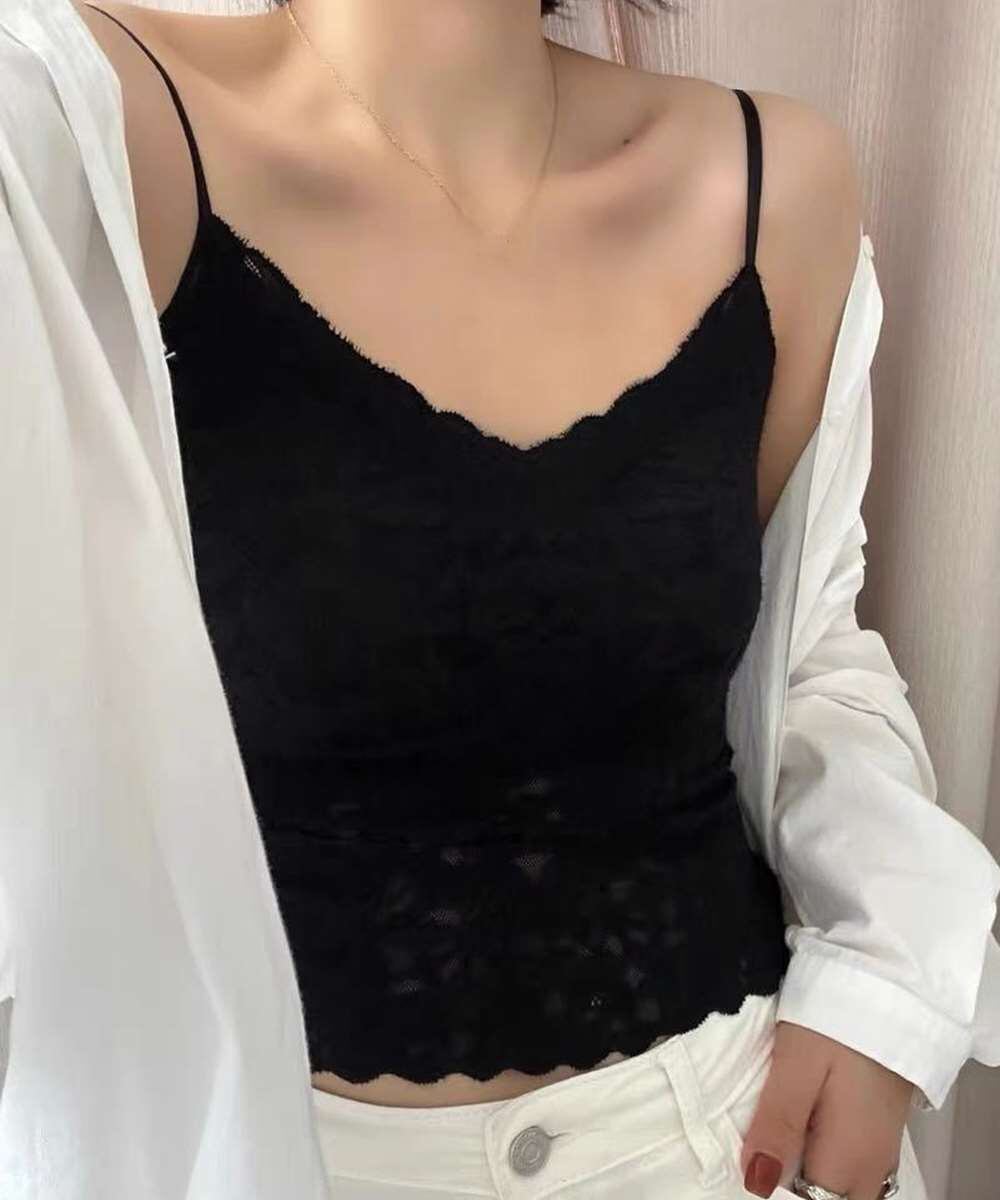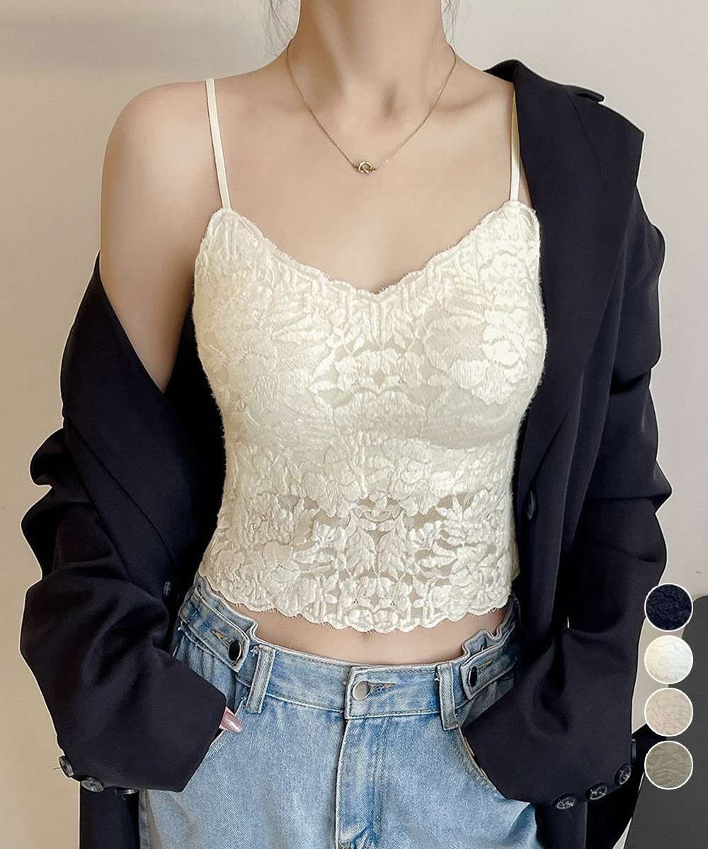 フロントにレースが施された、カップ付きのクロップド丈キャミソール。