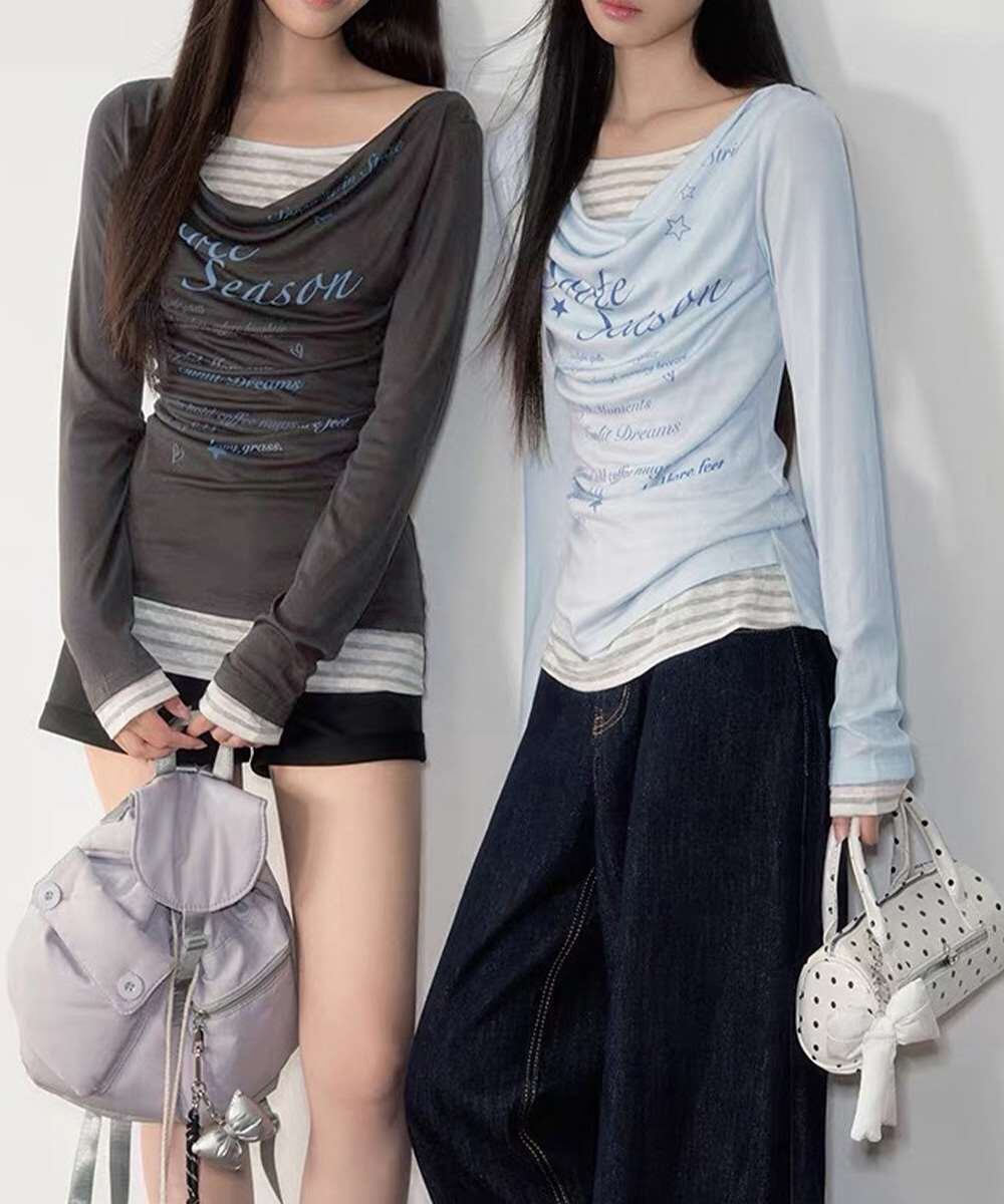 ドレープネックにレタリングデザインを施した、シアーロングTシャツとボーダーインナーのフェイクレイヤードトップス。