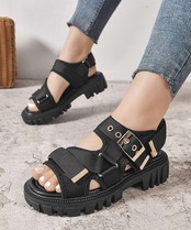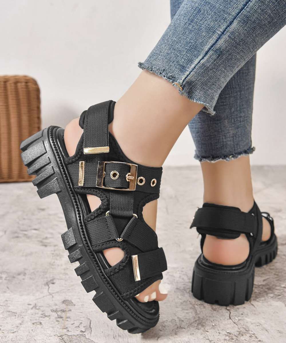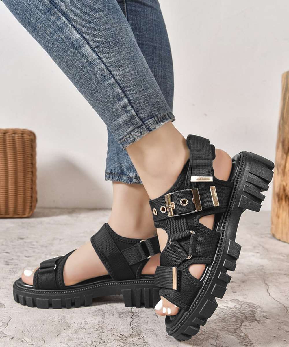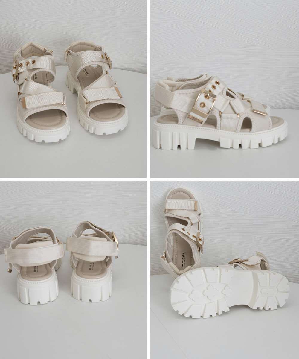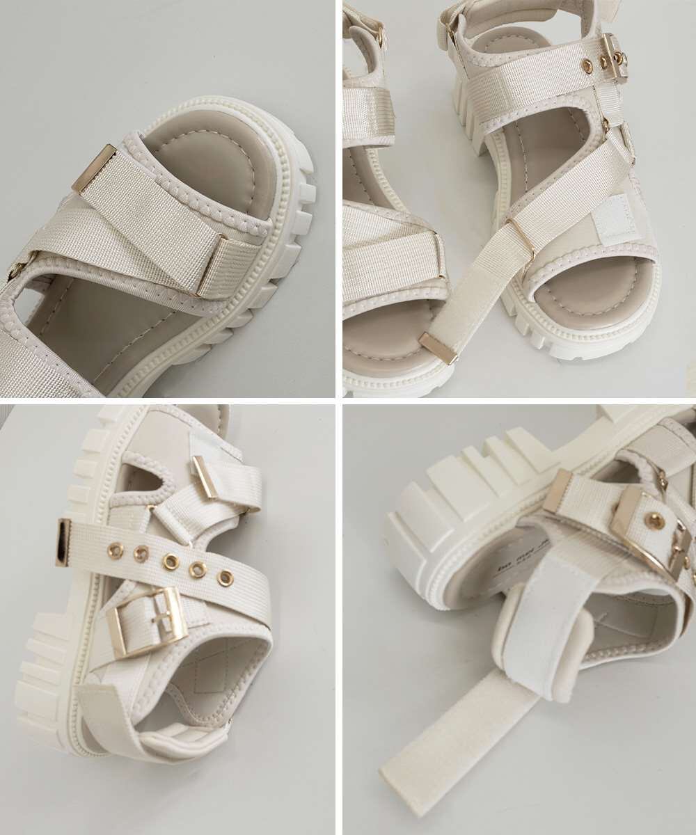 メタリックパーツがアクセントになった、クールな雰囲気の厚底スポーツサンダル。