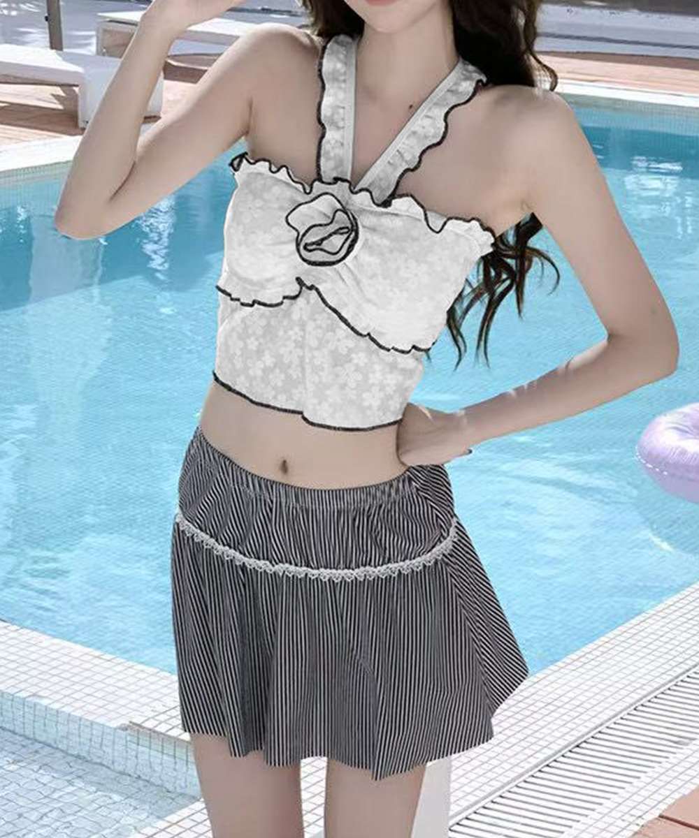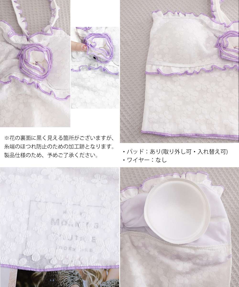 立体フラワーモチーフとフリルが目を引く三点セットスイムウェア。