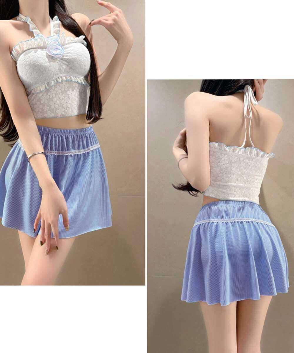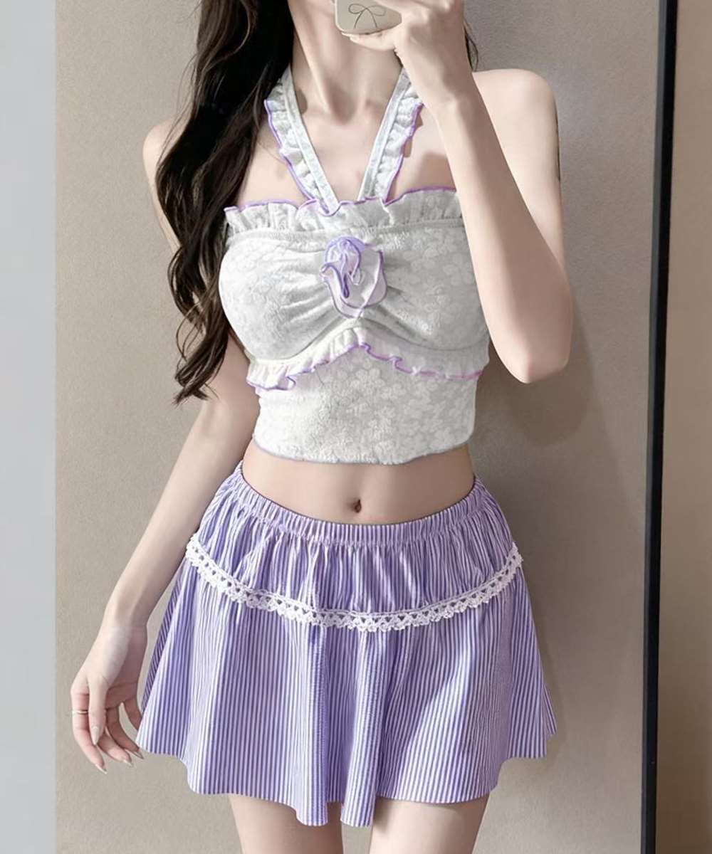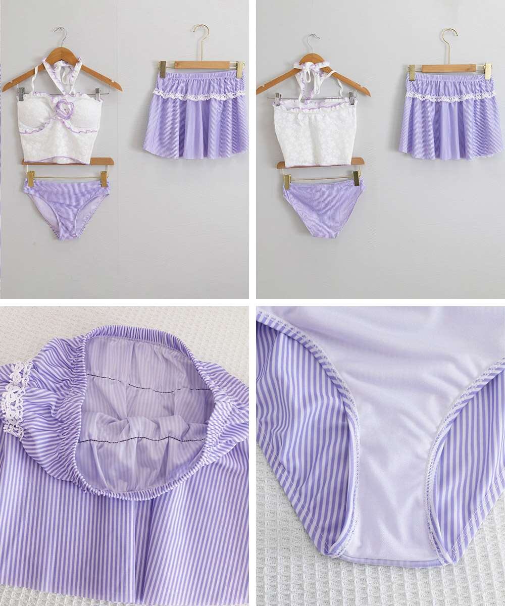 大人可愛い水着レディース セパレート水着 ホルターネック水着背中見せ ビキニショーツ ストライプスカート 露出控えめ水着
