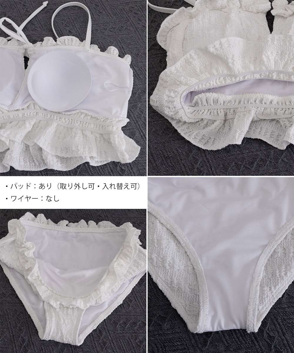ポコポコとした表面感のあるシャーリング素材が今年らしい、フェミニンなフリルビキニ2点セット。