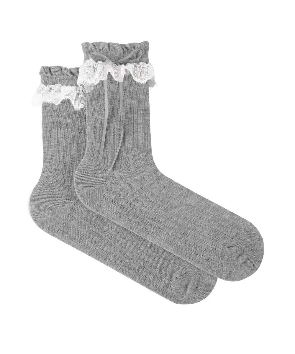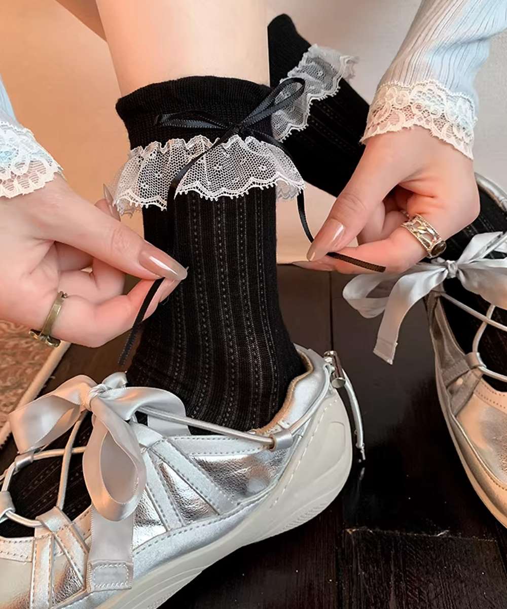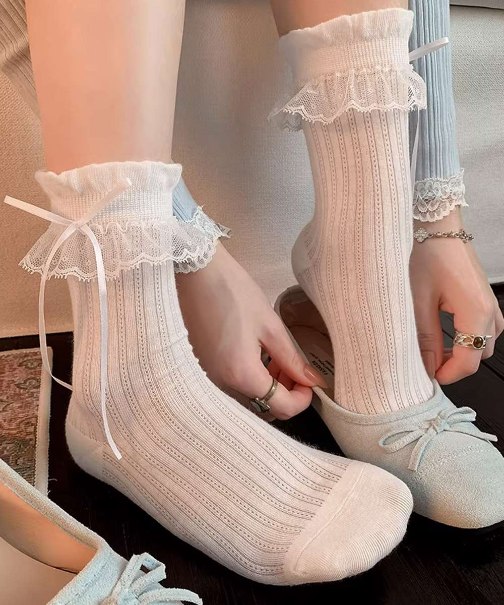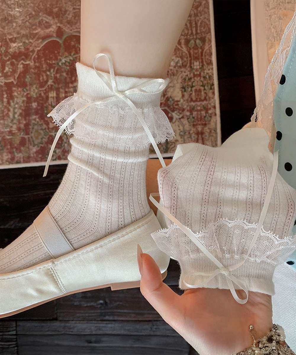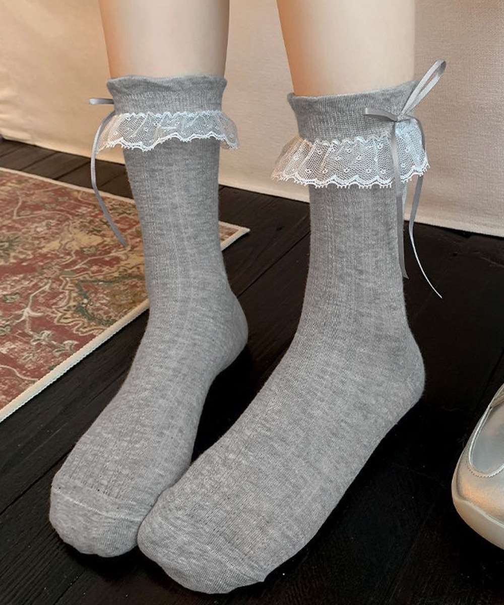 レースフリルとリボンがアクセントになったガーリーなミドルソックス。