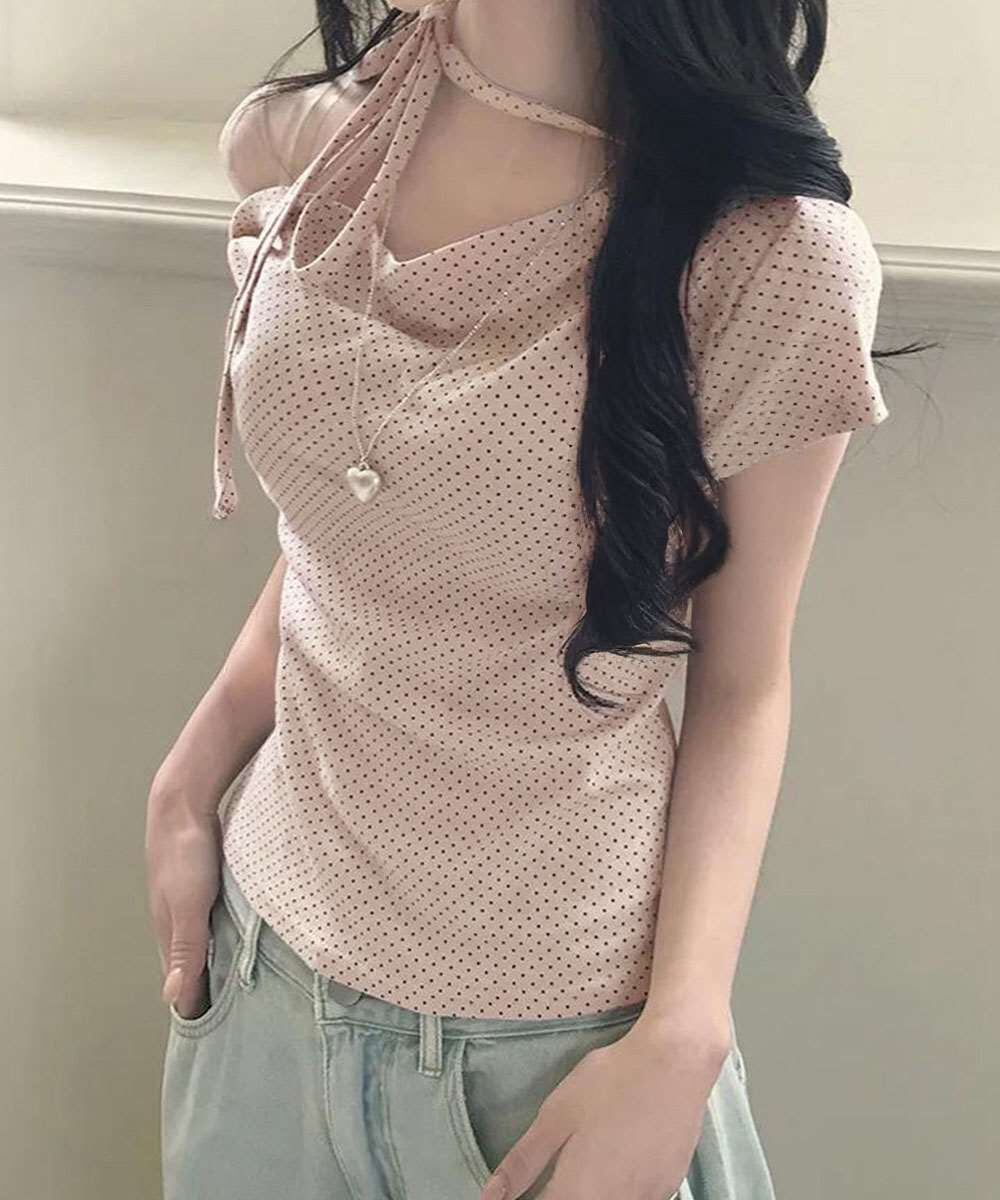 水玉柄が映える、オフショルダー×リボンデザインのレディース半袖Tシャツ。