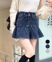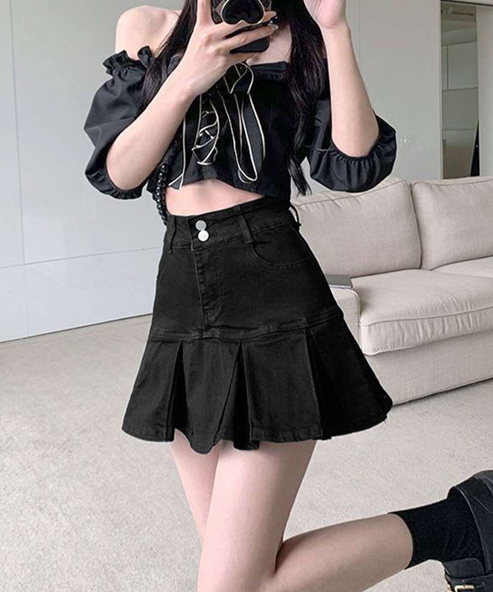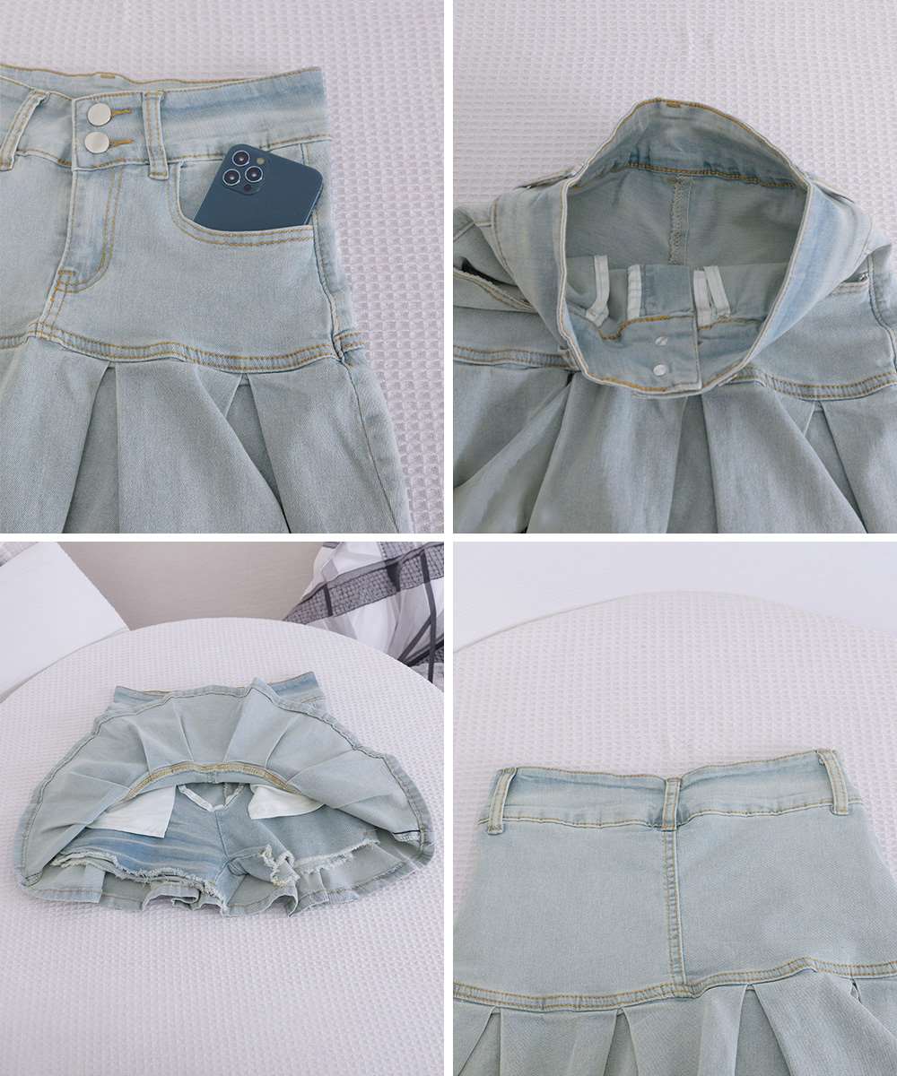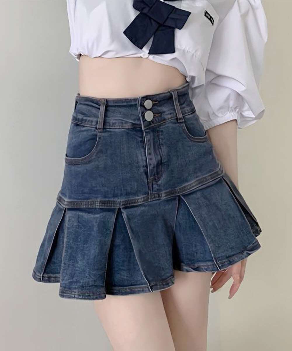 ヒップから美しいプリーツが入った、ウエストボタンデザインの韓国風デニムミニスカート。