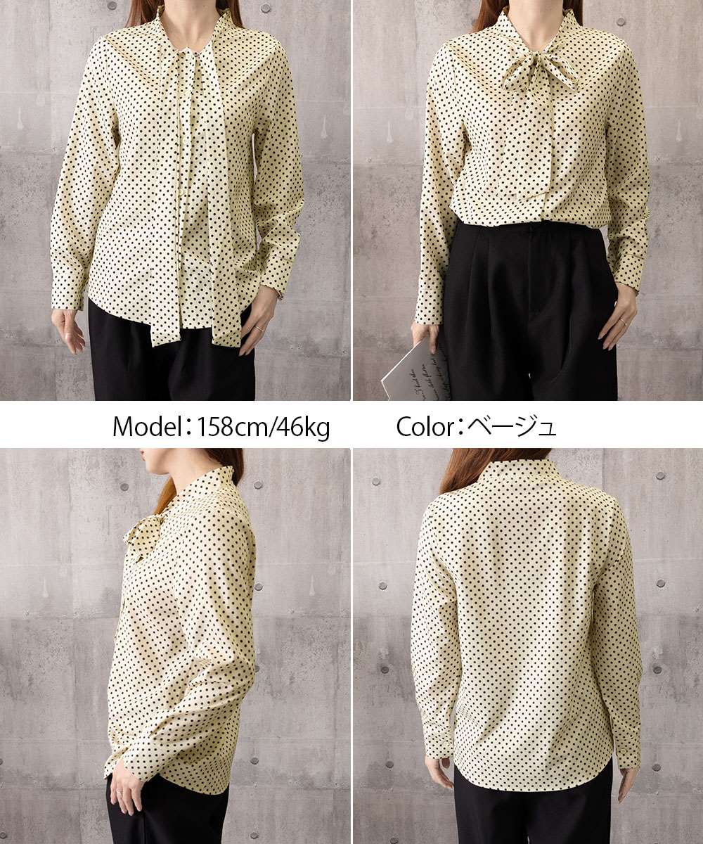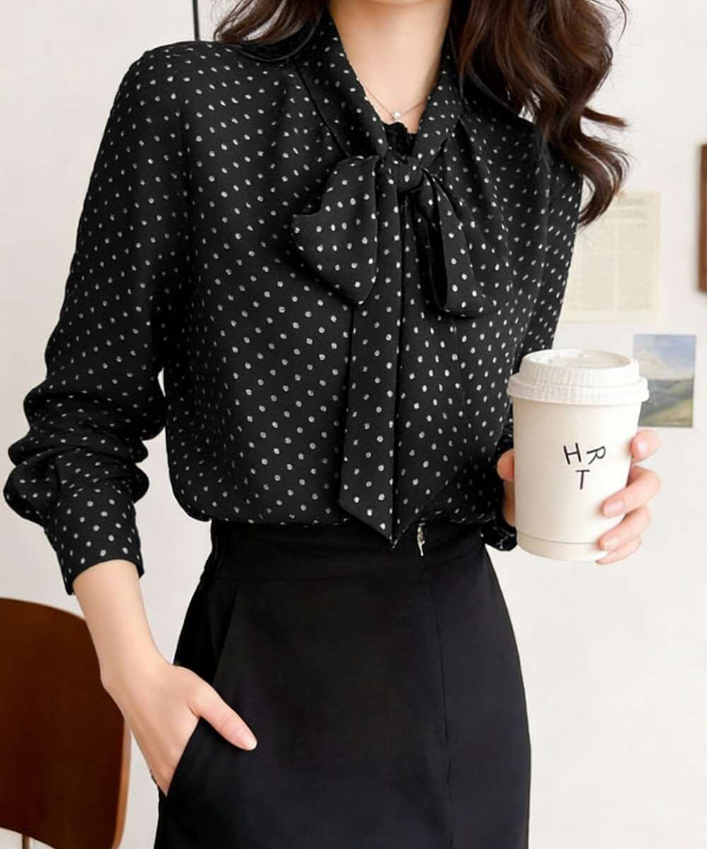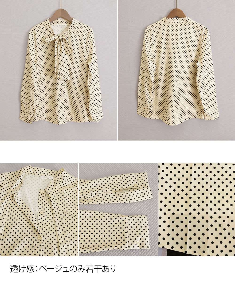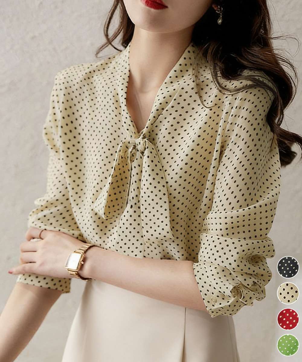 水玉柄が目を惹く、今期新作のレディース長袖リボンタイブラウス。