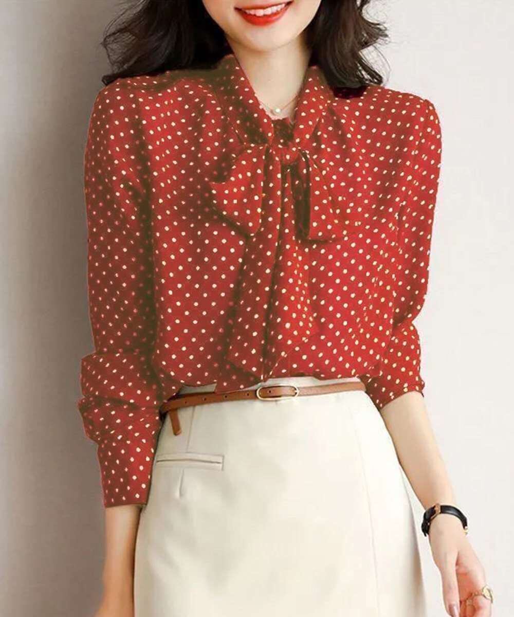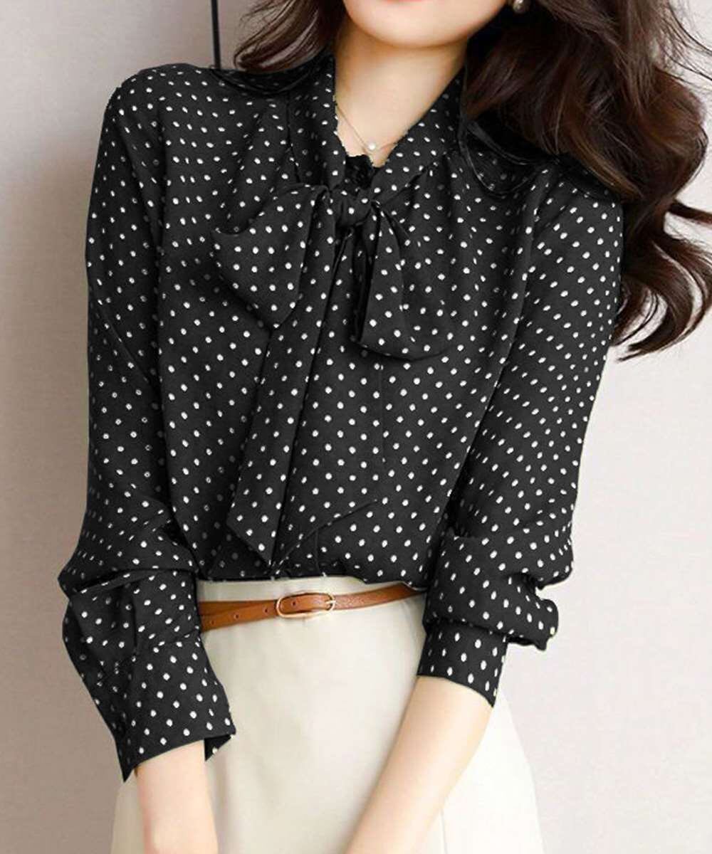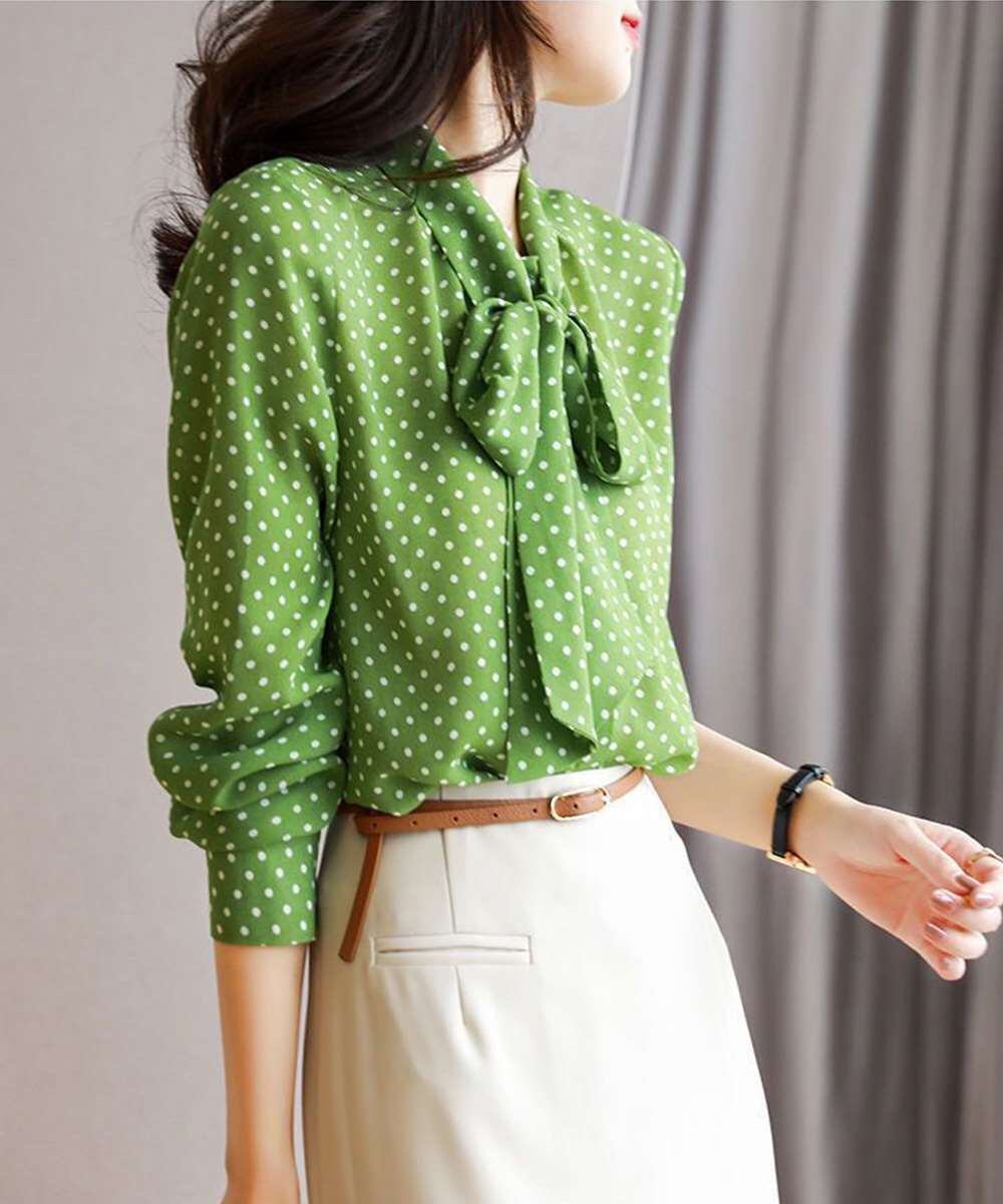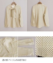 水玉柄が目を惹く、今期新作のレディース長袖リボンタイブラウス。