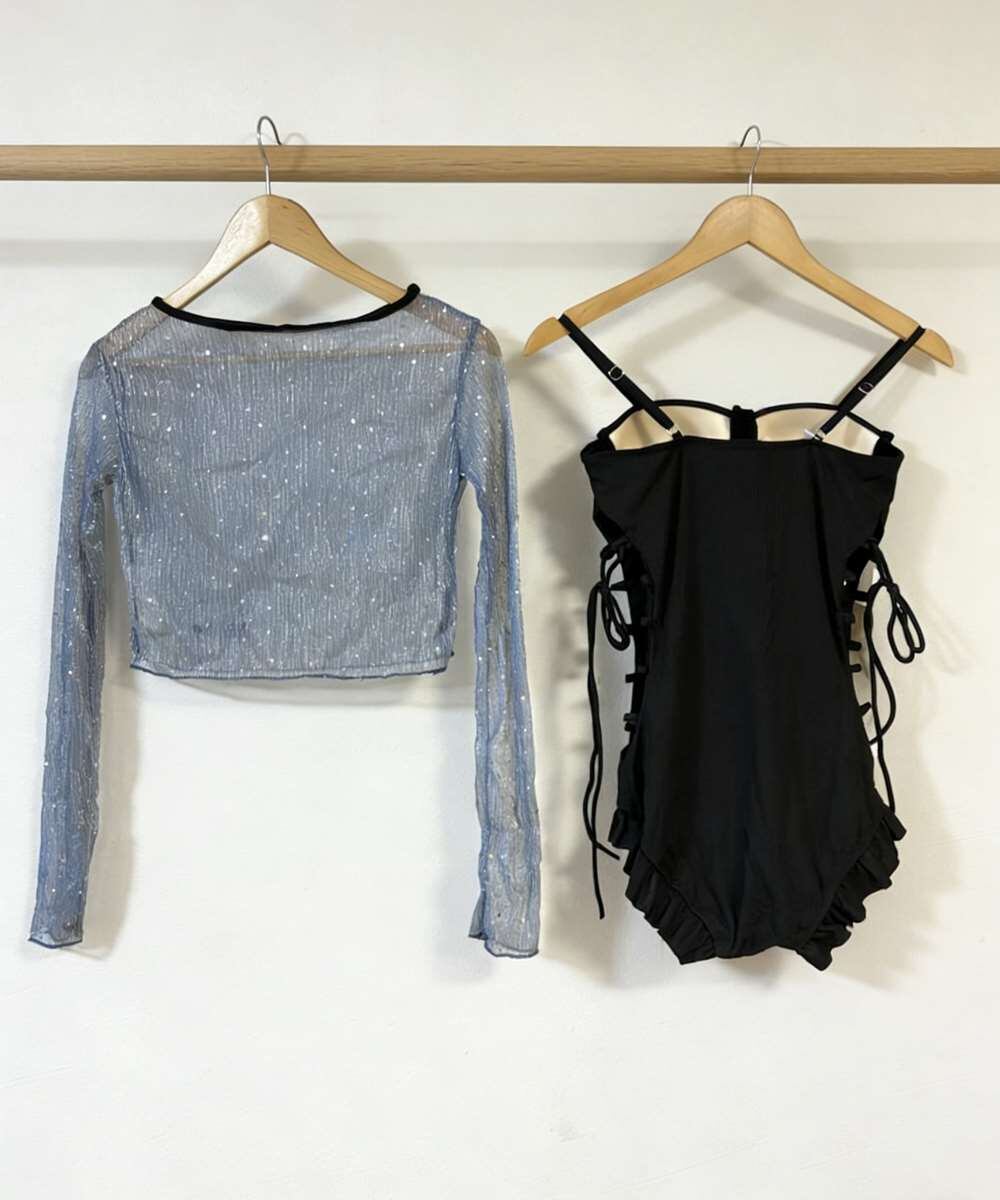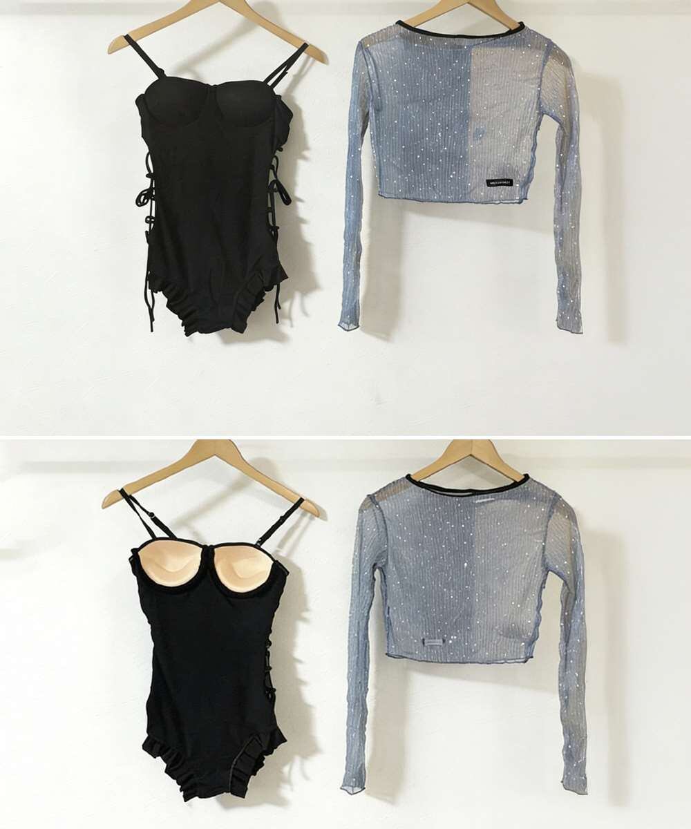 視線を惹きつける、編み上げデザインのワンピース水着2点セット。