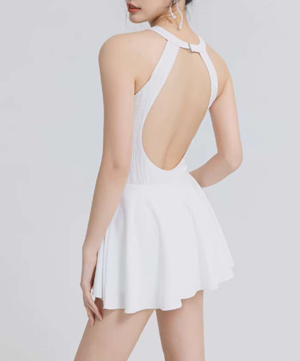 首元をすっきり見せるホルターネックデザインで女性らしさをプラス。