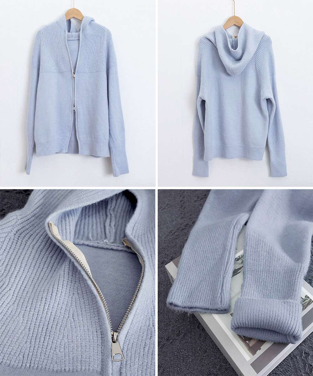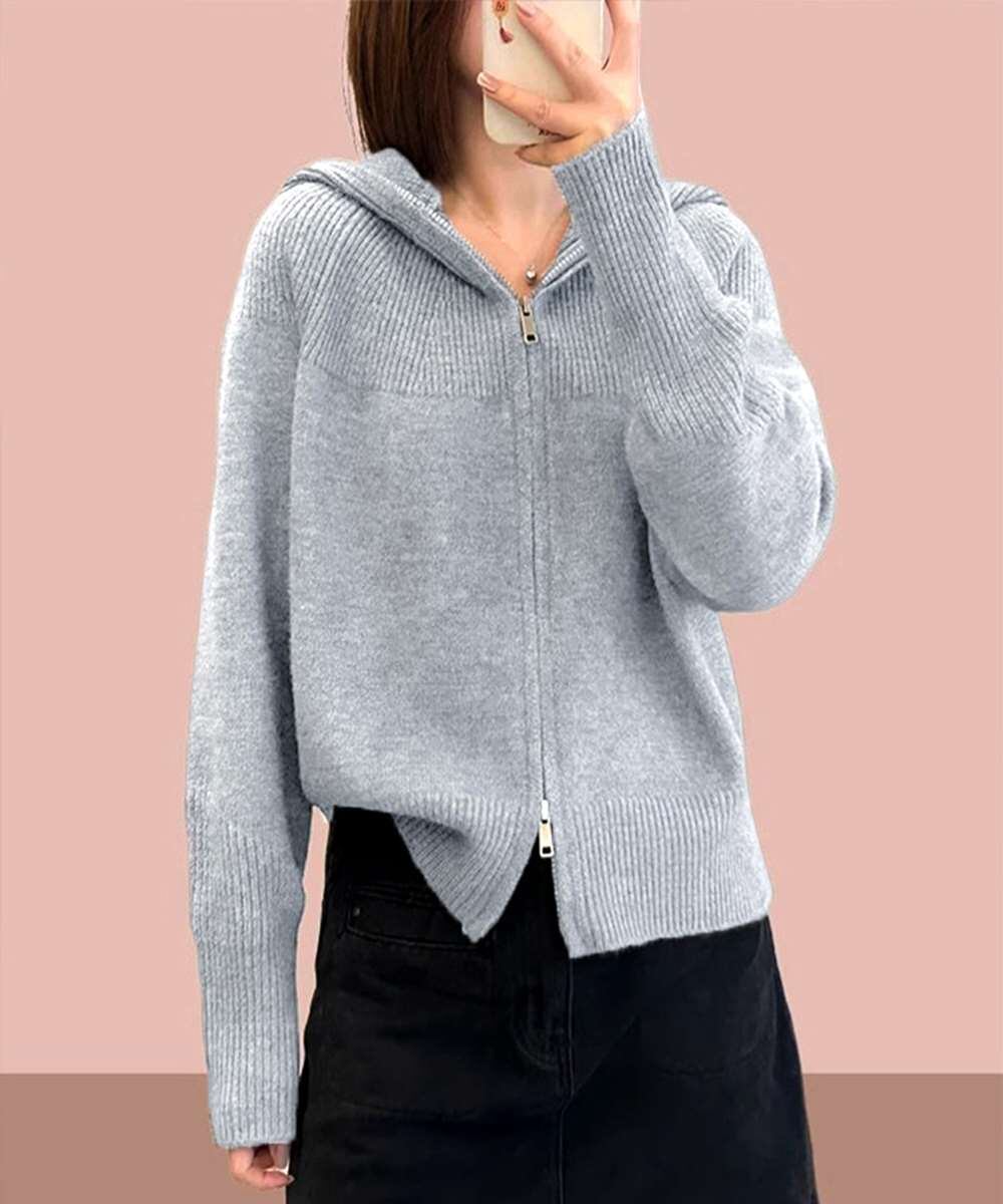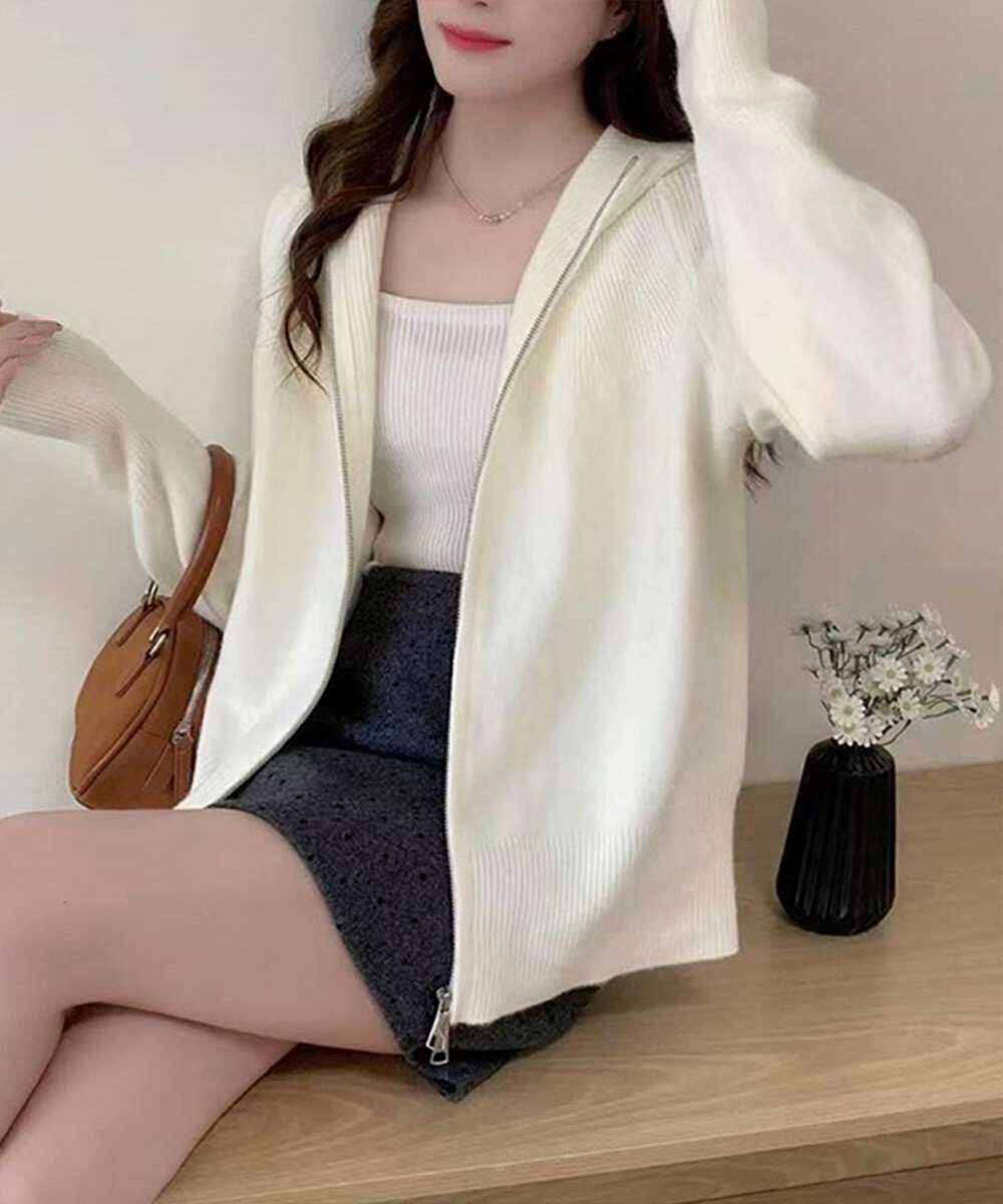 ダブルファースナー 無地 ニット 上着 前開き長袖トップス