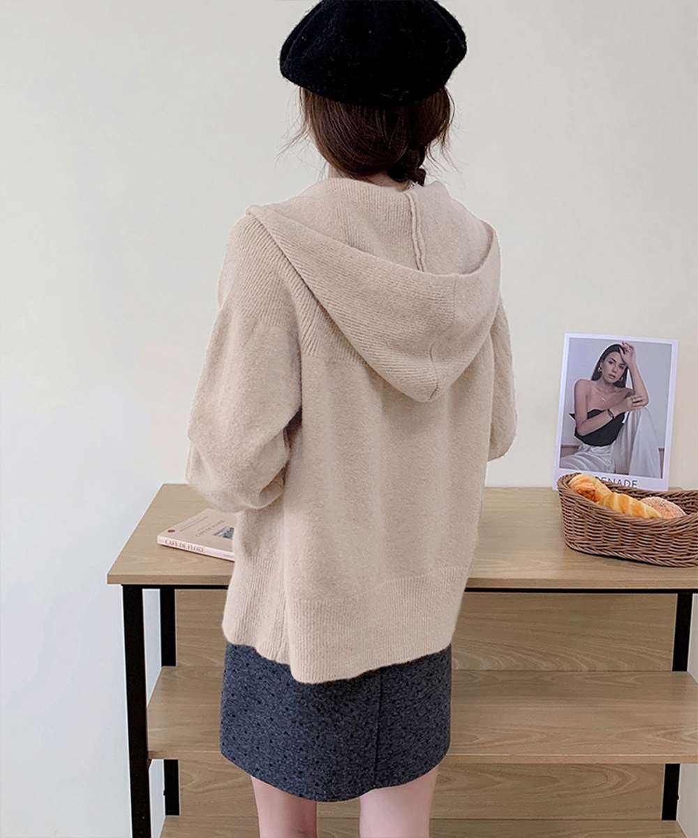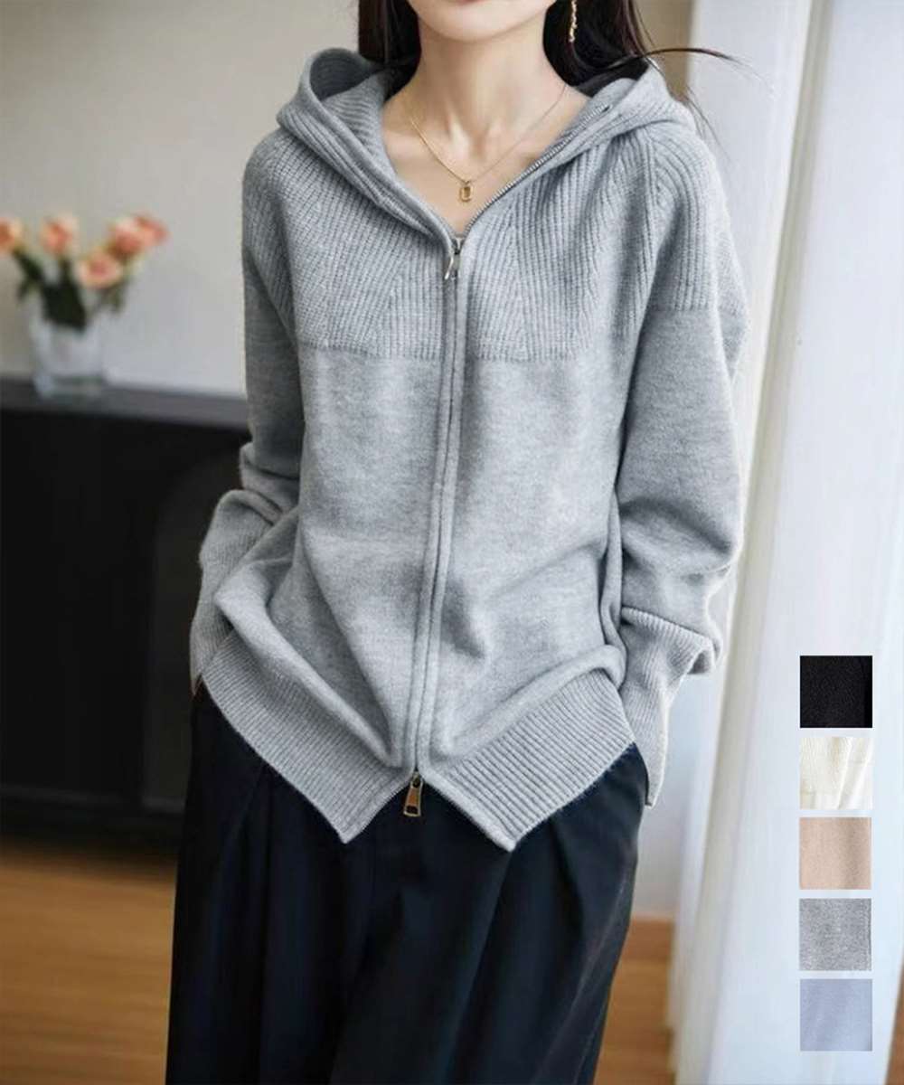 フード付きニットパーカー 体型カバー レディースフーディ 大人カジュアル 暖かいリブニットトップス ライトアウター 通学