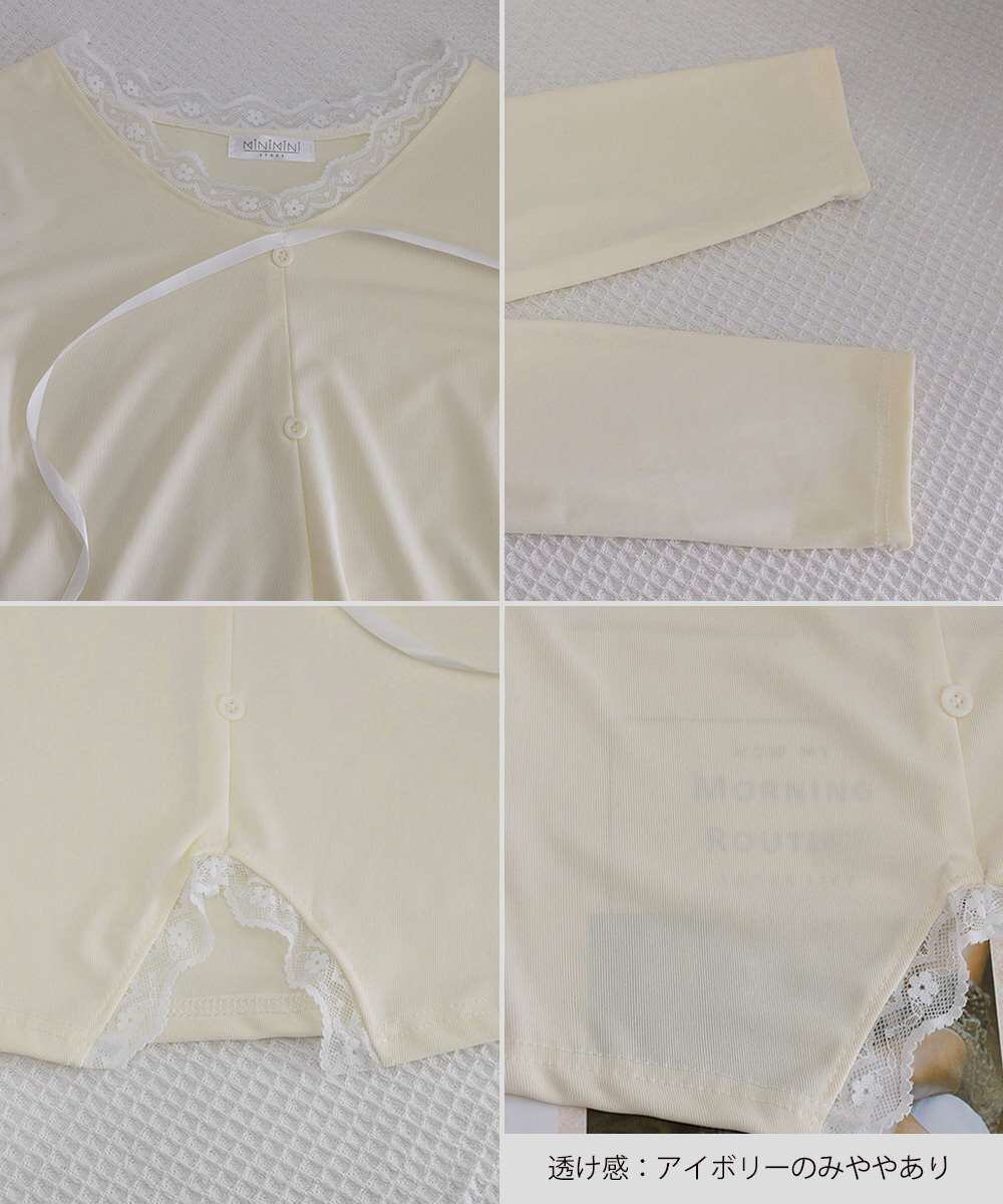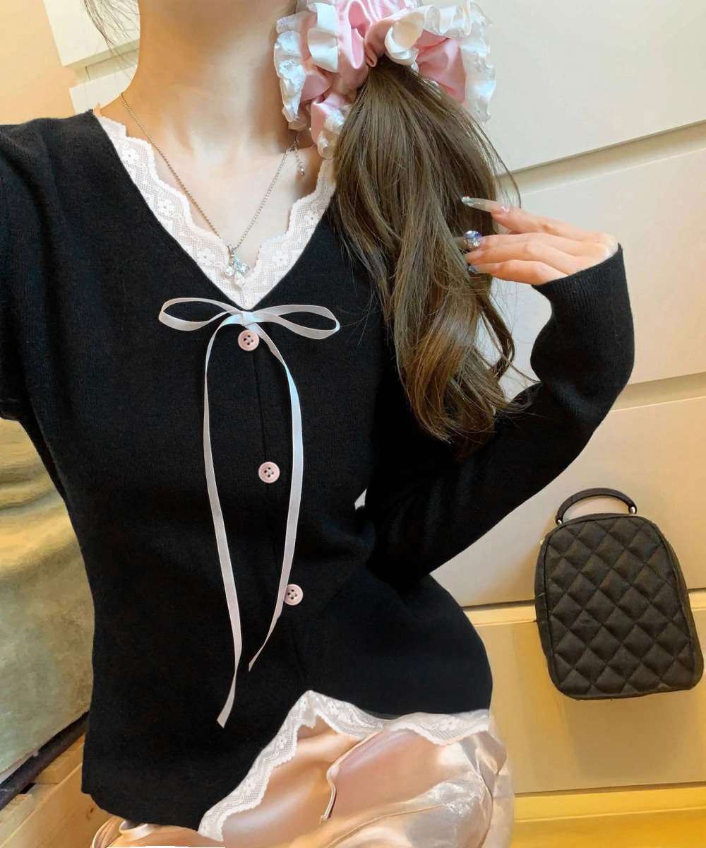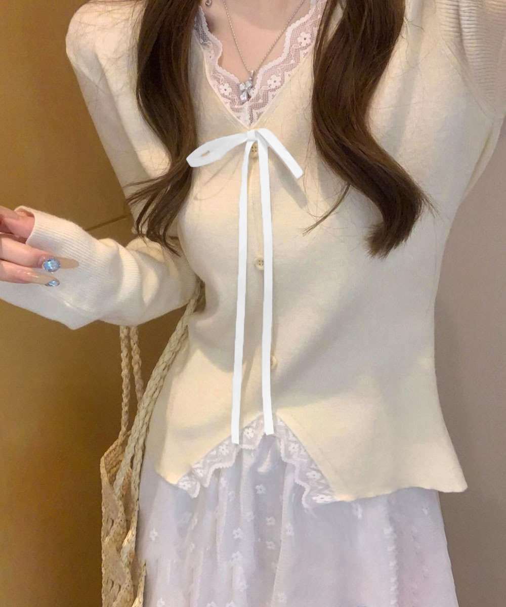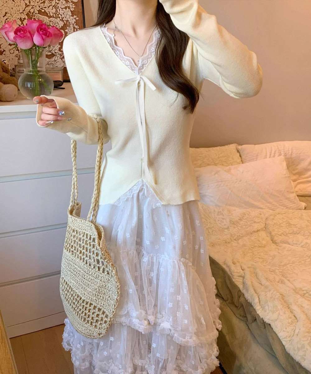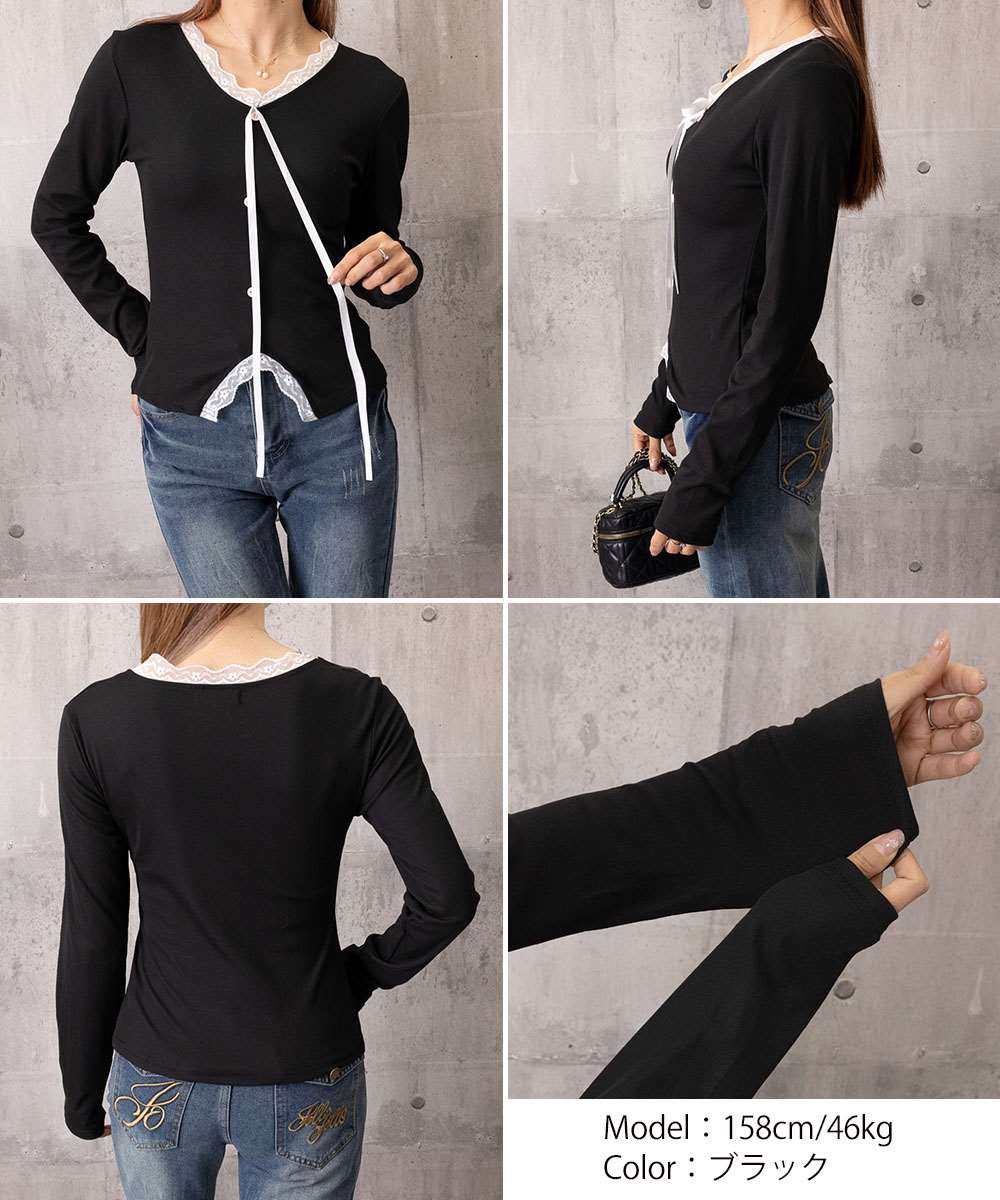 Vネックにあしらったレースとリボンが、上品な甘さをプラス。
