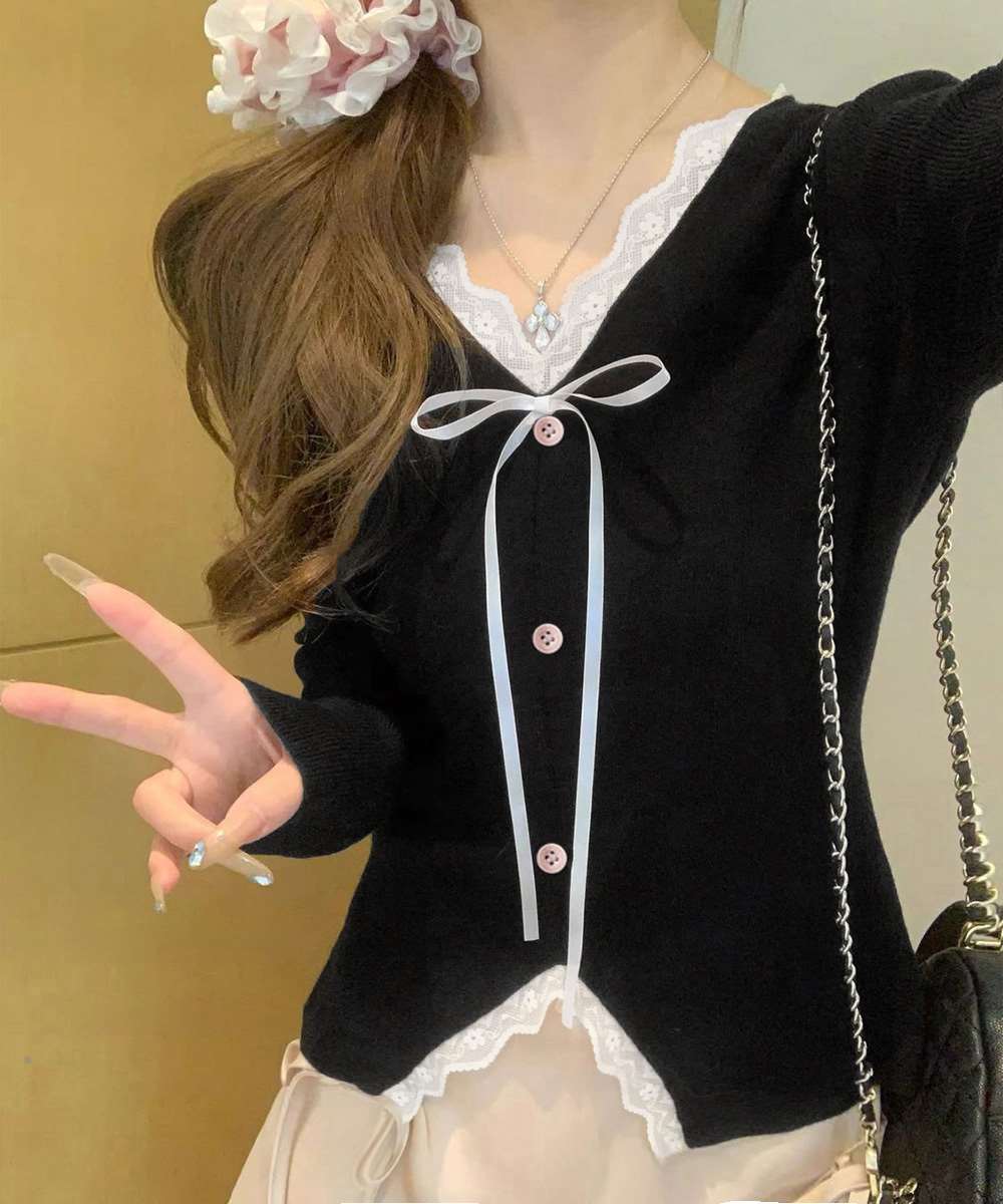 リボン ニット トップス レース切り替え 長袖