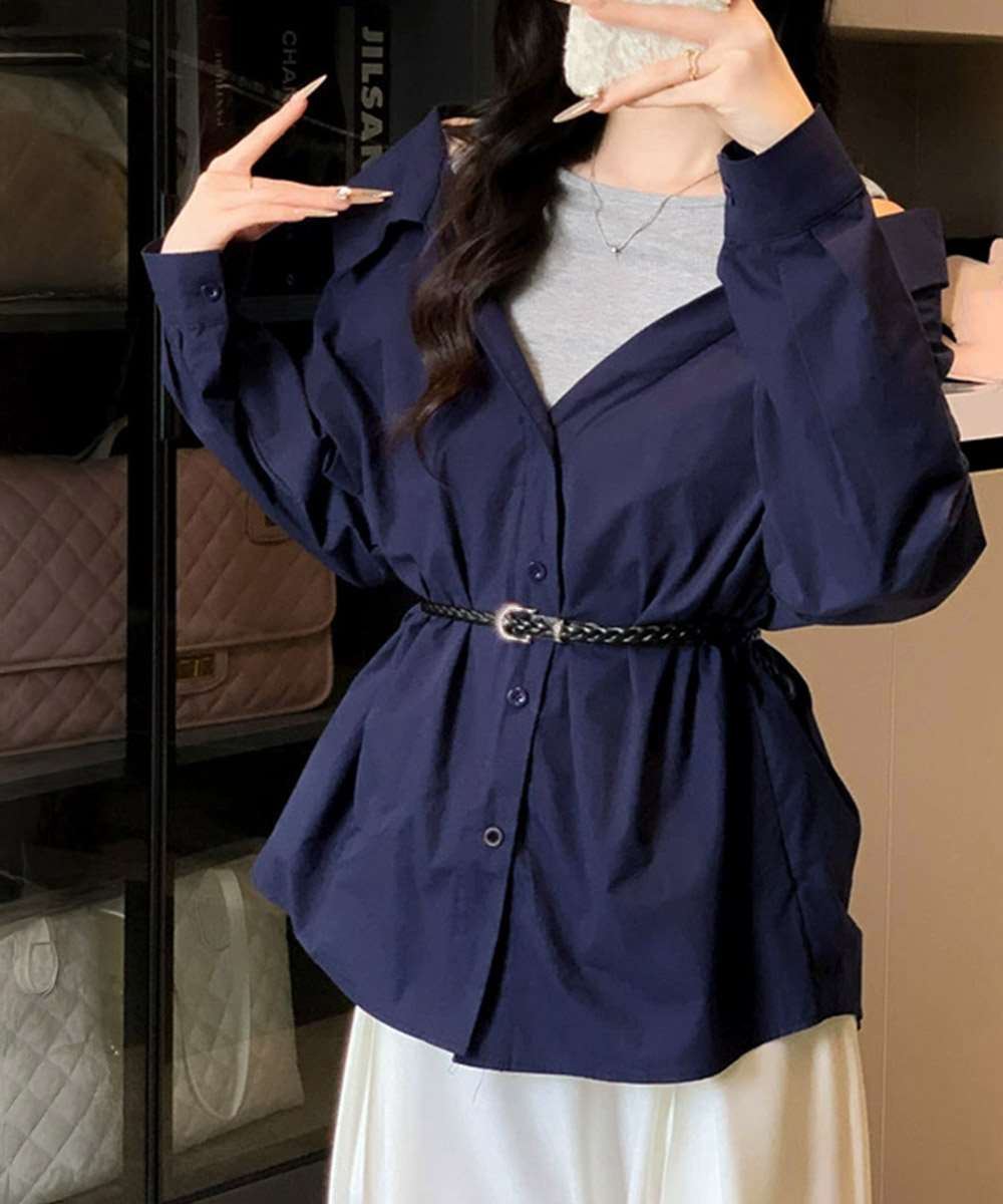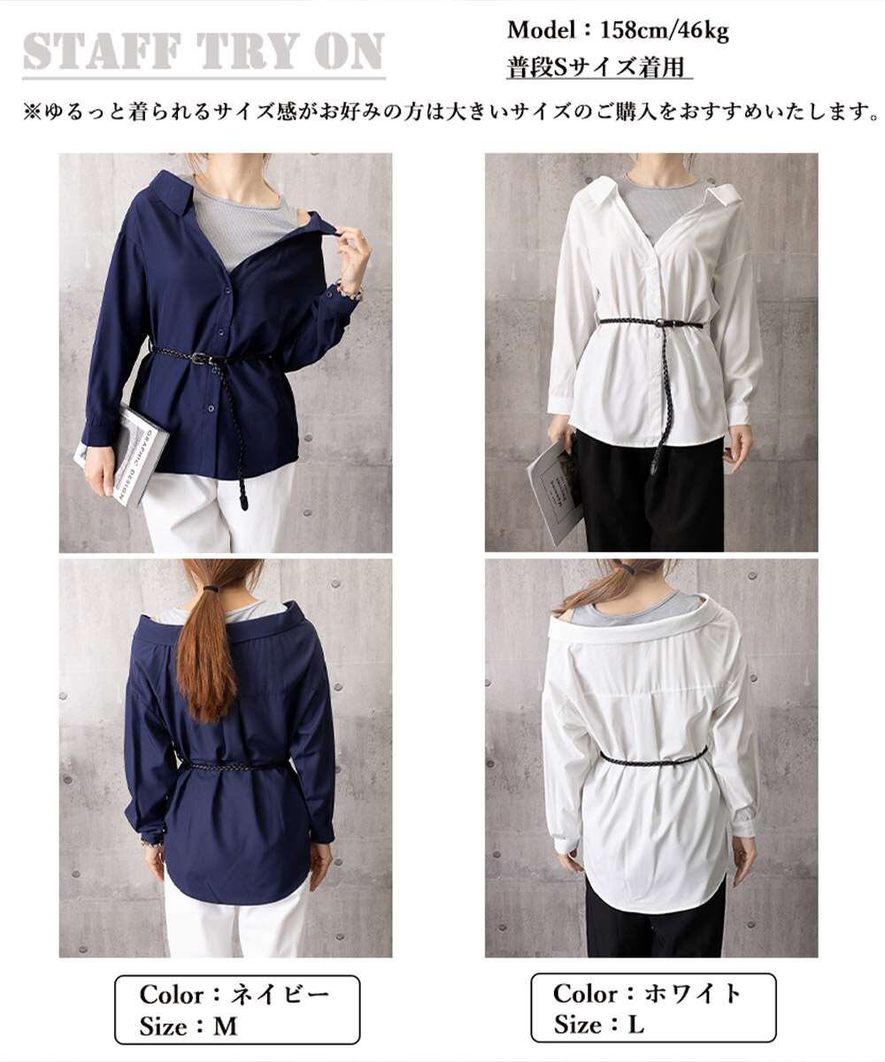 レディース ベルト付きパッチワークシャツレイヤード風 肩見せブラウス トレンドトップス 着やせ春夏服 プルオーバーシャツ