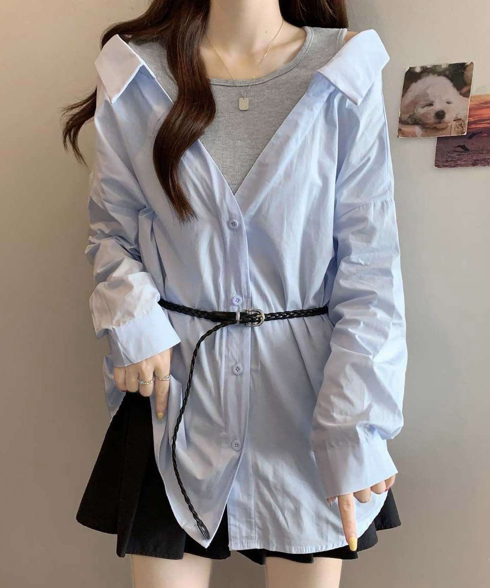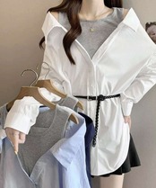 韓国風シャツ 長袖 ドッキングシャツ白 二枚重ねトップス春