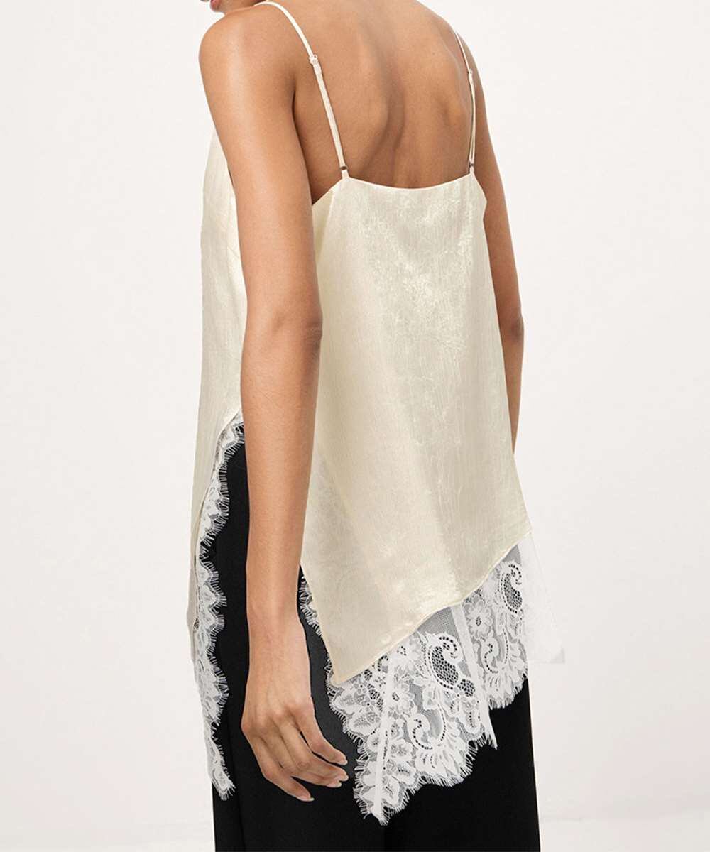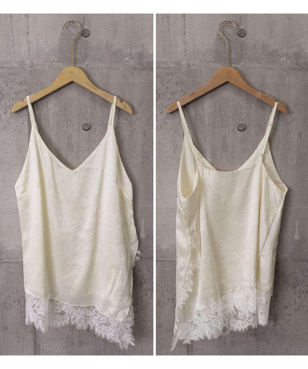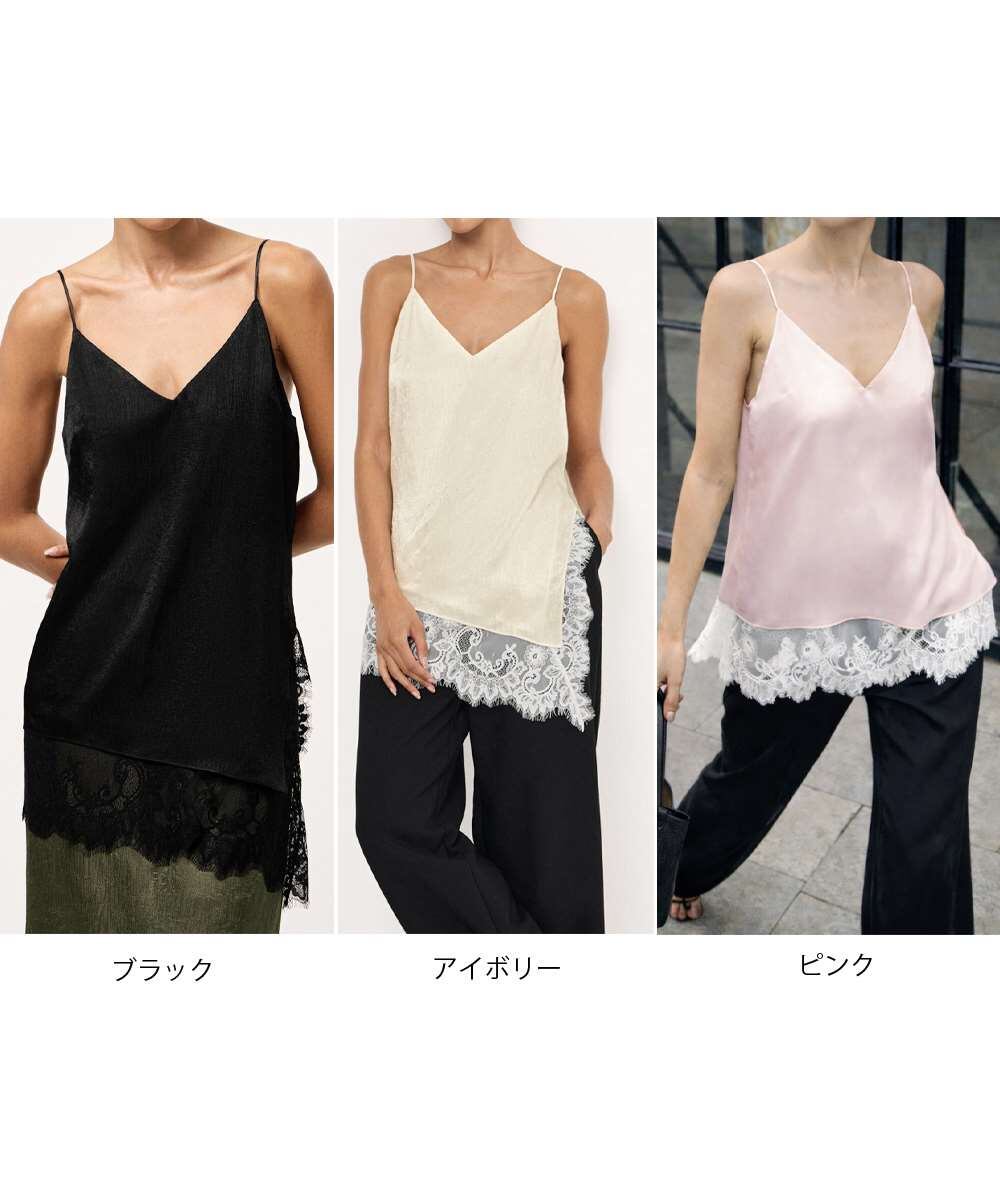 上品な微光沢のサテン調素材に、アシンメトリーレースをあしらったVネック細ストラップキャミソール。