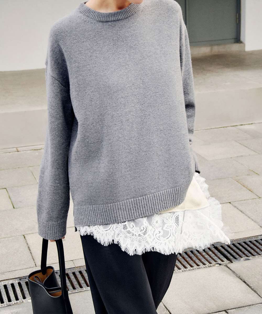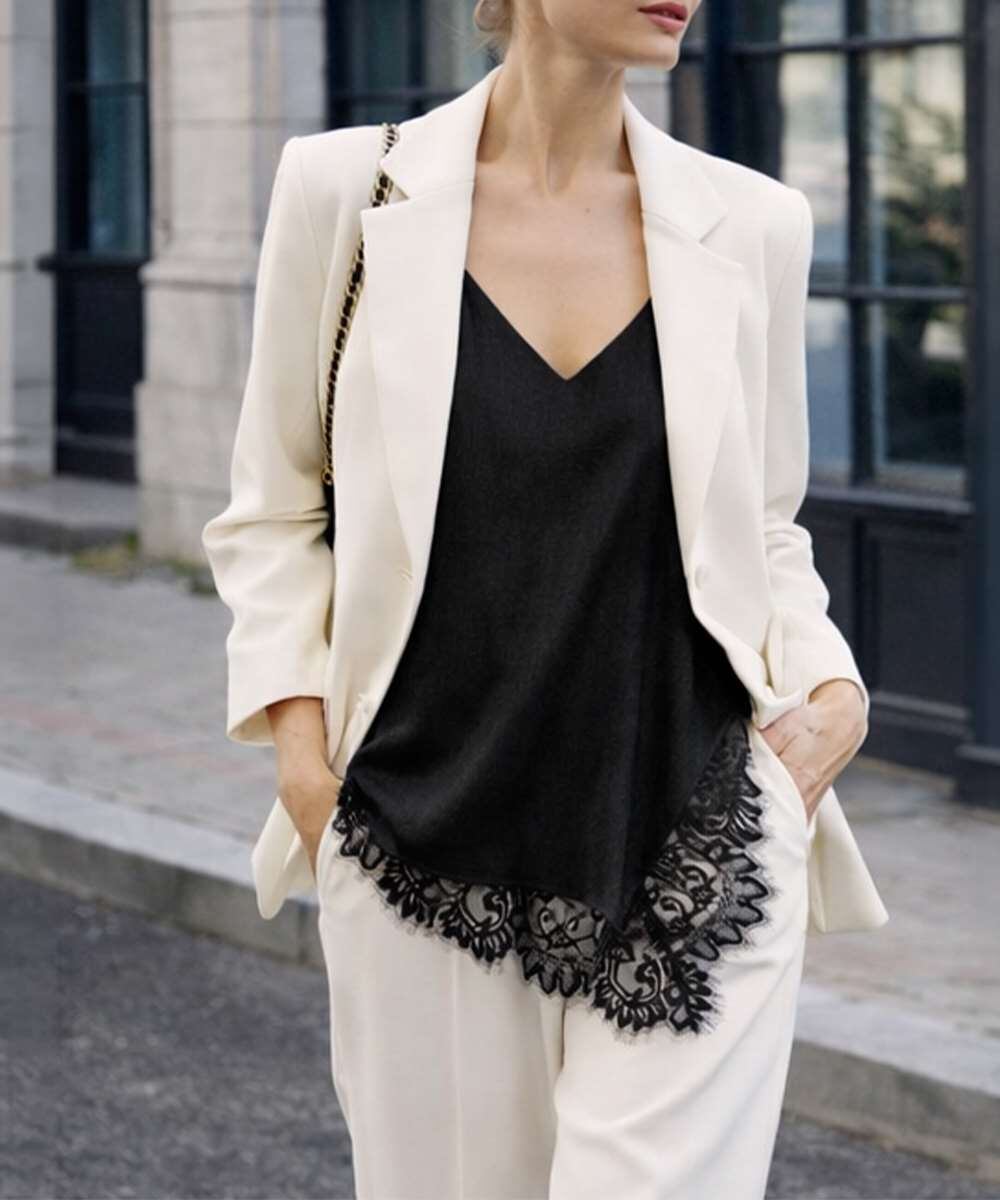 裾には存在感のあるレースを施し、甘さを抑えた大人っぽいバランス。
