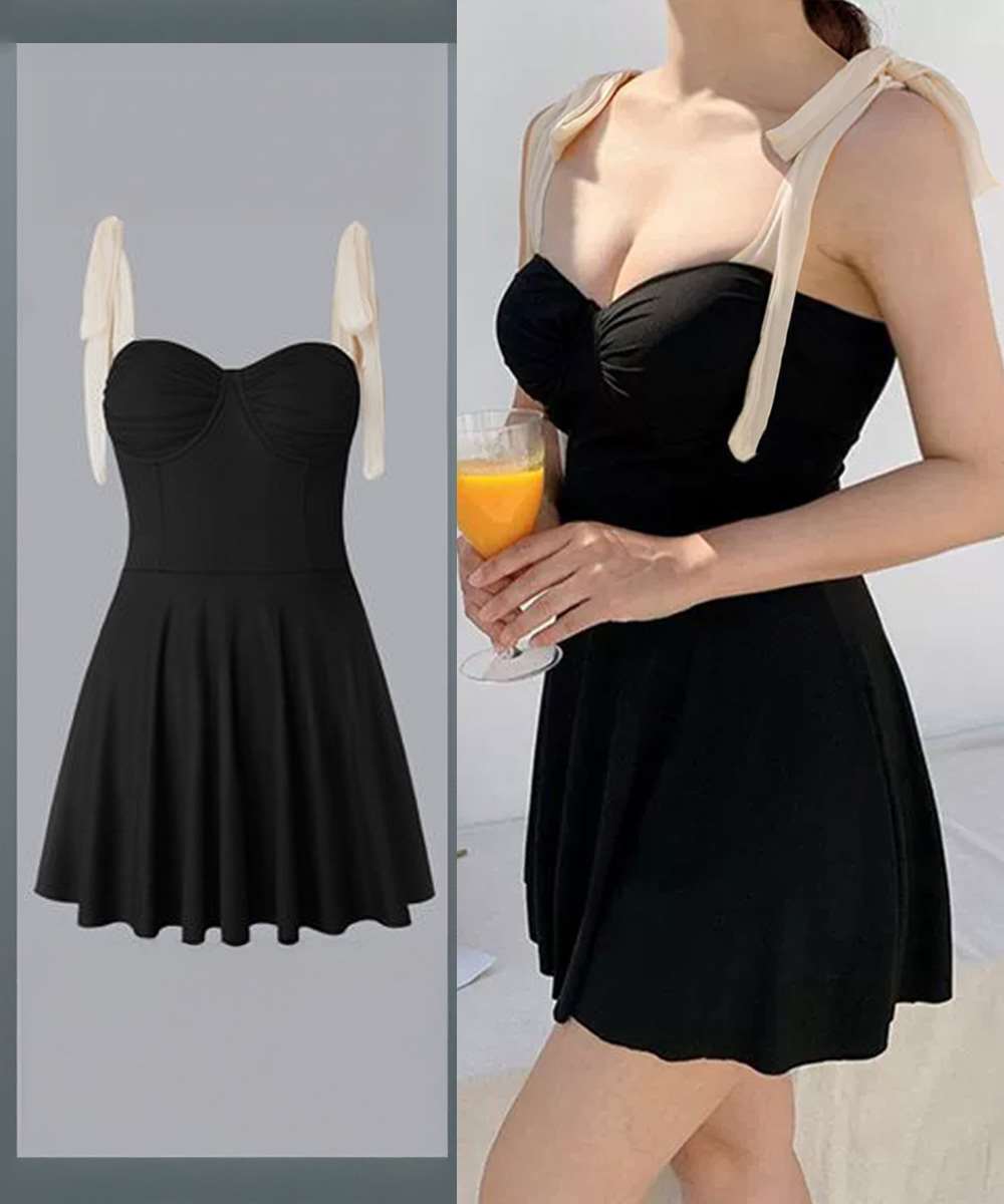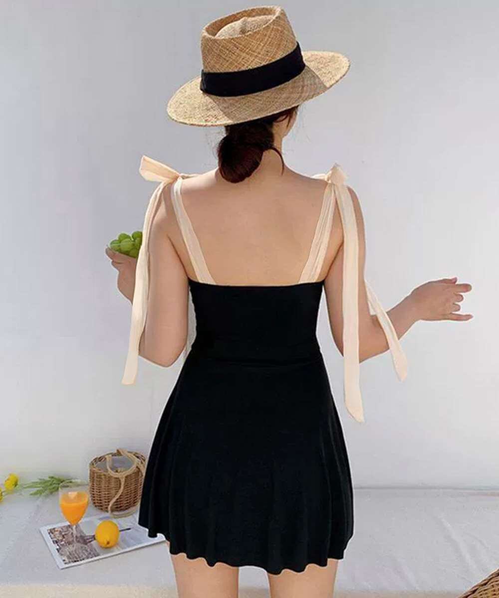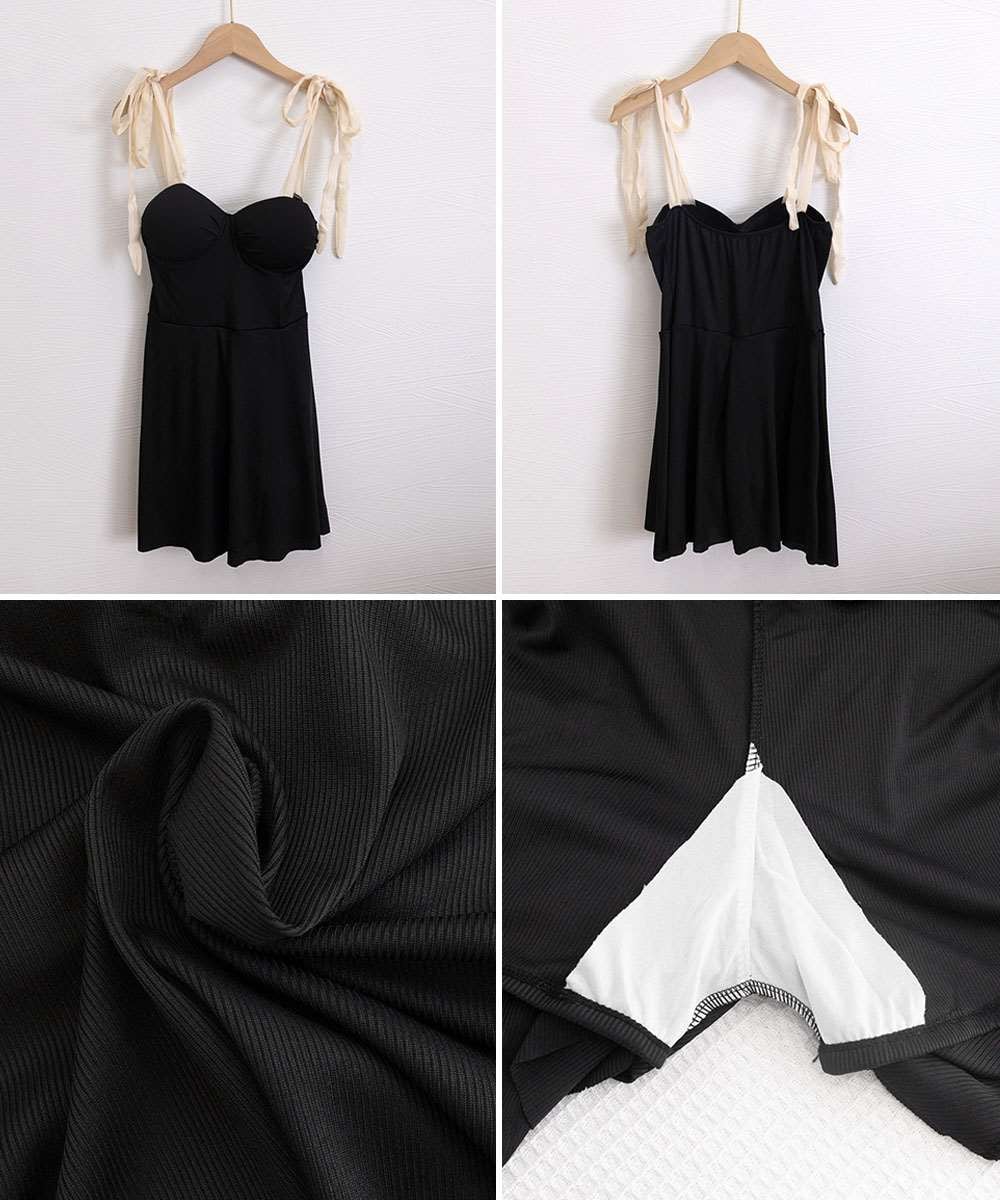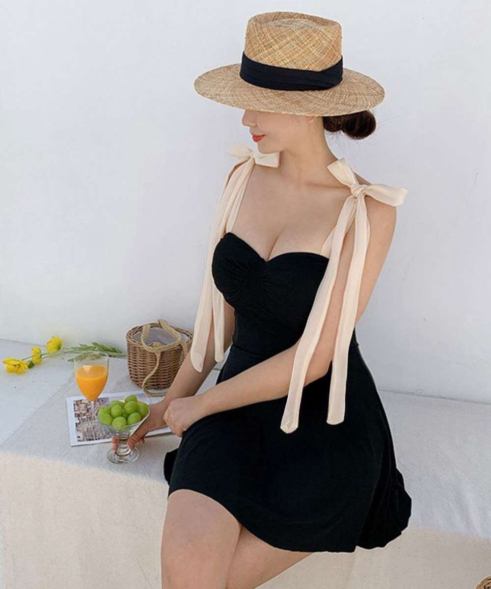 肩リボンが調節できる、大人っぽいデザインのオールインワンワンピース水着。