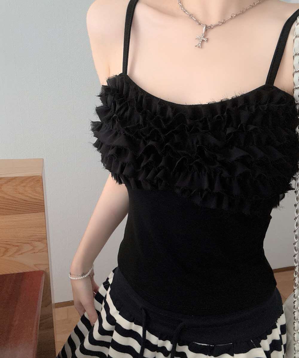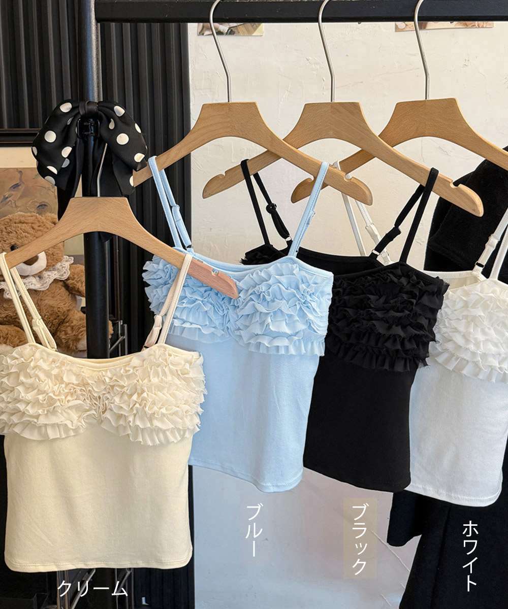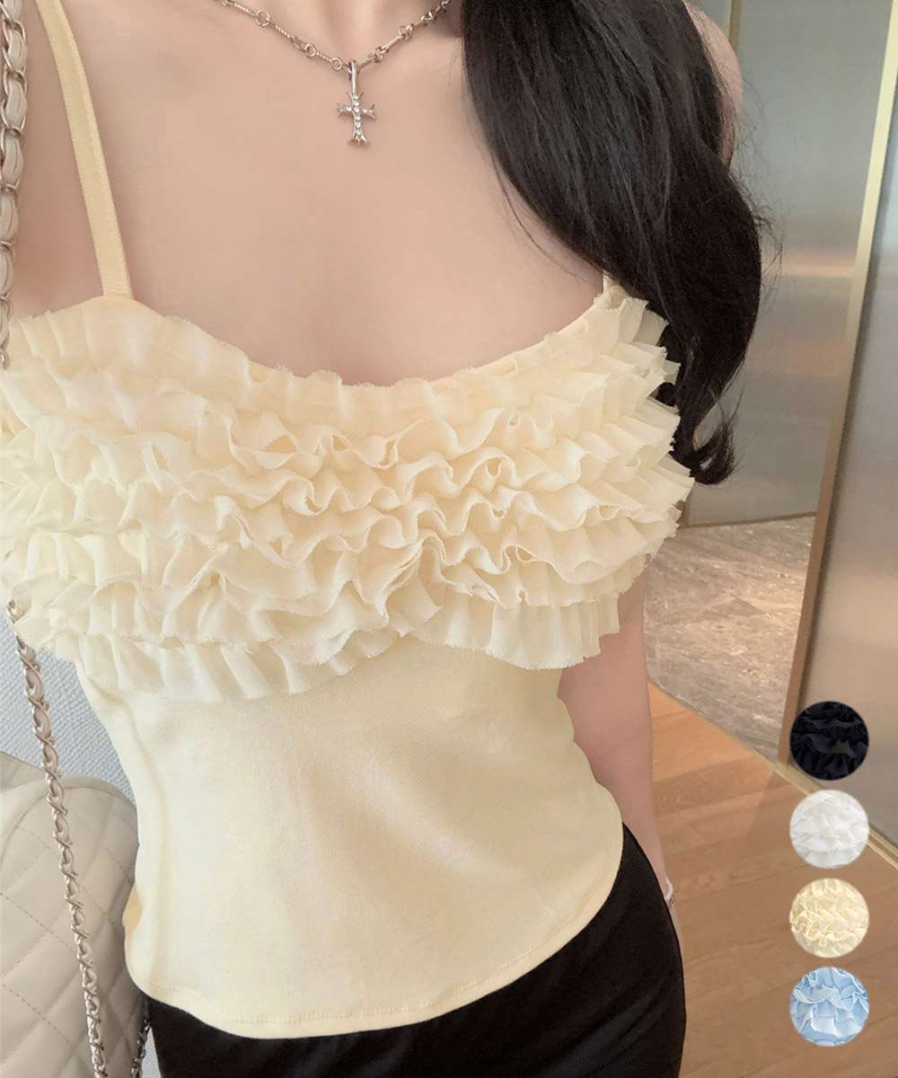 胸元のボリュームフリルが目を引く、トレンド感溢れるキャミソール。