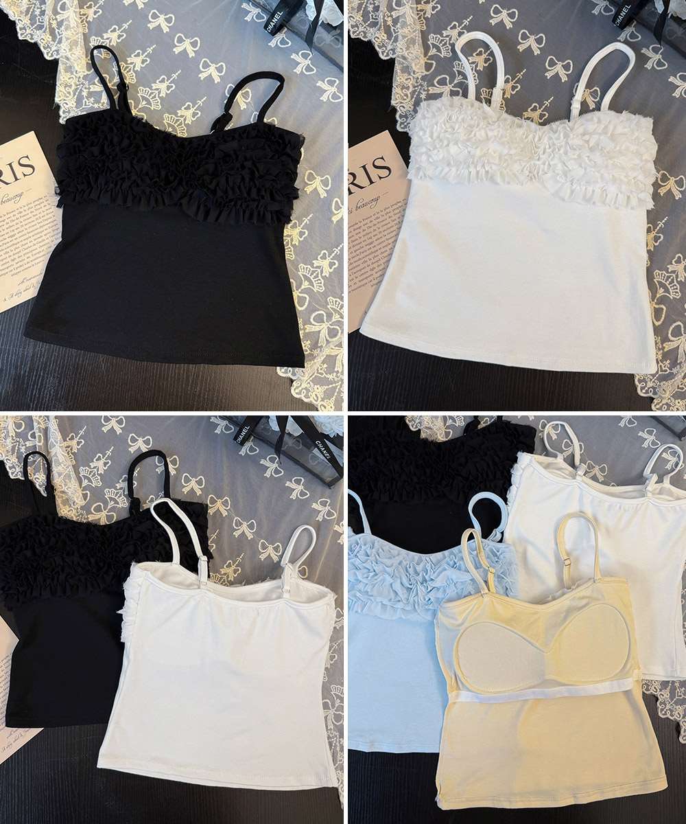レディース大人可愛いキャミインナー 美胸ブラトップ快適 韓国風薄手インナーブラ一体型 お洒落 胸元フリルインナートップス