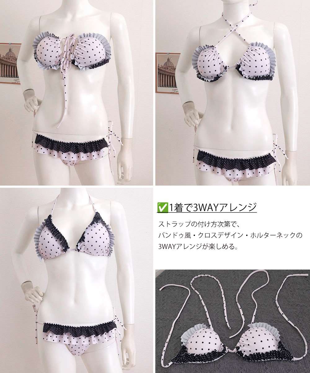 ストラップの付け方次第で、バンドゥ風・クロスデザイン・ホルターネックの3WAYアレンジが楽しめる。