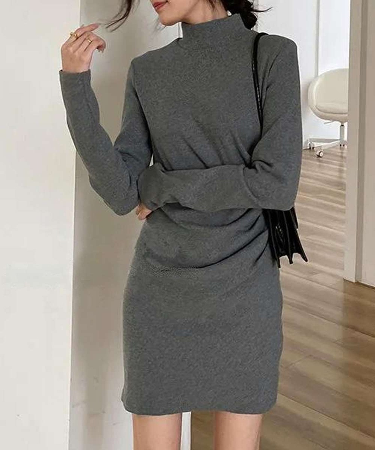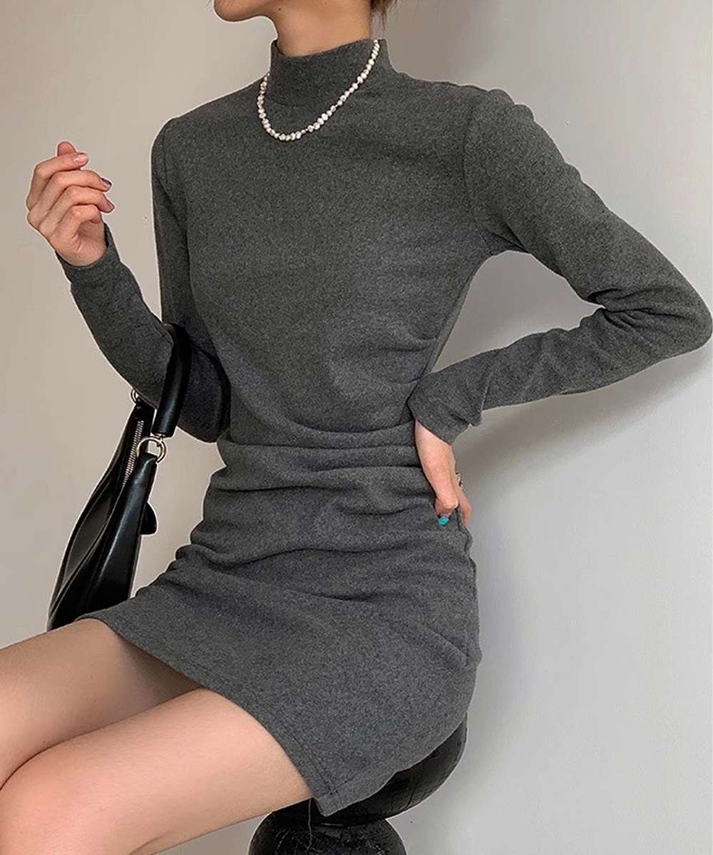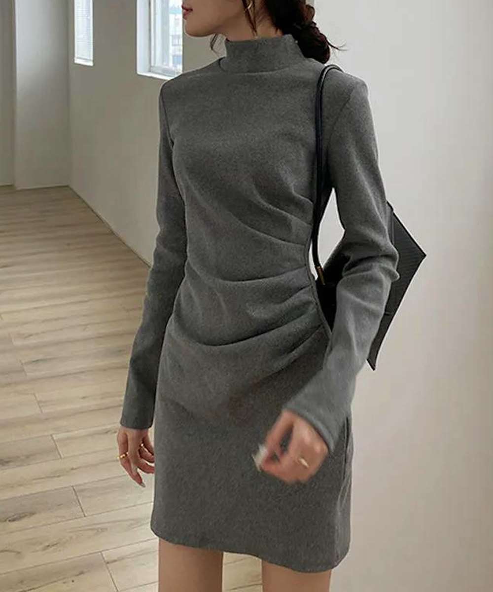 シンプルで着回し力の高い、レディースハイネックミニタイトワンピース。