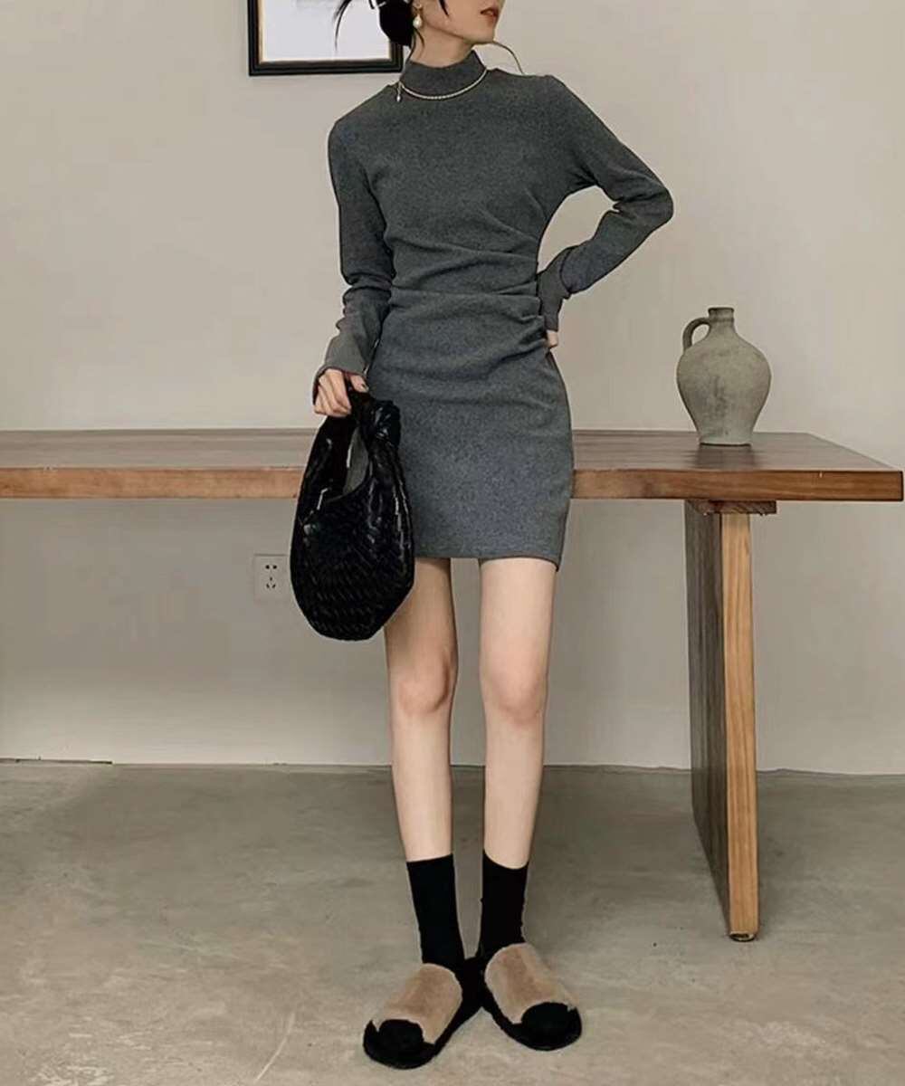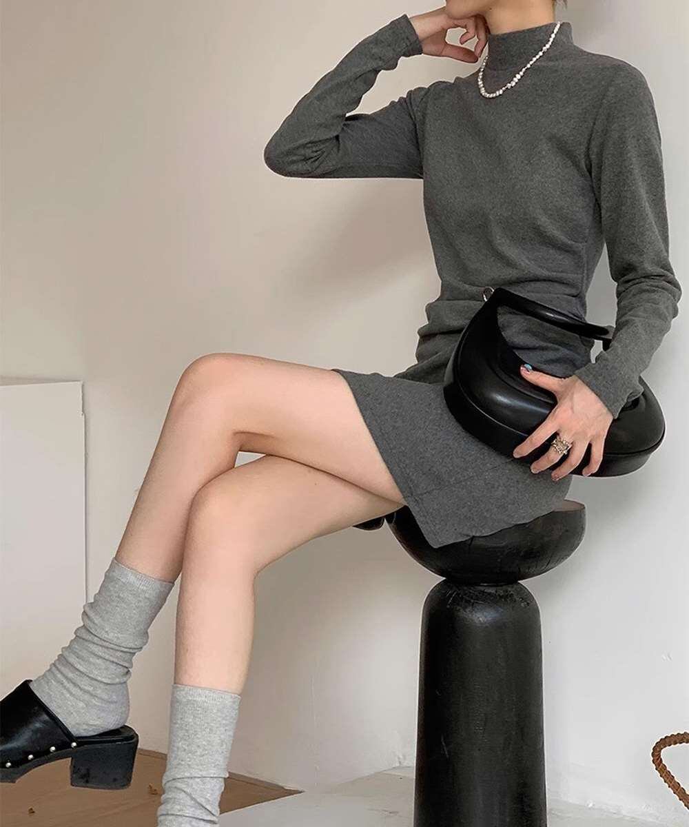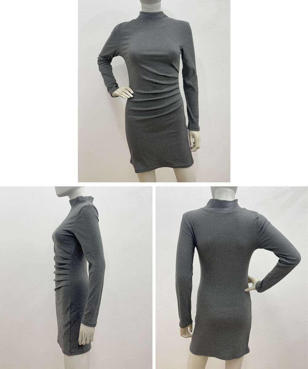 シンプルで着回し力の高い、レディースハイネックミニタイトワンピース。