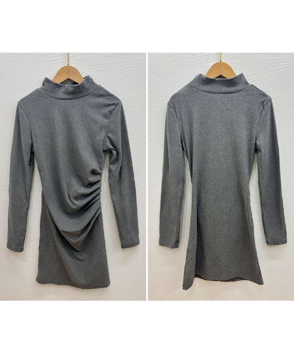 ミニ丈 ギャザー ワンピース ハイネック 韓国風