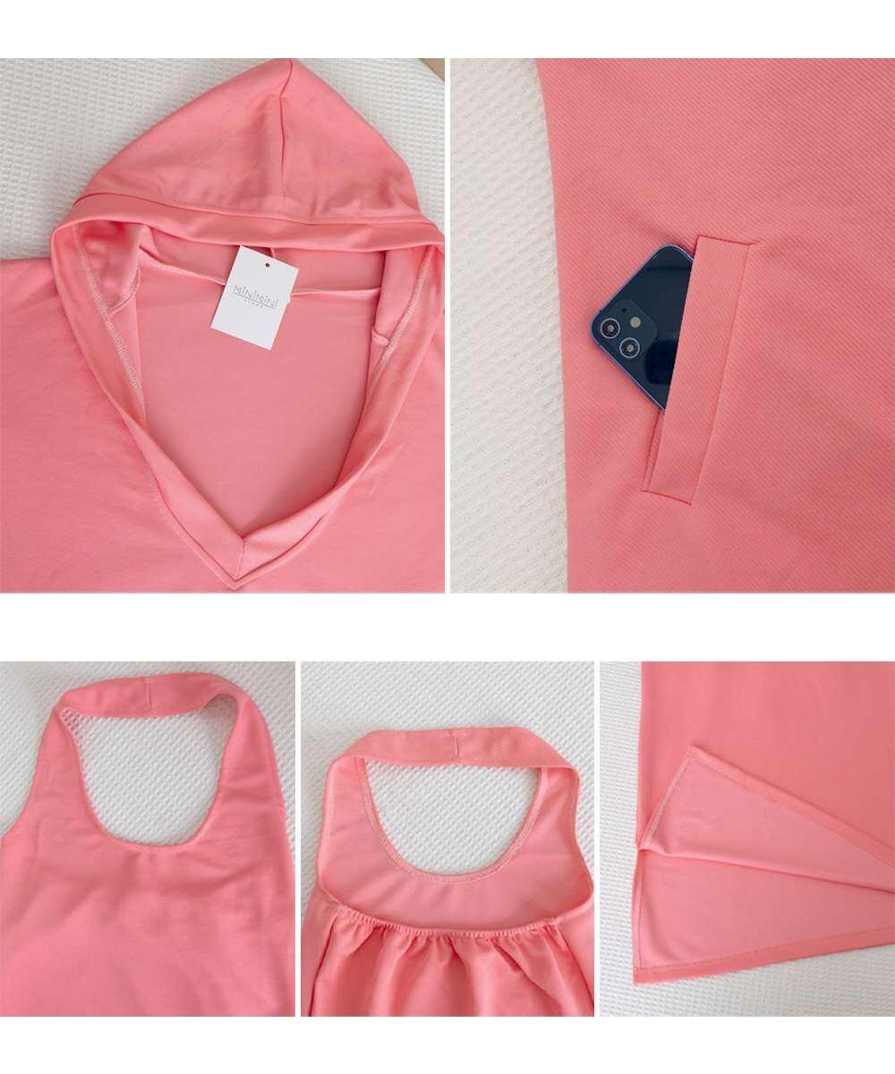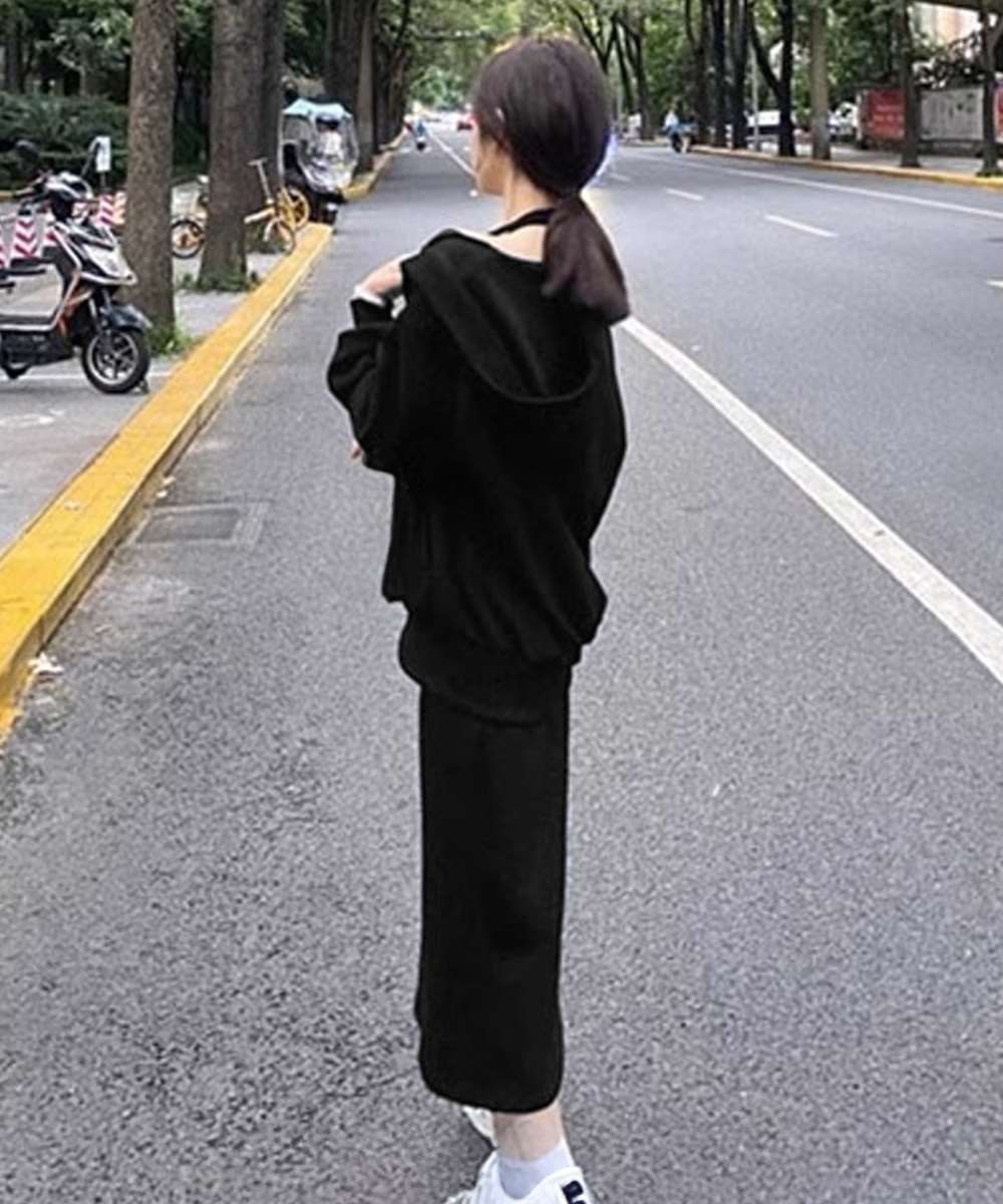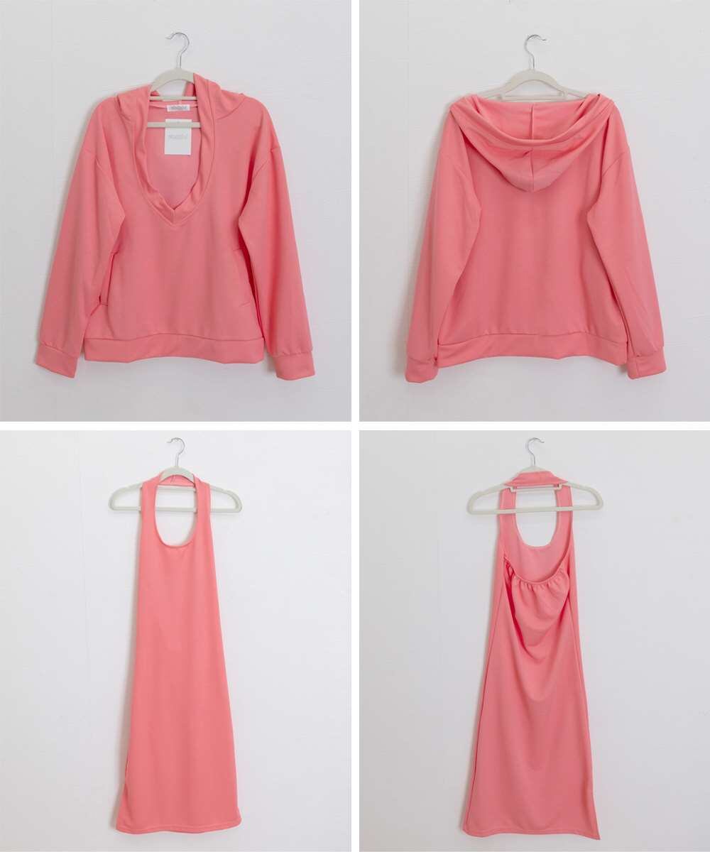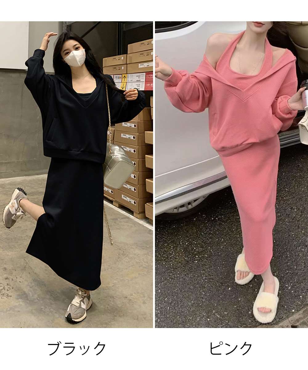 フーディー風トップスとロングワンピで大人可愛く映える上下2点セットアップ。