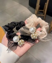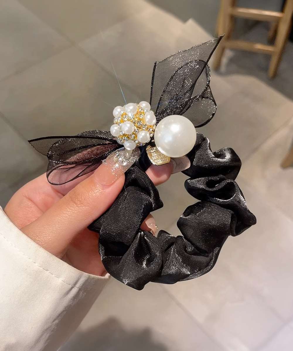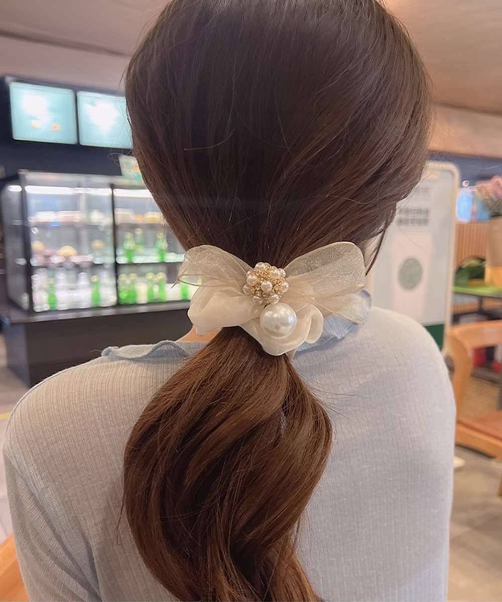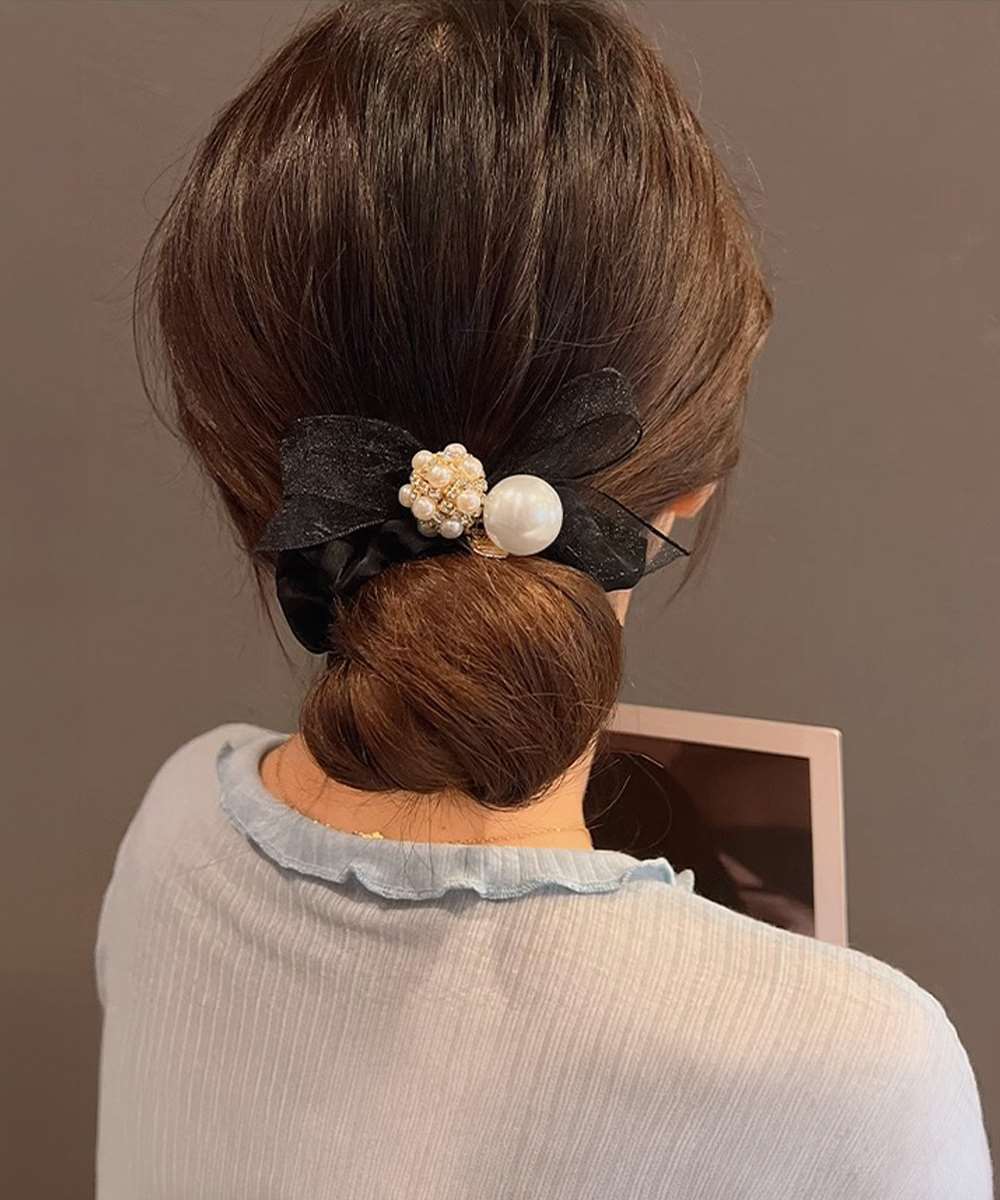 上品なリボンデザインにパールをあしらった、フェミニンな印象のシュシュ。