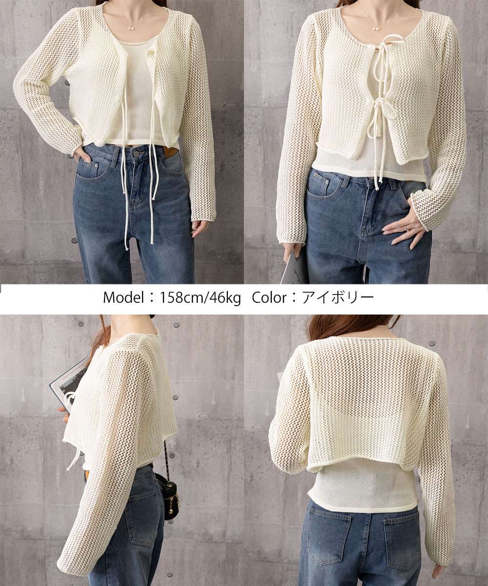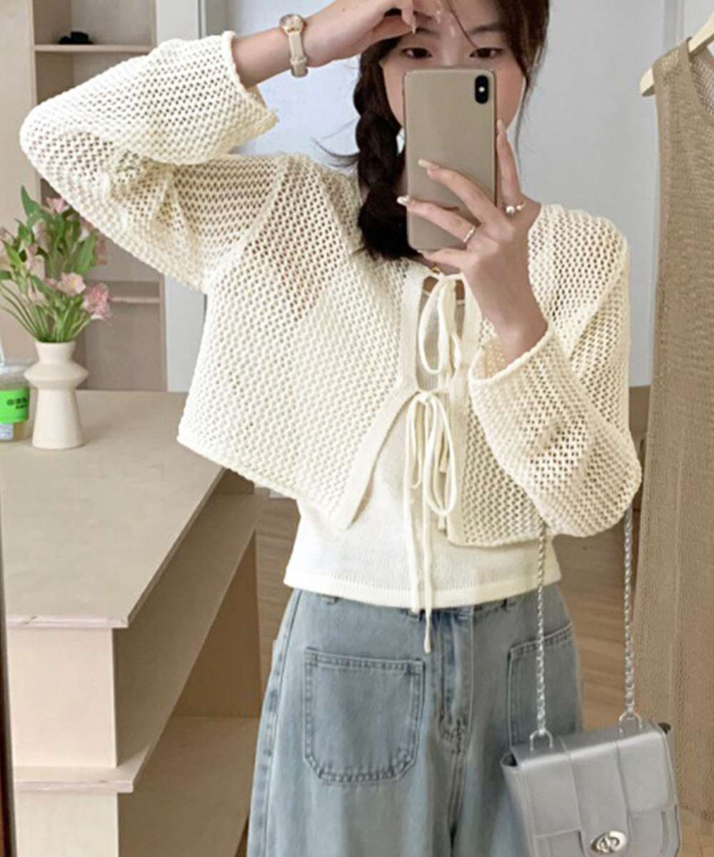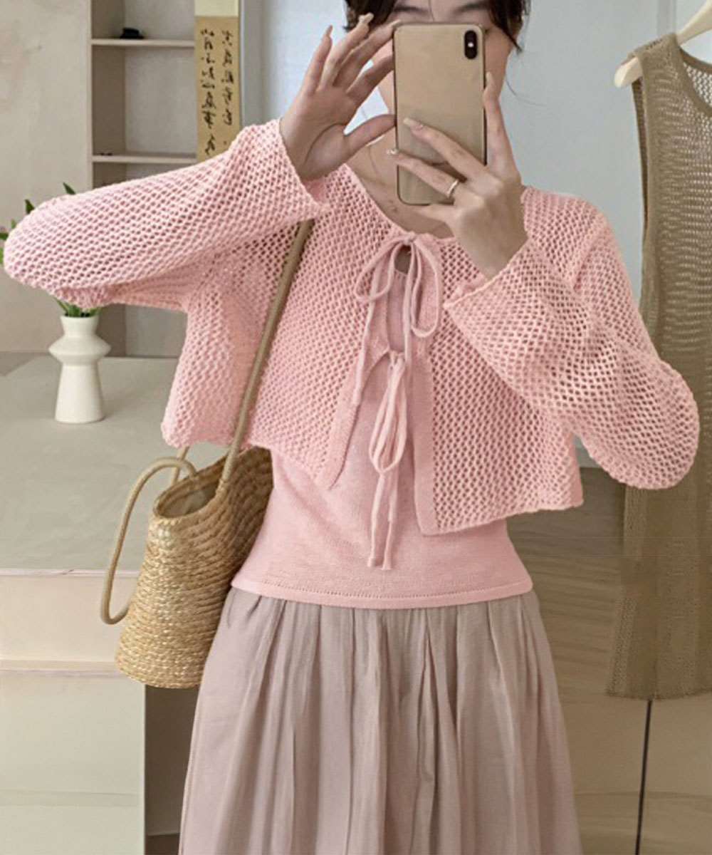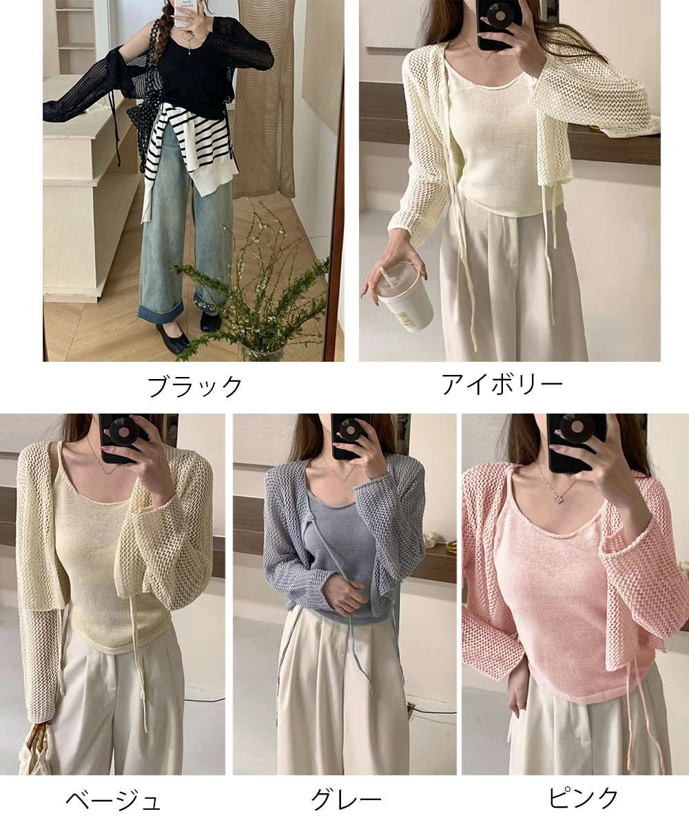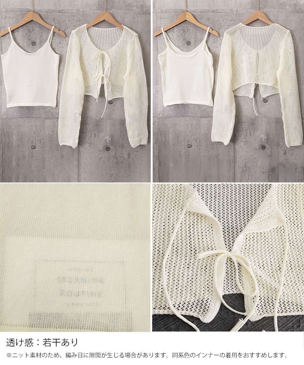 Uネックニットキャミ 透かし編みカーディガン 薄手ニットアンサンブル リボンカーディガン 長袖ニット着回し春夏服 韓国風