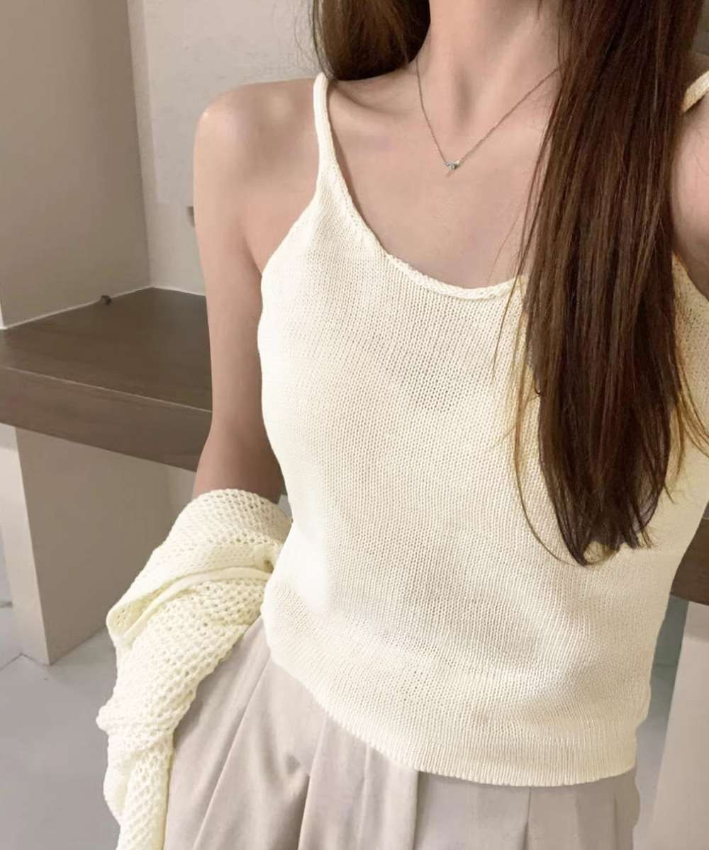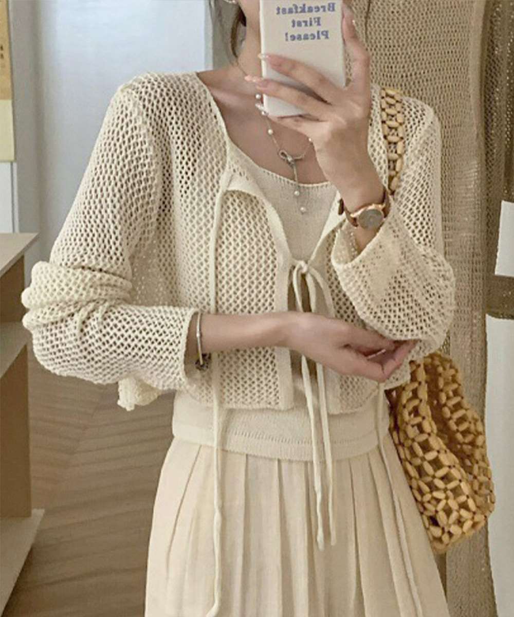 軽やかなメッシュ素材のカーディガンとシンプルなキャミソールのレイヤードで、抜け感のあるフェミニンスタイルに仕上がる。