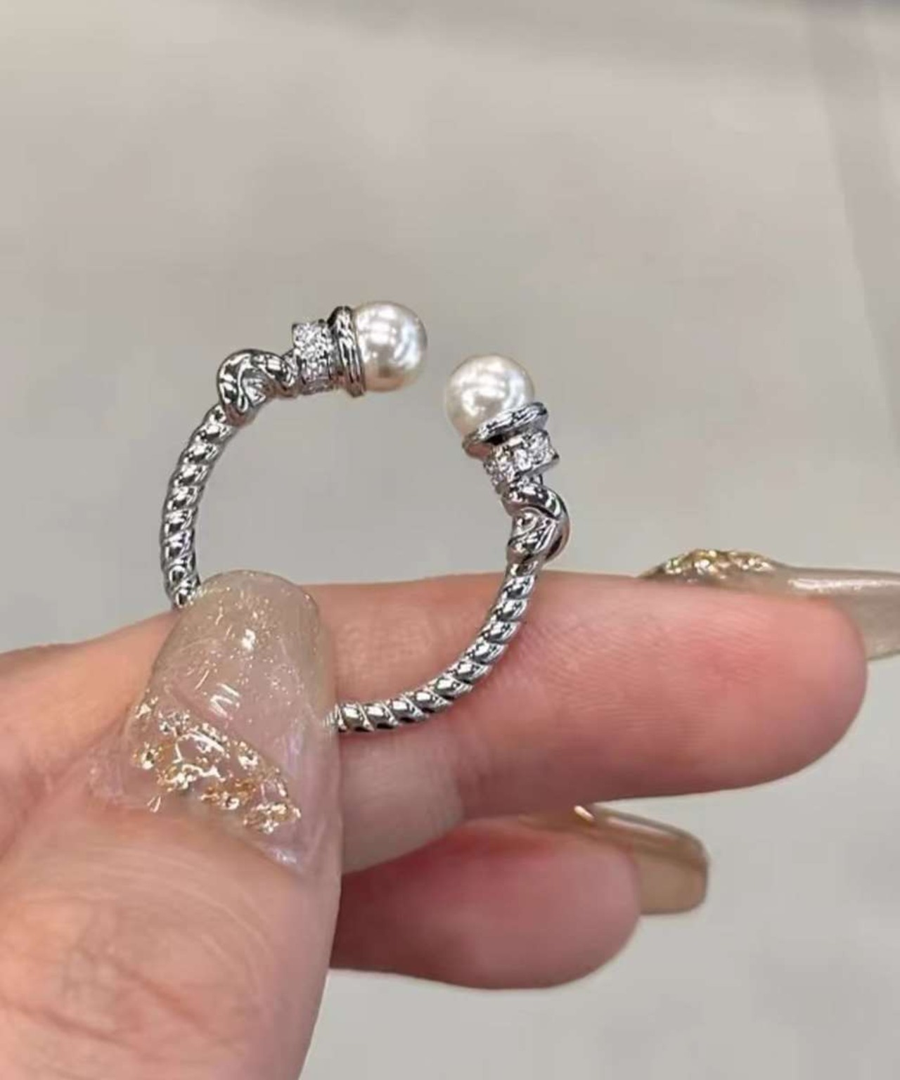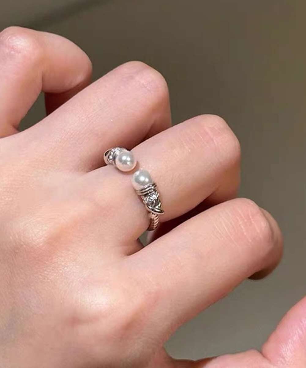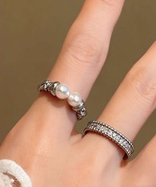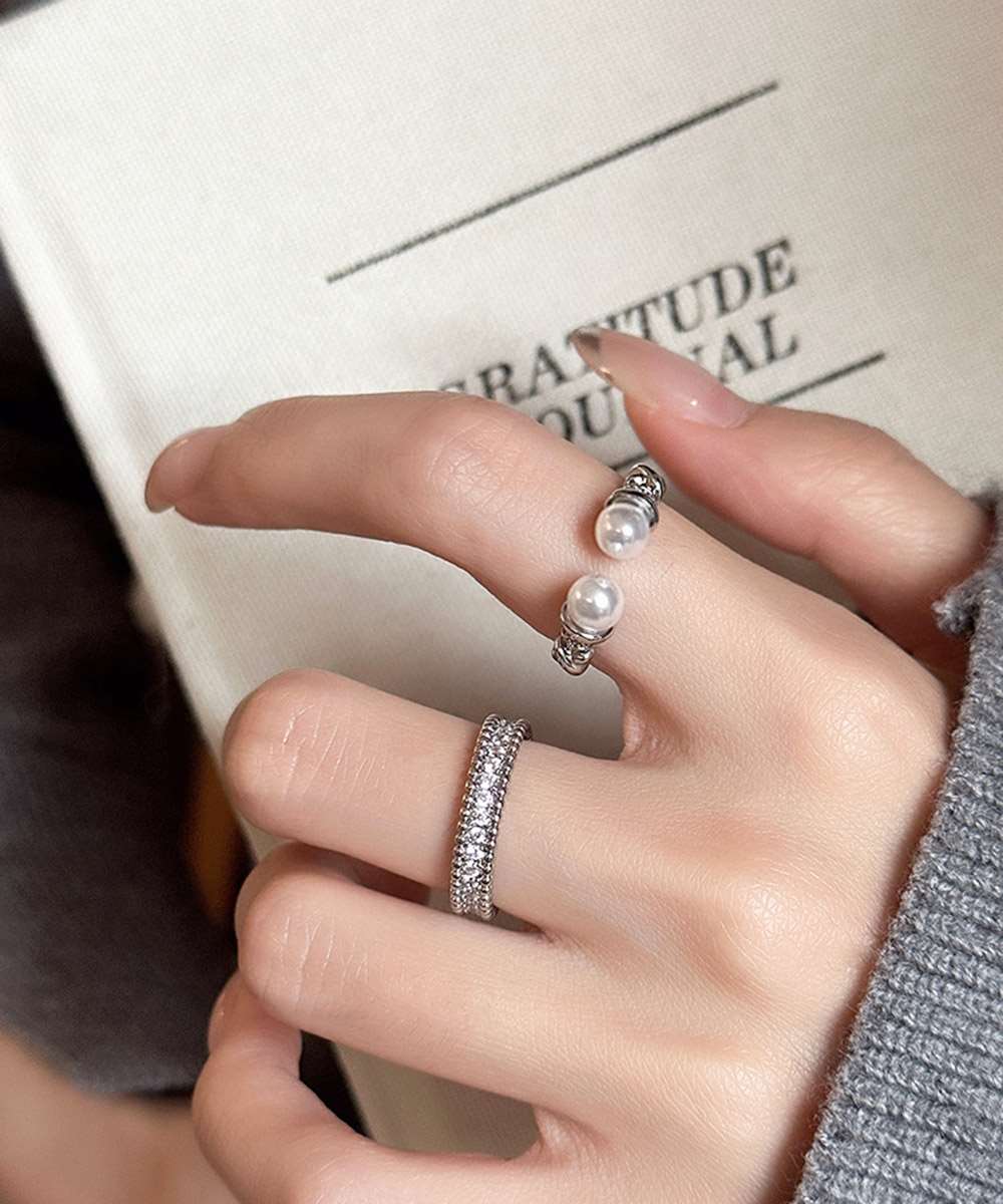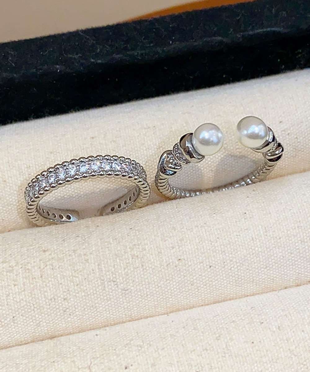 上品なパールときらめくストーンが魅力の、2点セットのオープンリング。