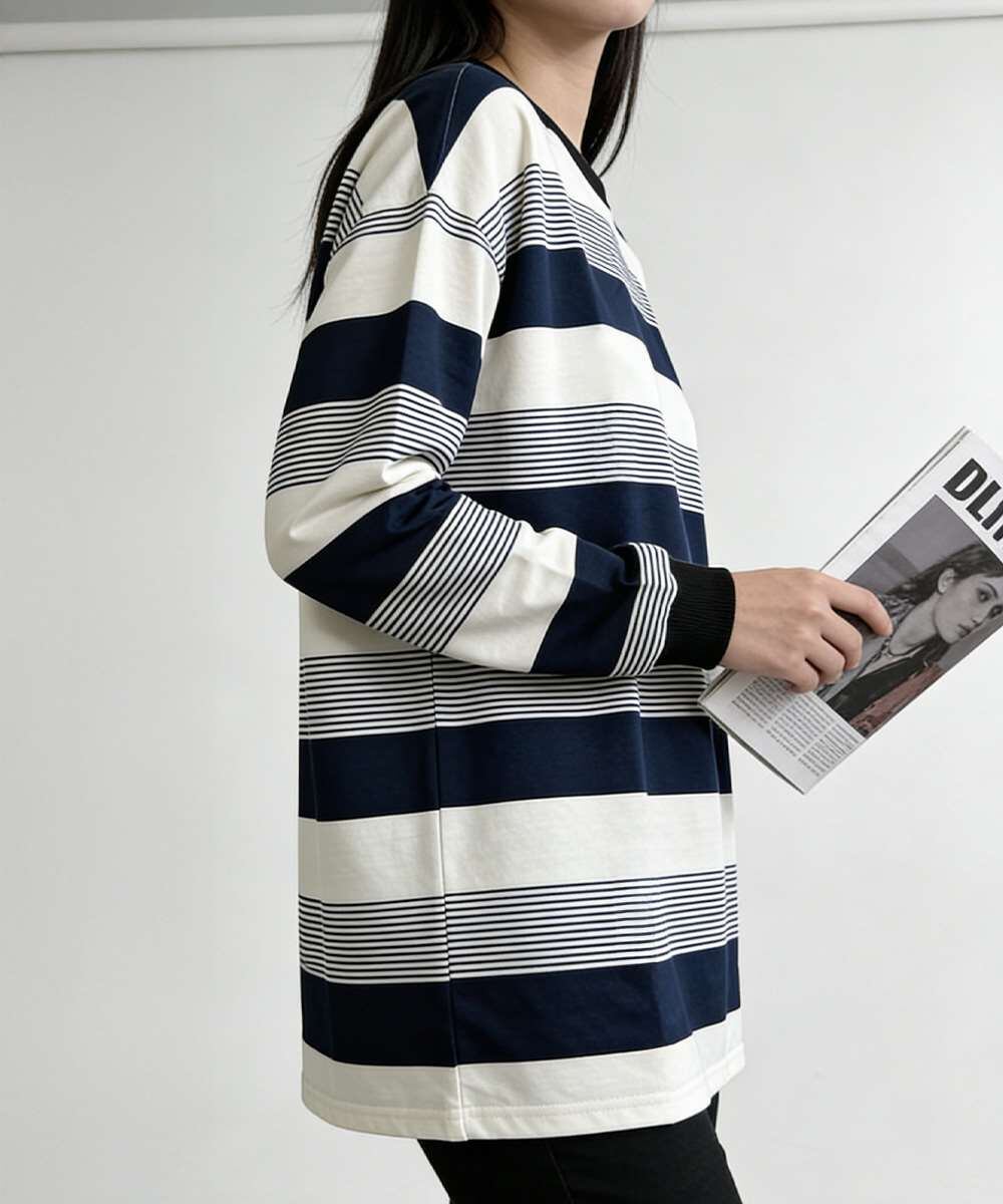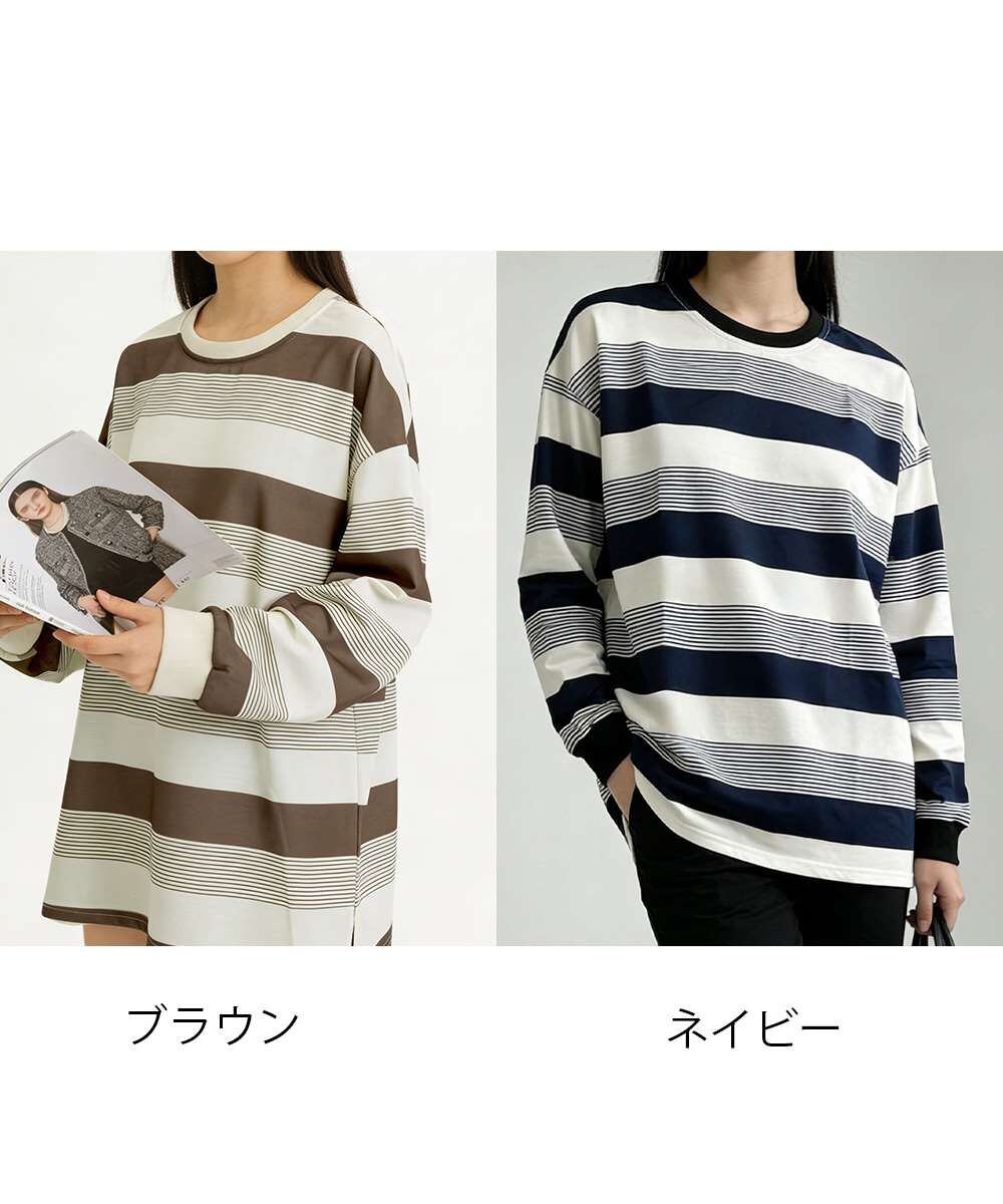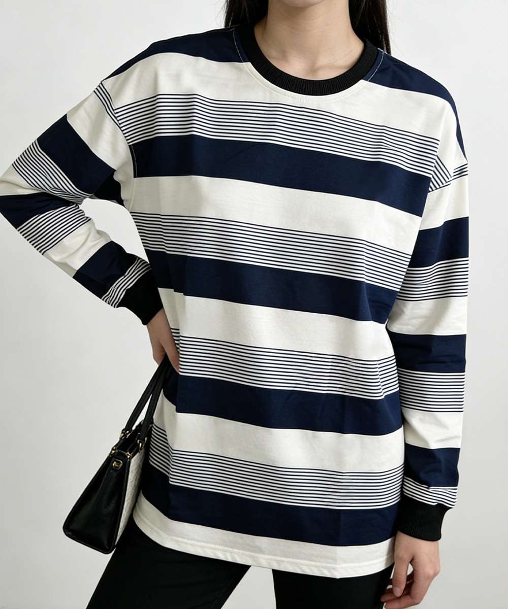 旬のオーバーサイズで、ゆったりとしたこなれ感のあるボーダー柄ロングスリーブTシャツ。