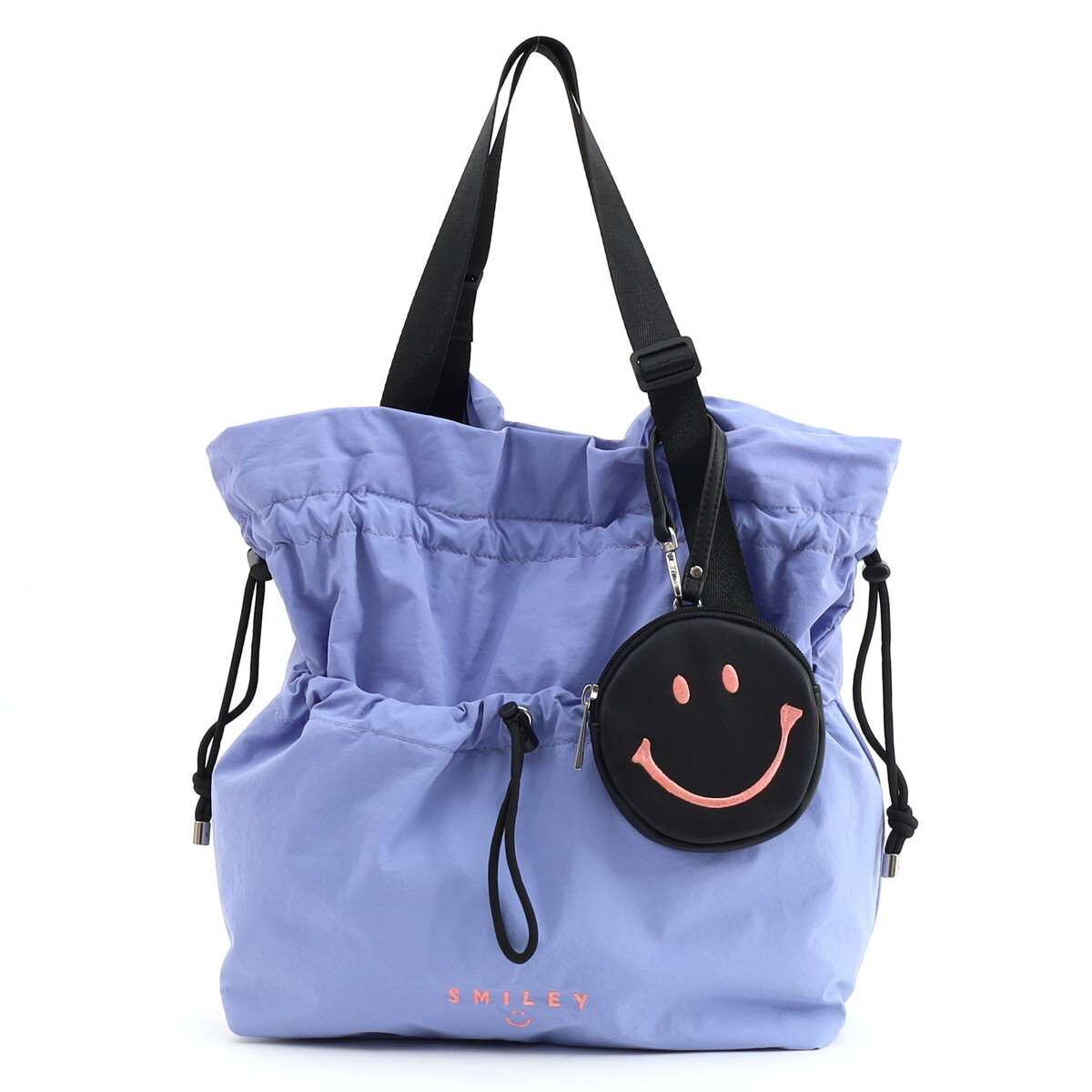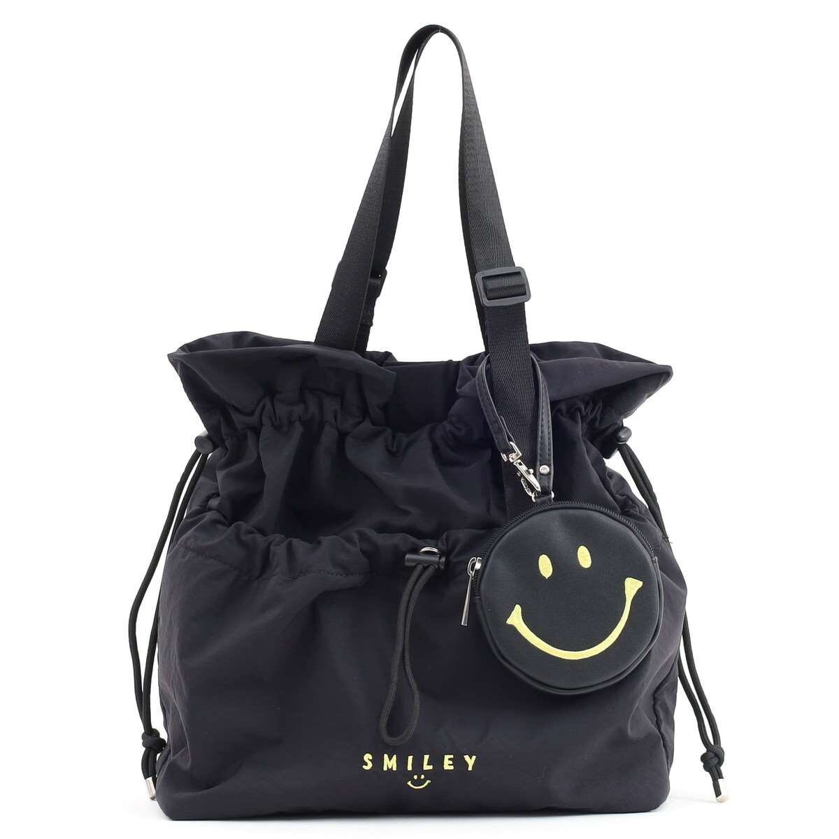 「SMILEY」という文字が繊細なビーズワークのコントラストが特徴的なトートバッグ