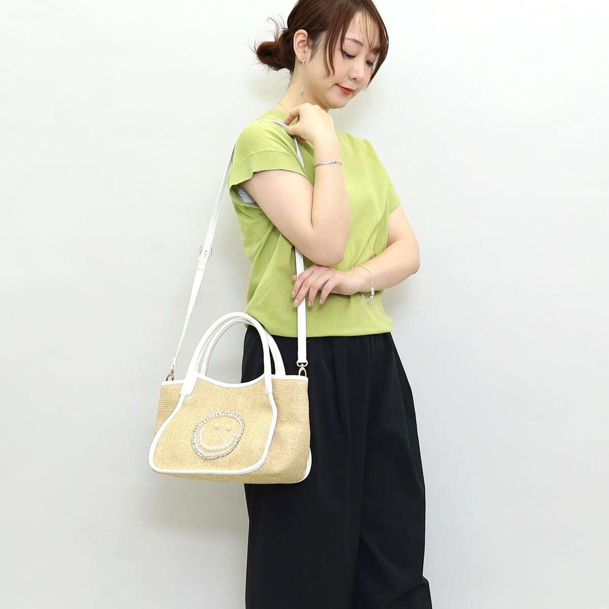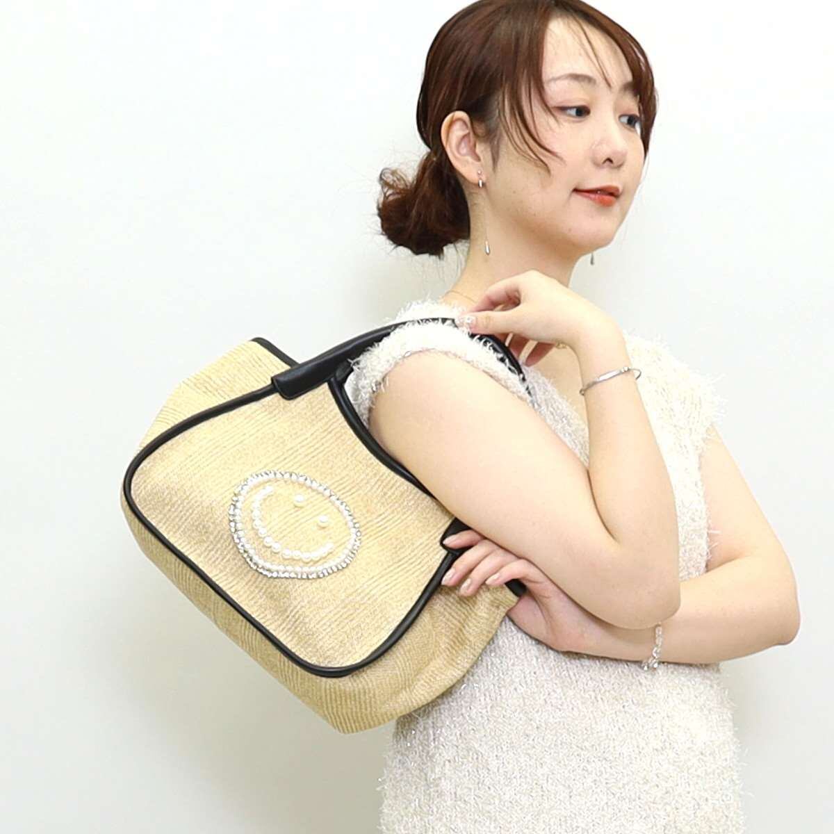 きらりと光るビジューとパールのSMILEYが目を引くトートバッグ