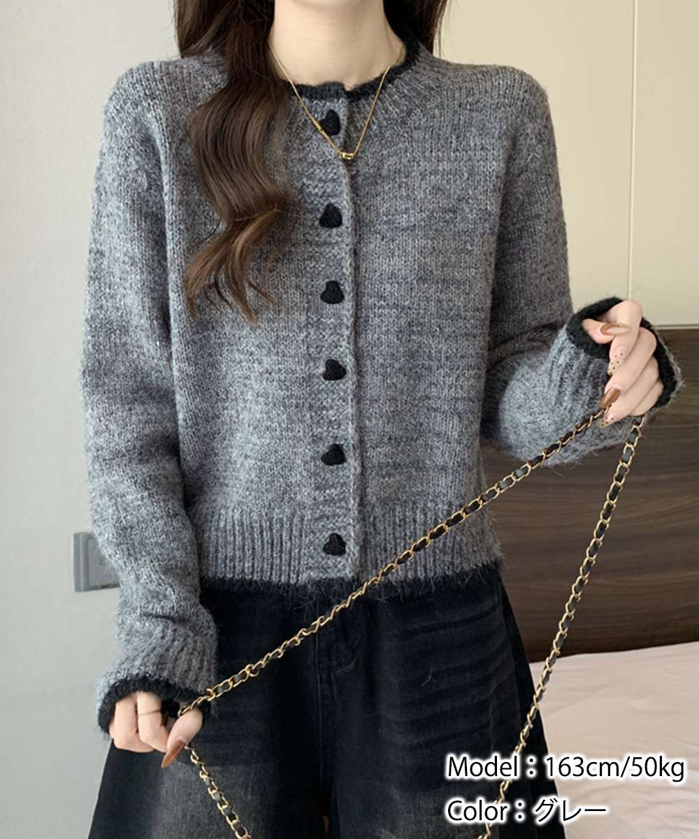 ハートモチーフのボタンが目を引く、フェミニンなニットカーディガン。
