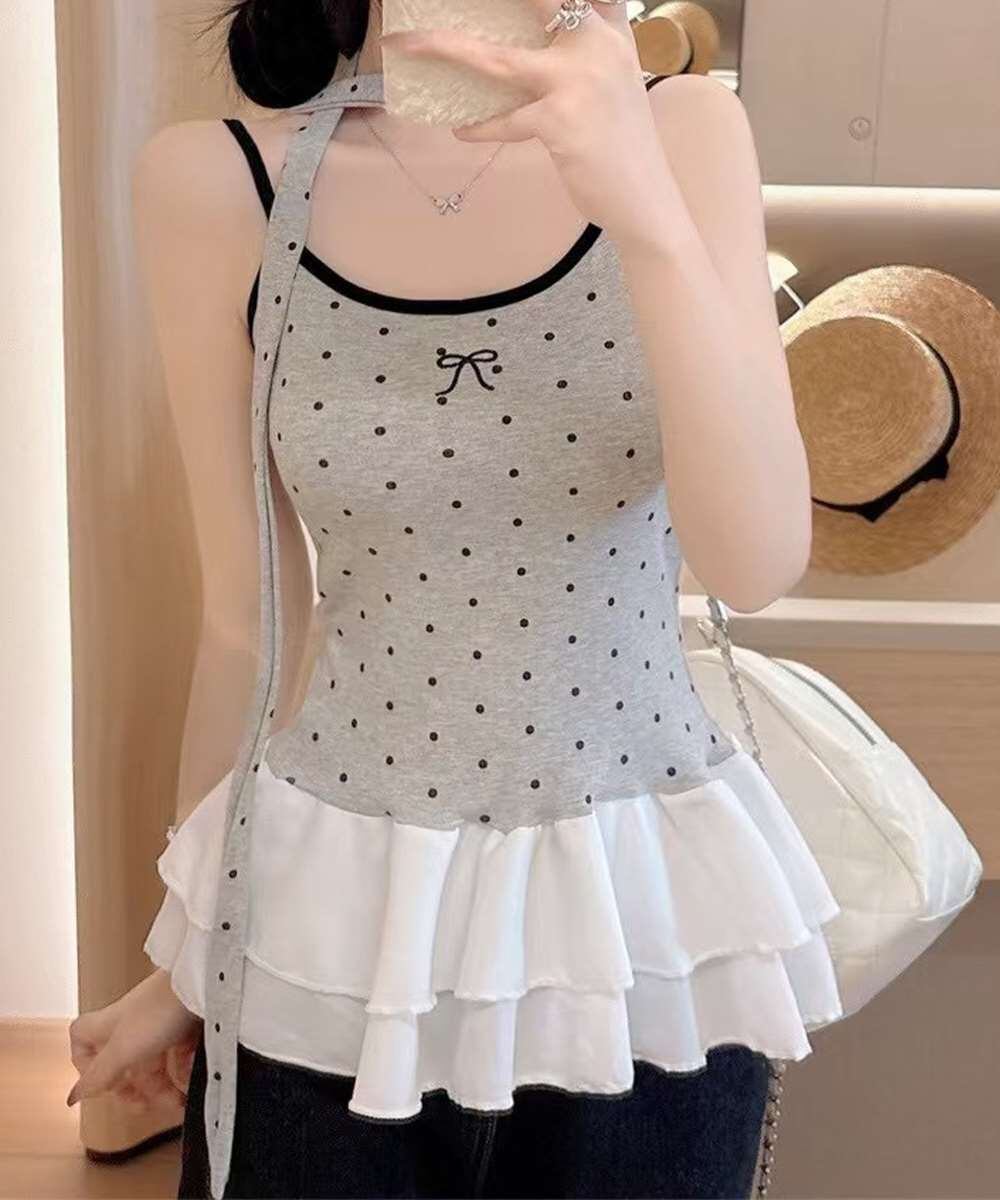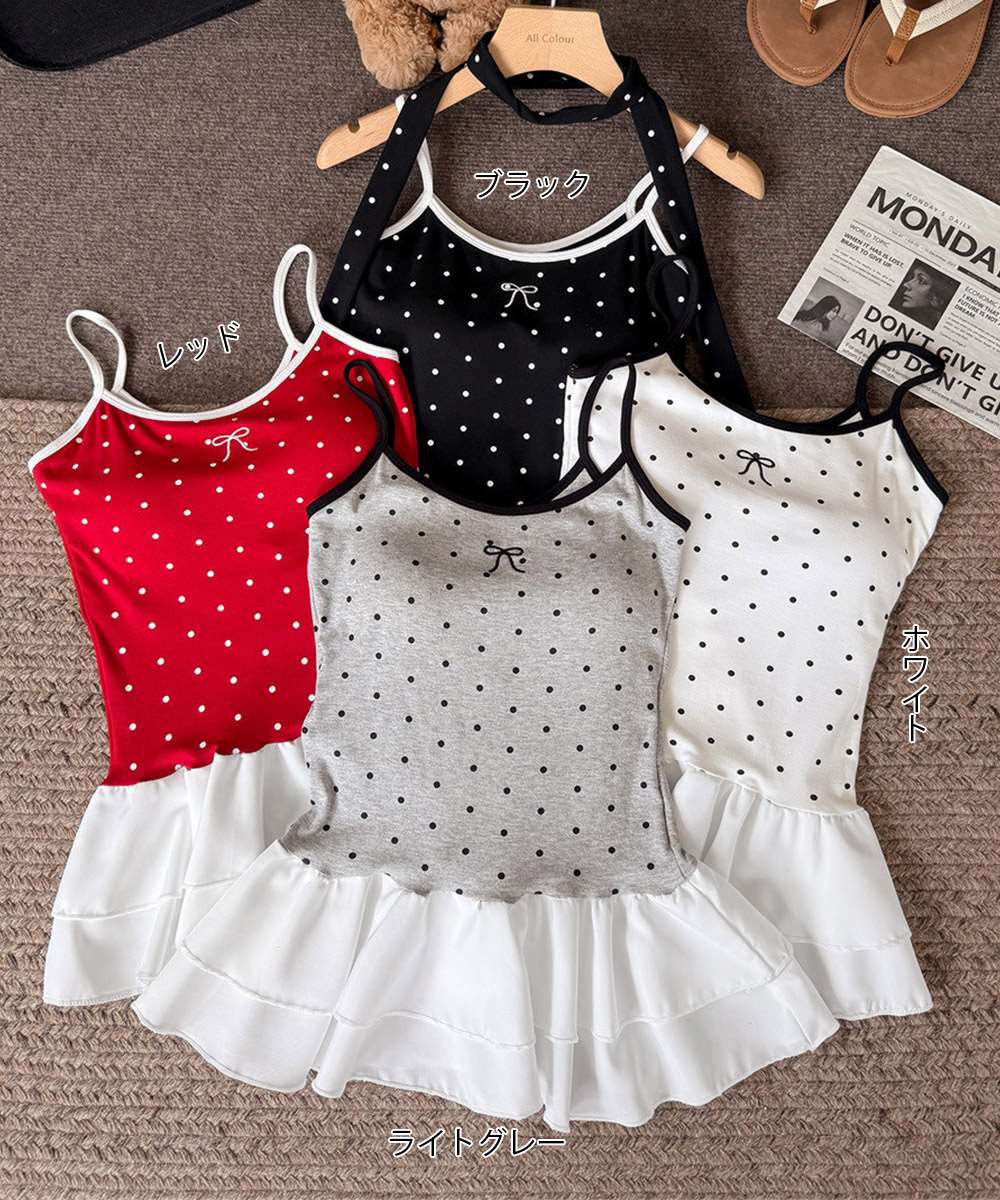 ドット柄×ネックリボンが目を引く、フリルティアードのキャミソール。