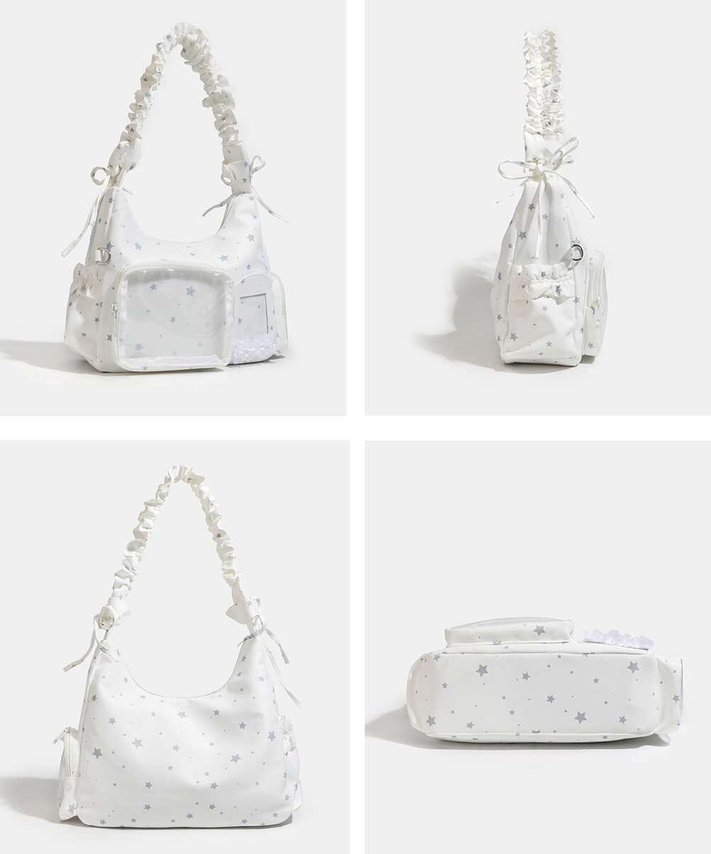フリルを施したギャザーハンドルが目を引く、可愛い星柄ショルダーバッグ。