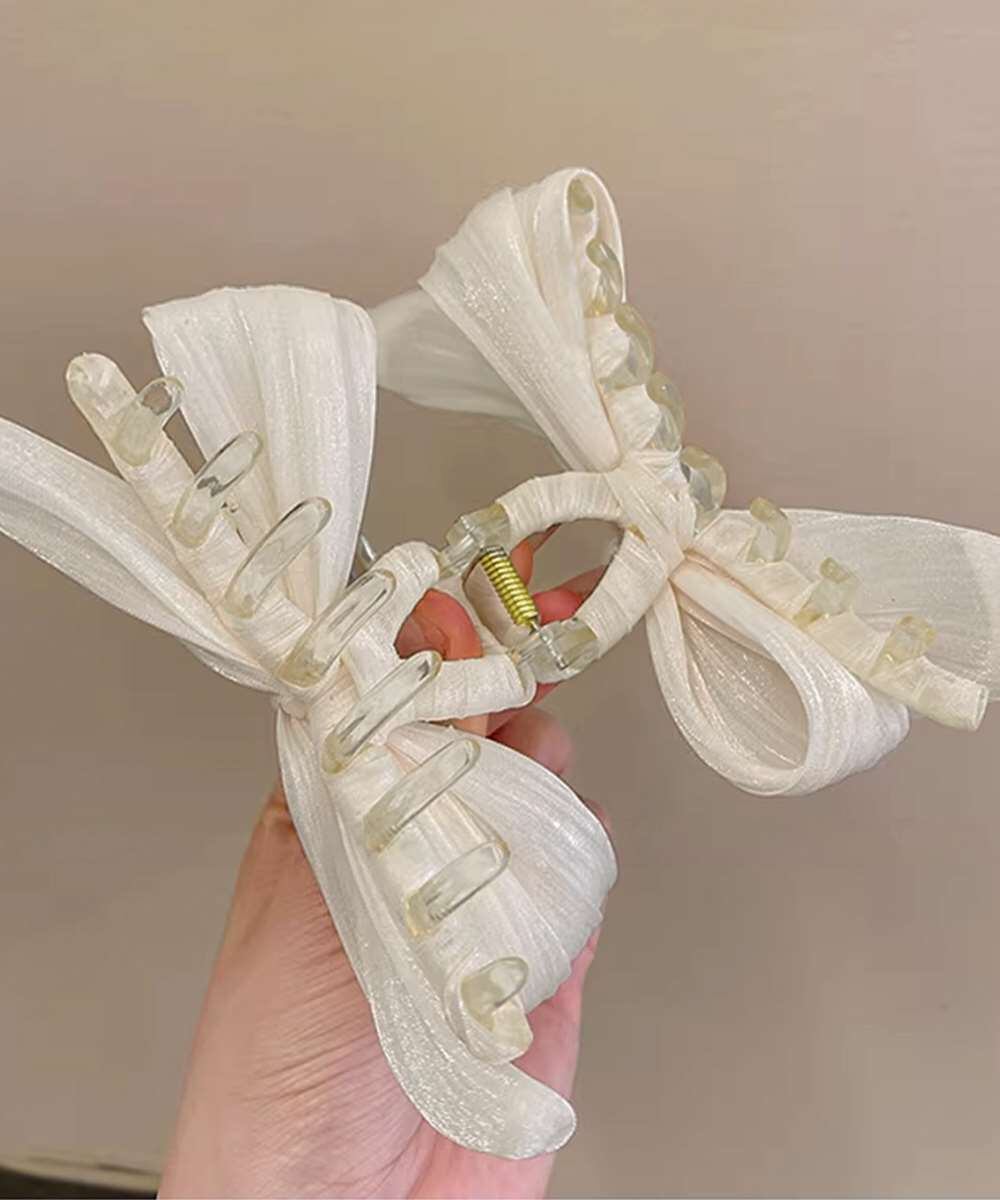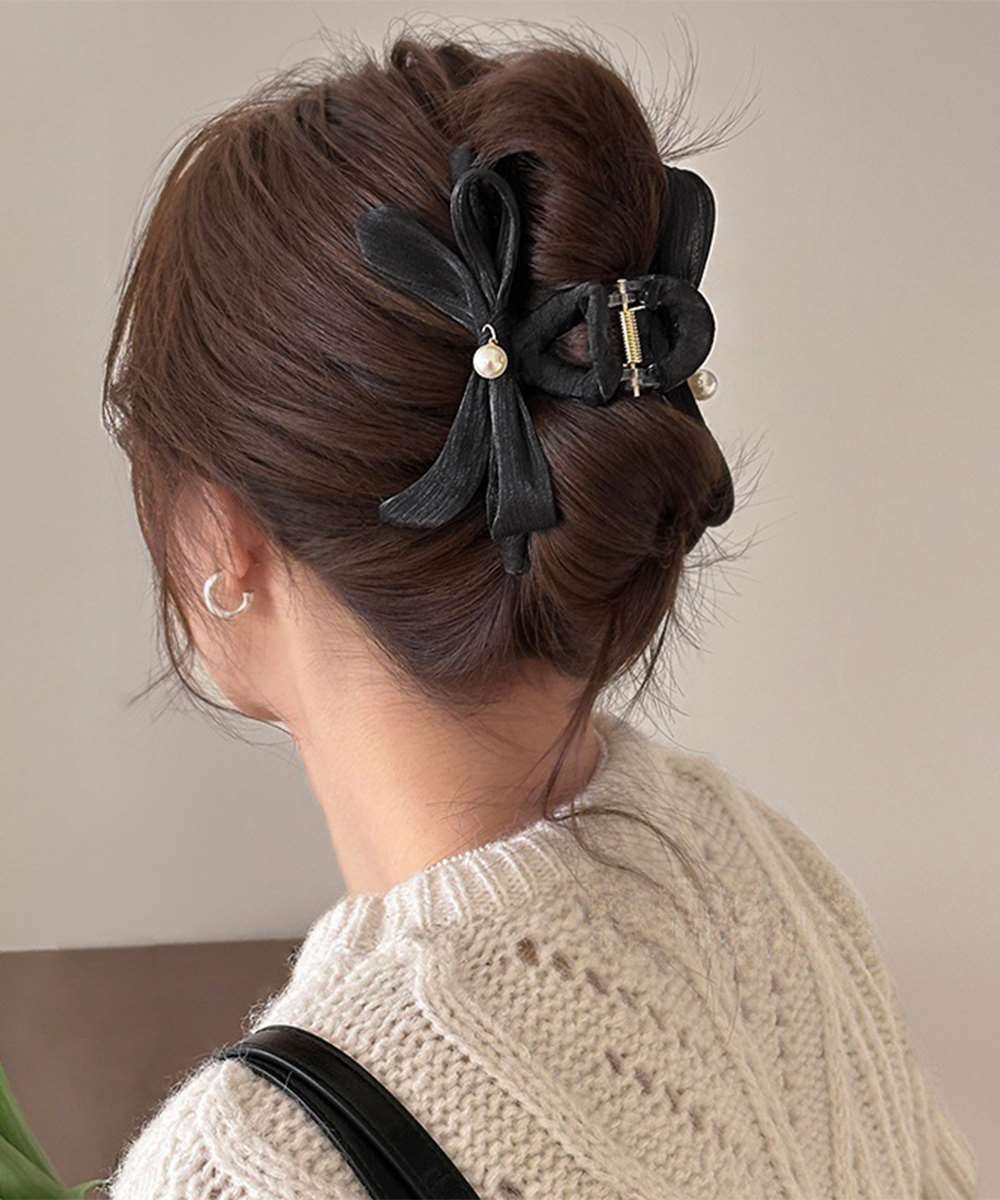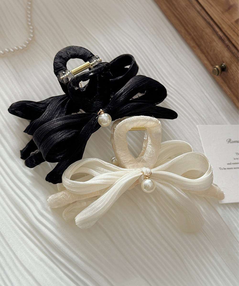 立体感のあるリボンモチーフに、さりげなく揺れるパールチャームをプラスした女性らしいデザイン。