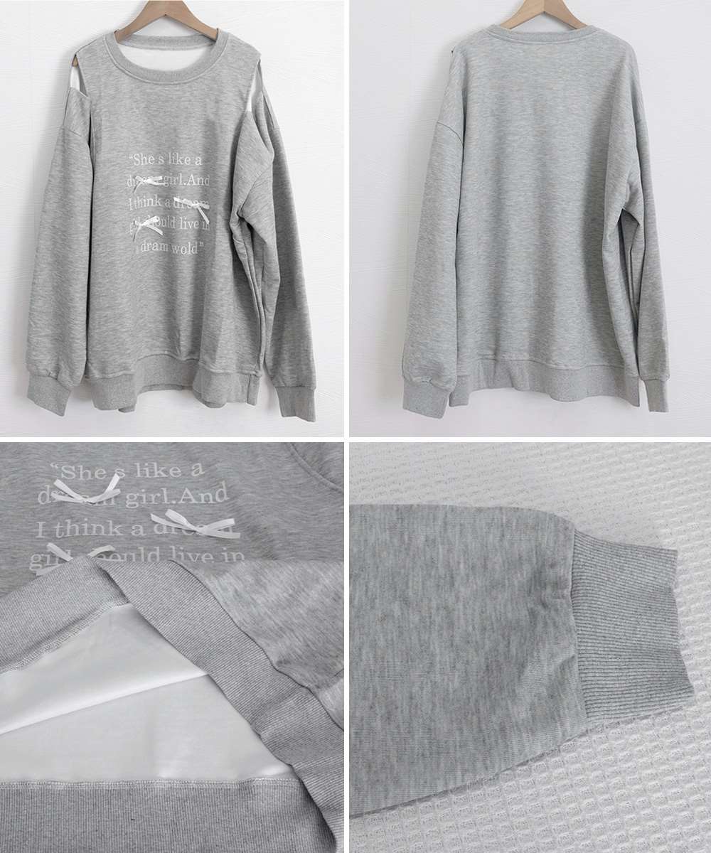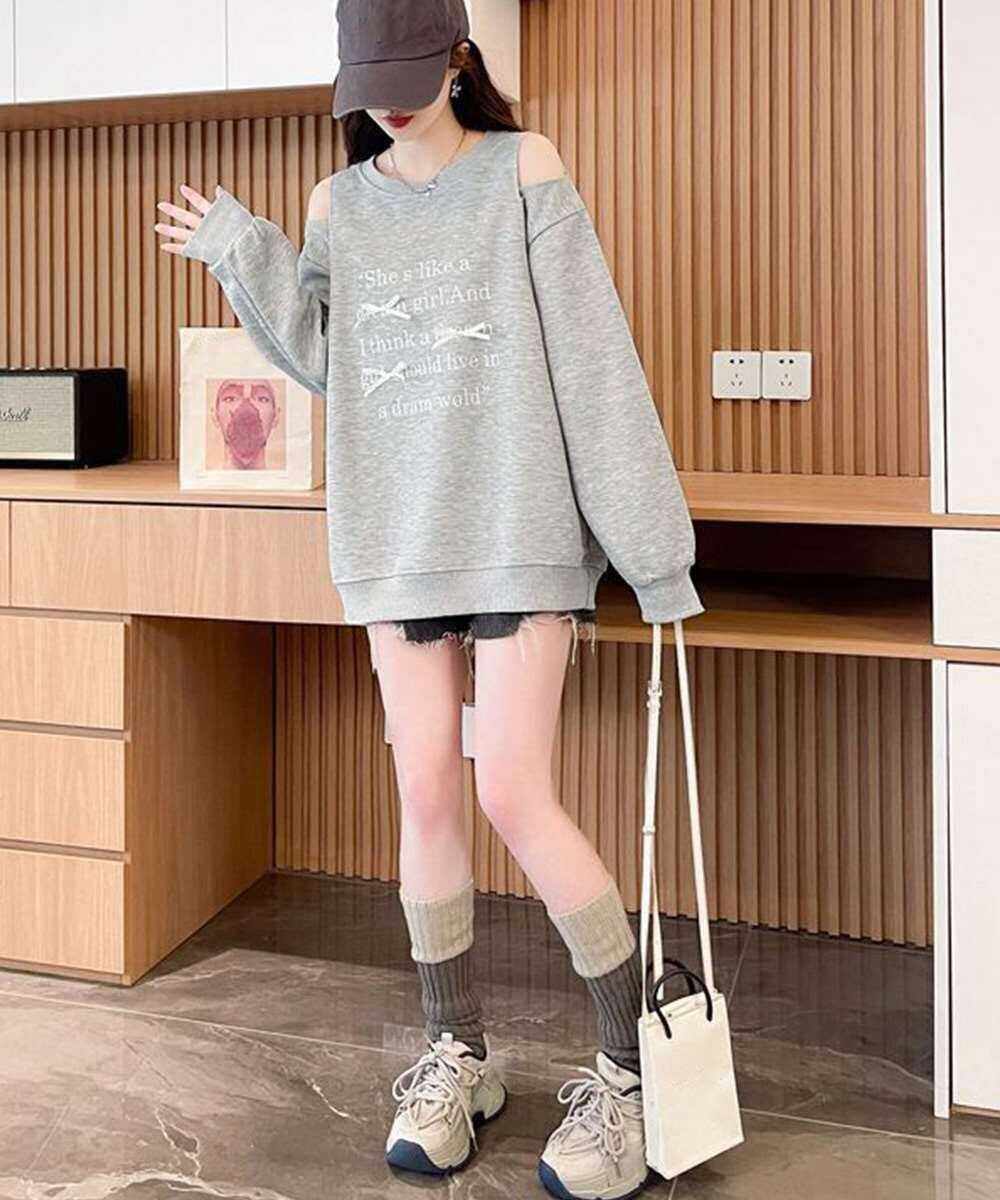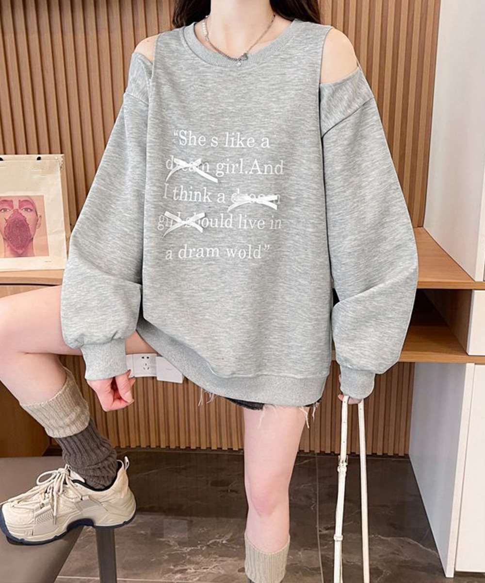 肩開きデザインが目を引く、トレンド感のあるオフショルダースウェットトップス。