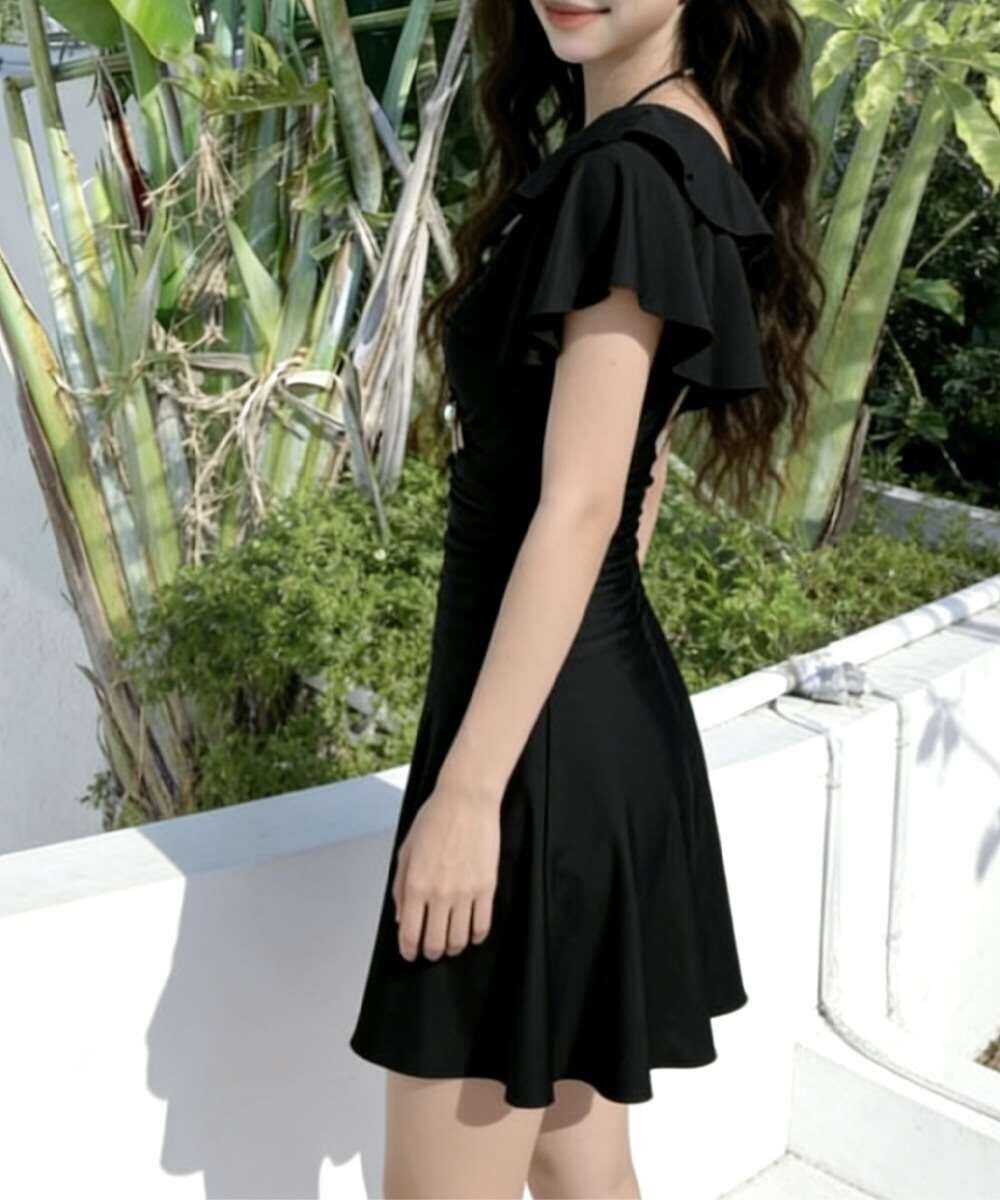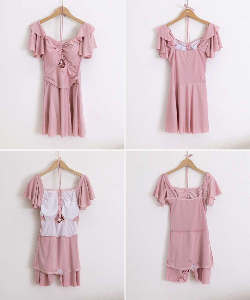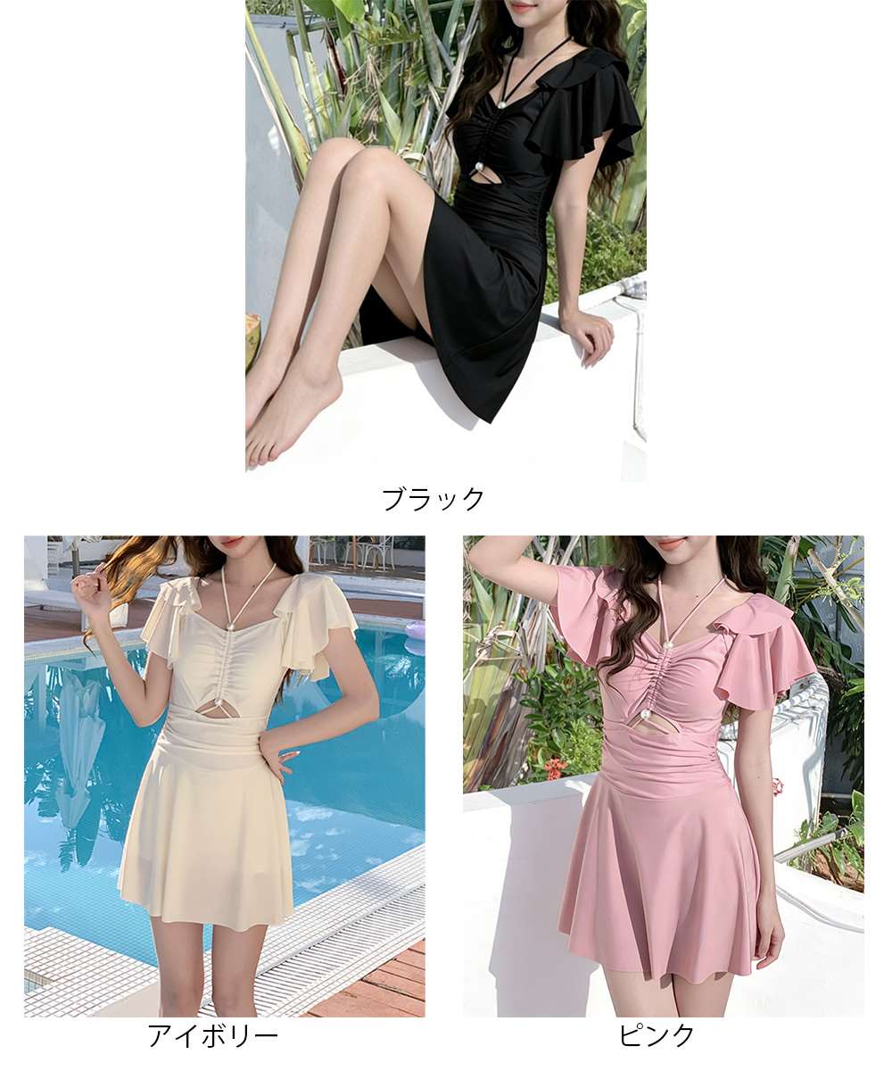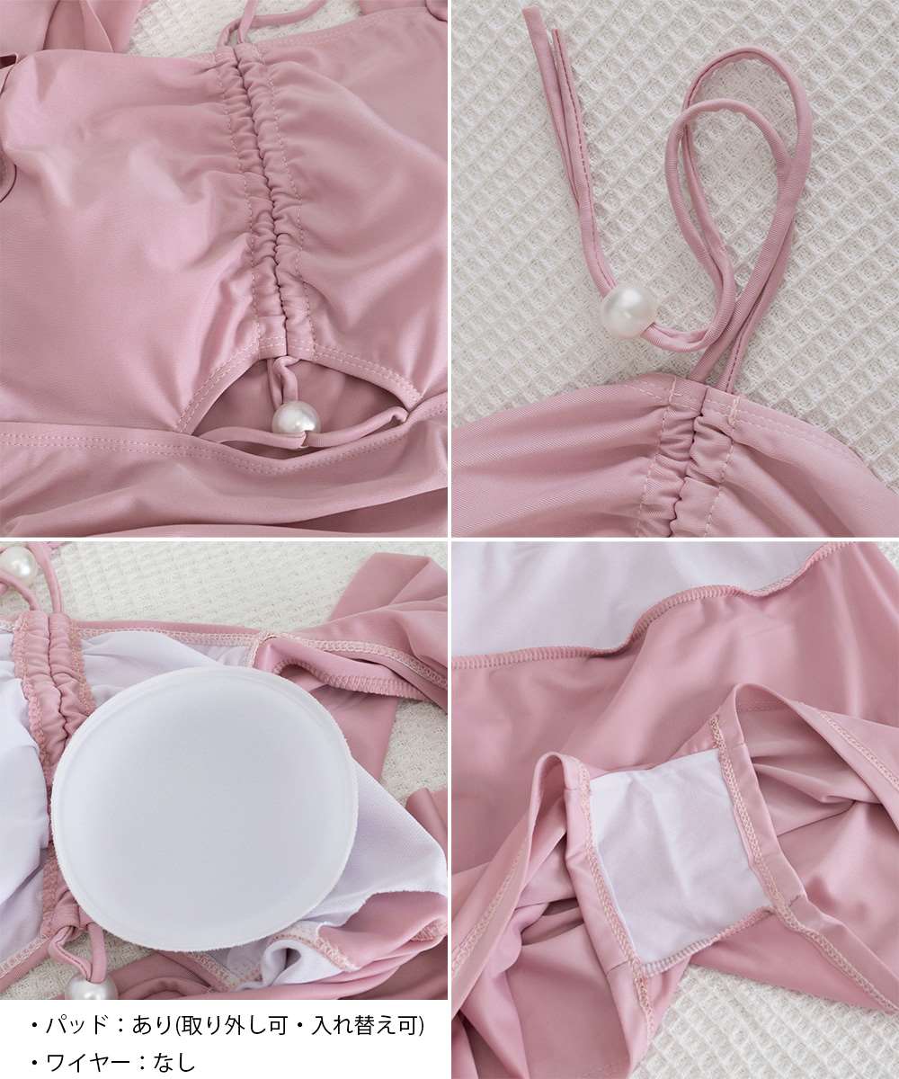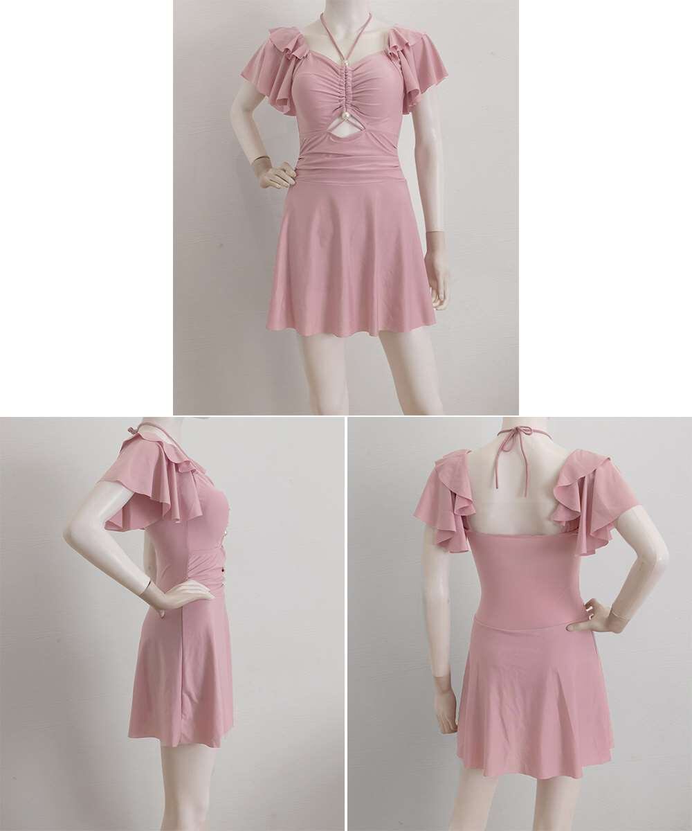 フリルスリーブ付きのホルターネックに、センターシャーリングとパール装飾をあしらったフェミニンなワンピース型レディース水着。