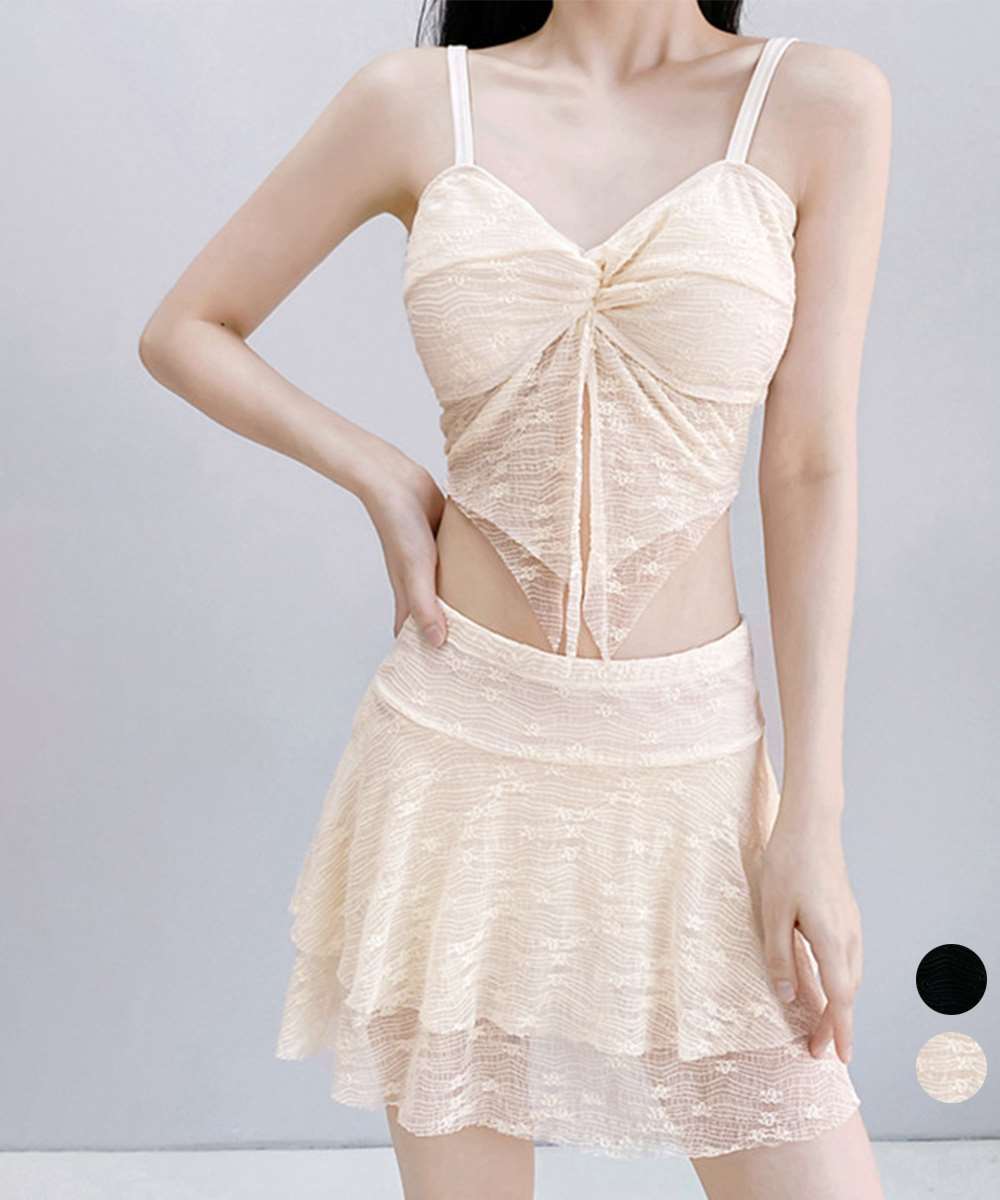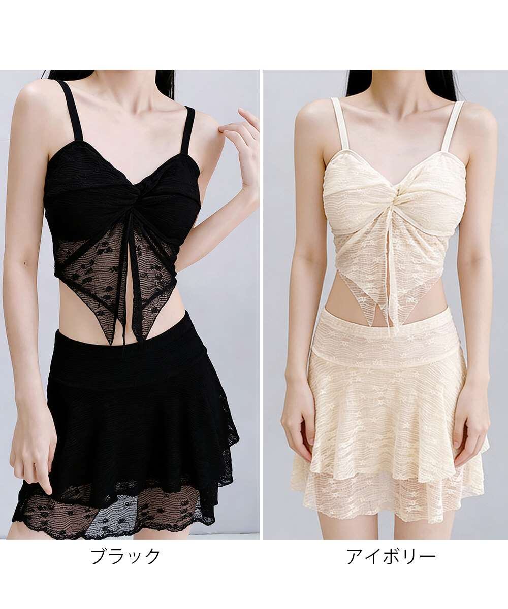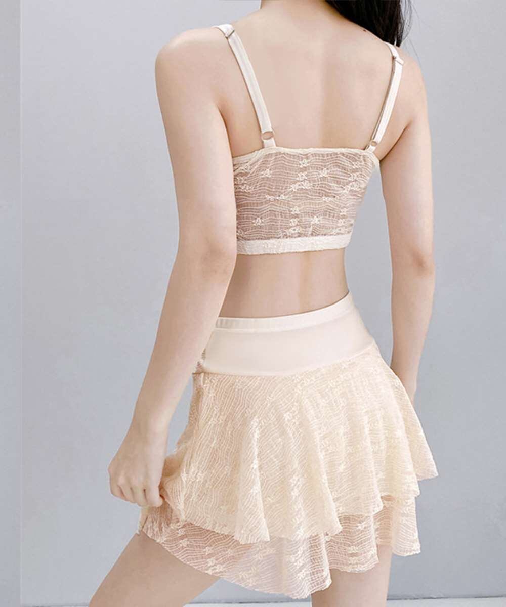 レースの透け感が魅力的な、セパレートタイプのスカート付きビキニ水着。