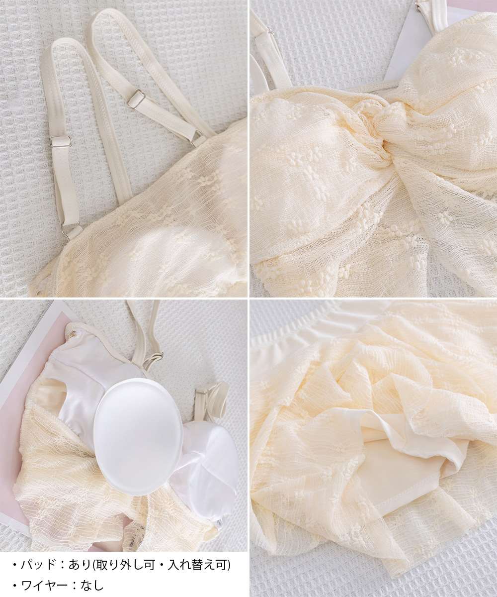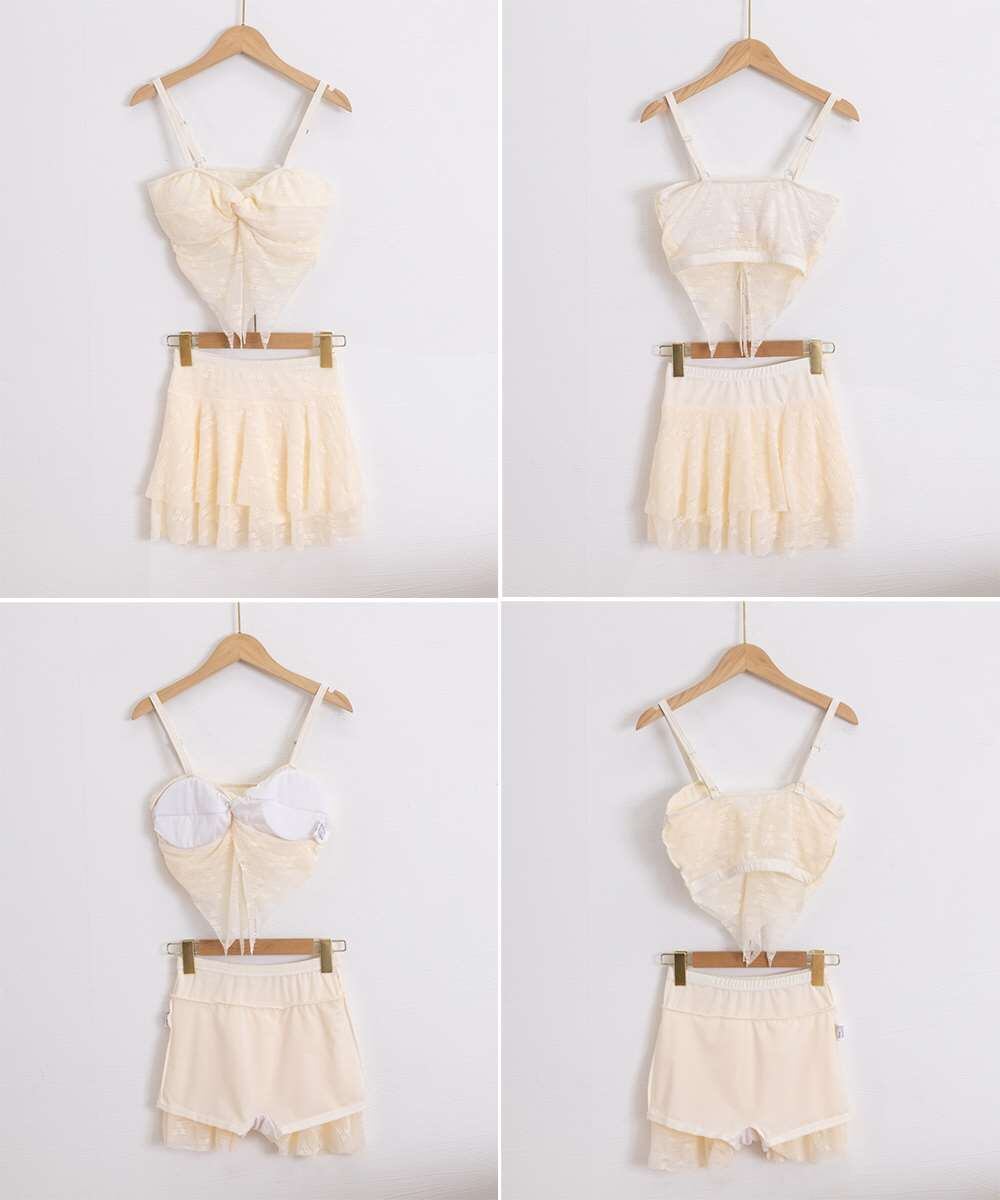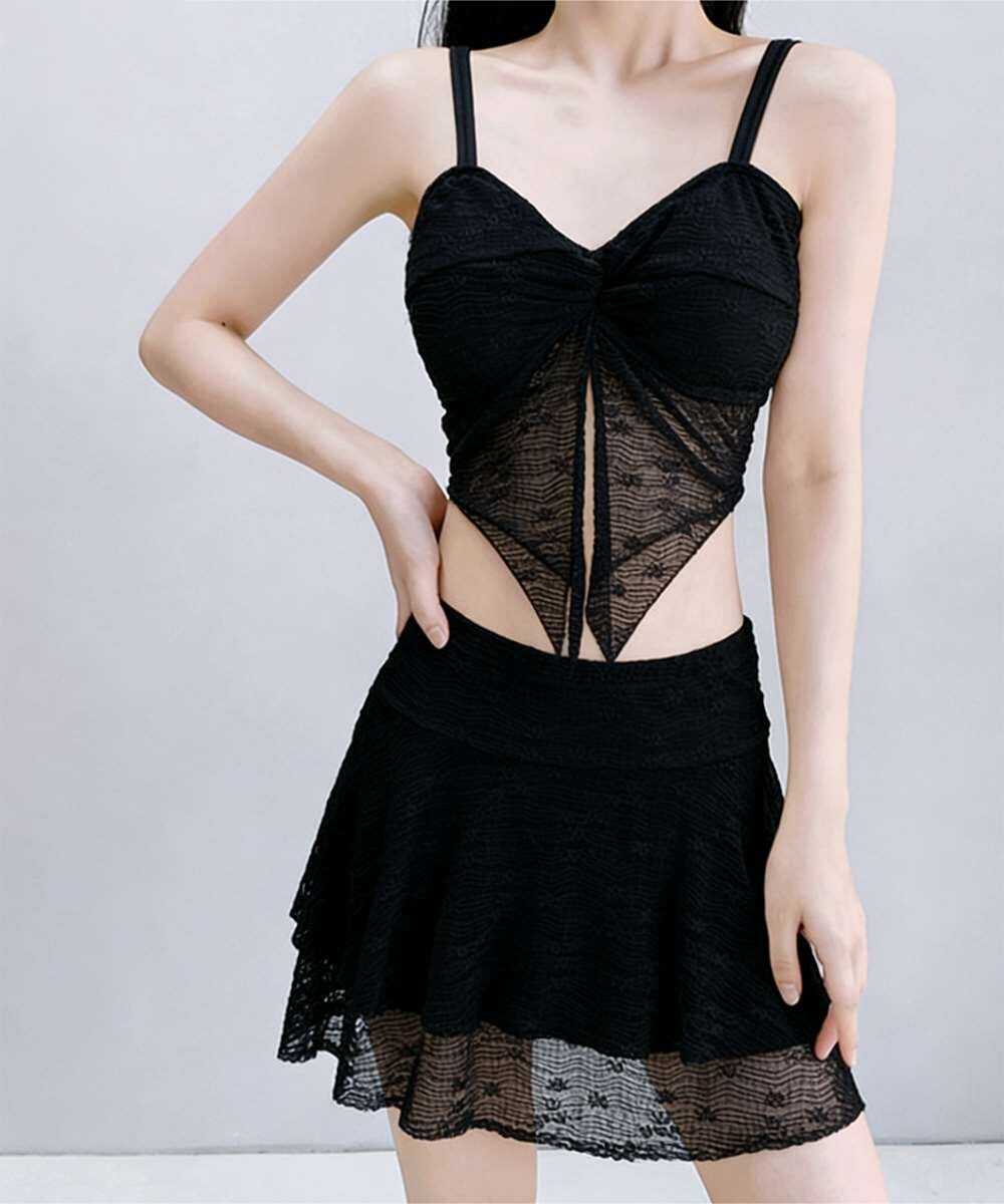 レースの透け感が魅力的な、セパレートタイプのスカート付きビキニ水着。