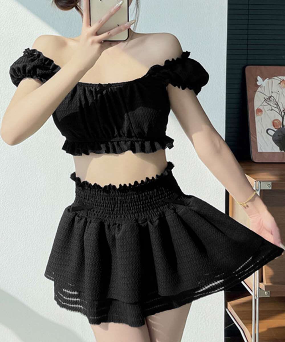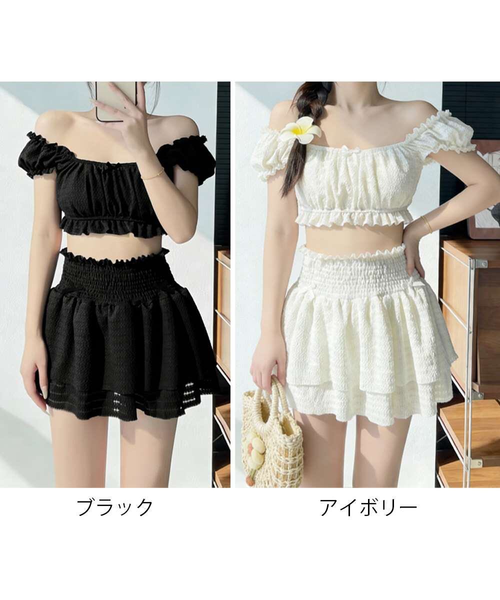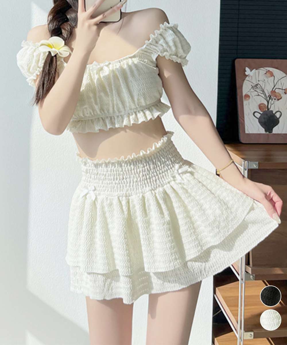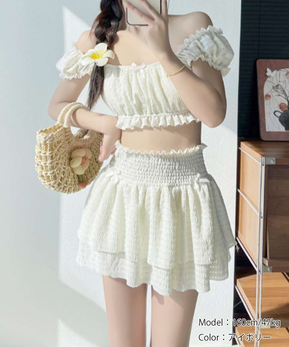 オフショルダーブラトップ、ショートパンツに加え、同素材のフリルミニスカートがセットになった水着3点セット。