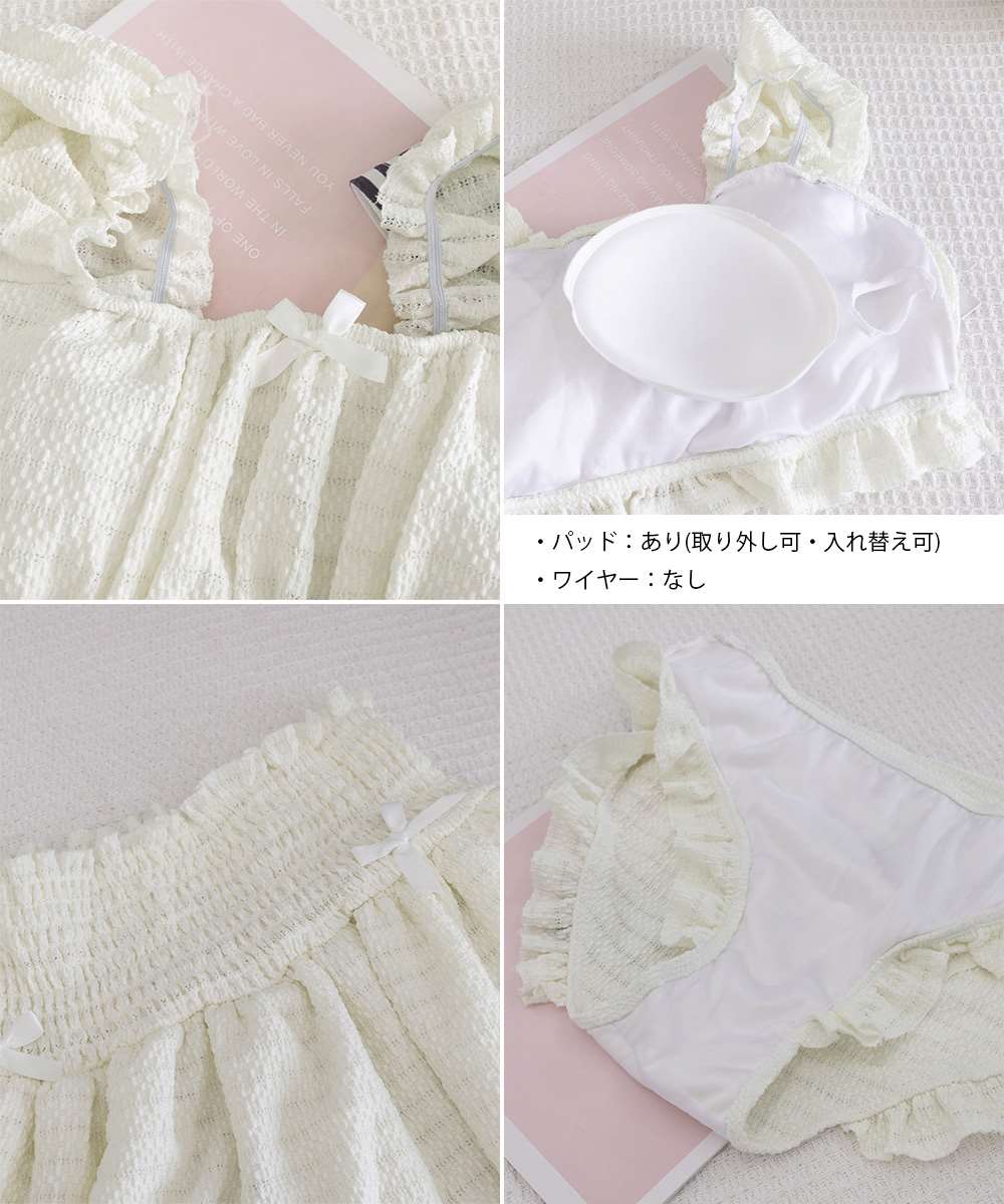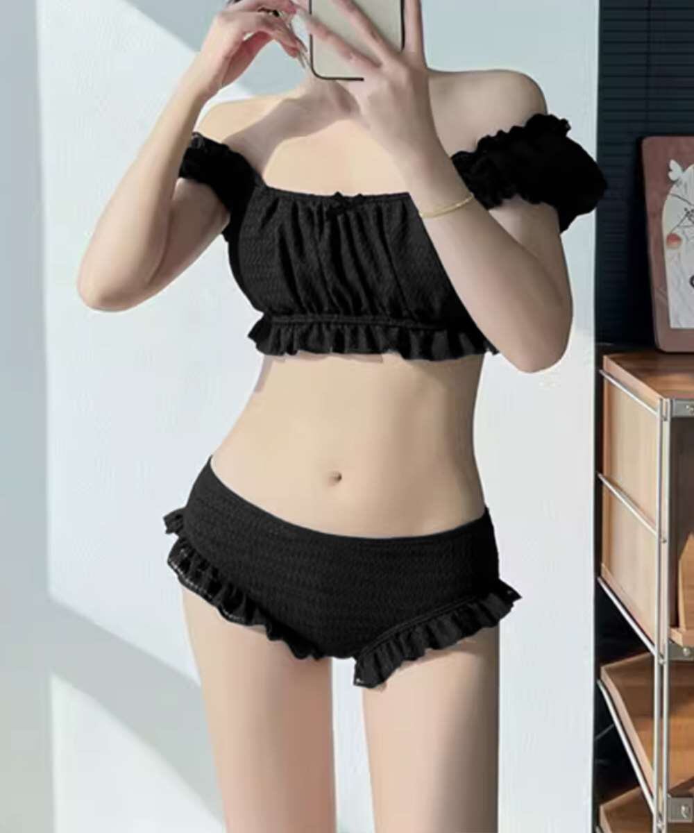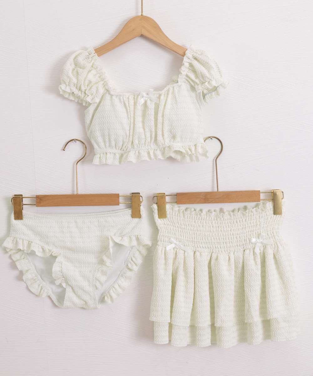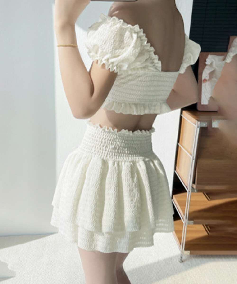 オフショルダーブラトップ、ショートパンツに加え、同素材のフリルミニスカートがセットになった水着3点セット。