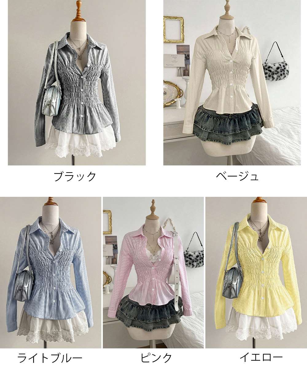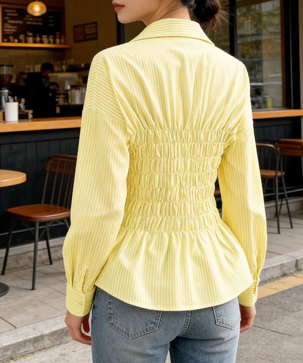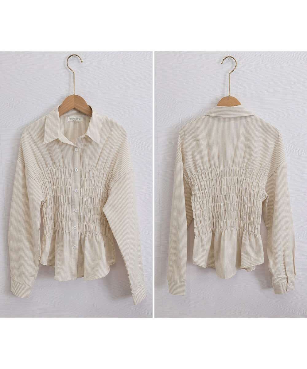 ストライプ柄 シャーリング シャツ 襟付き 長袖