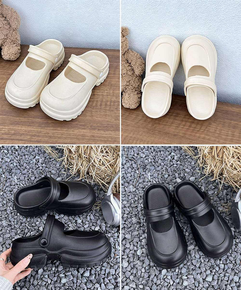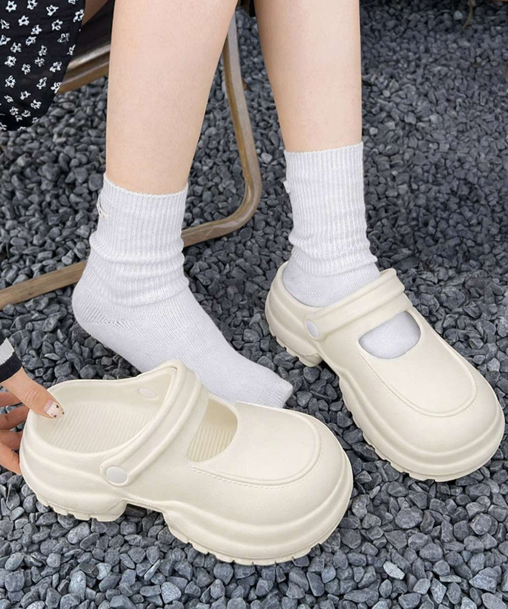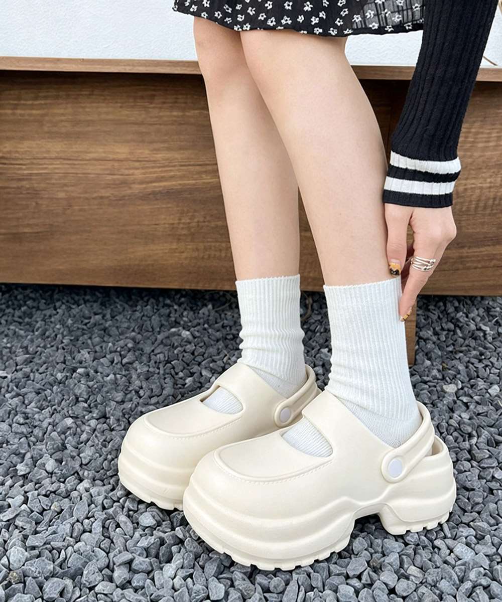 シンプルで合わせやすいデザインの厚底クロッグサンダル。