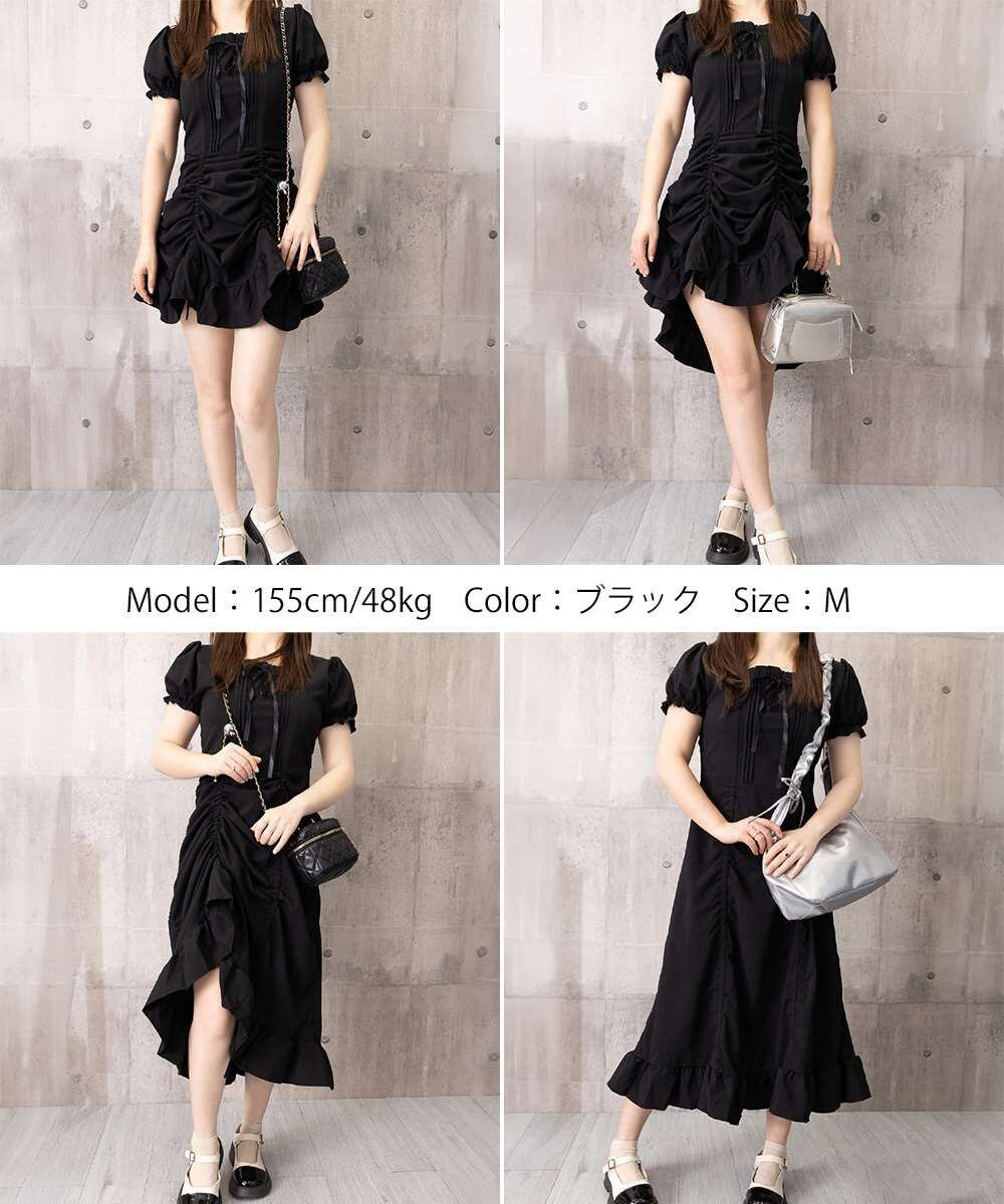 ドロストデザインで丈感を調整でき、ミニ丈からロング丈までシルエットの変化をつけられる。