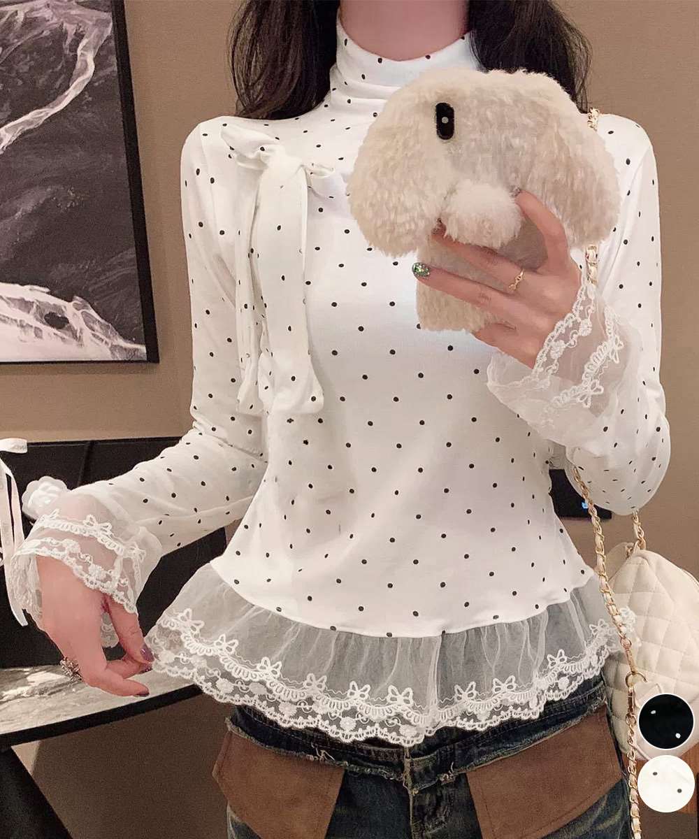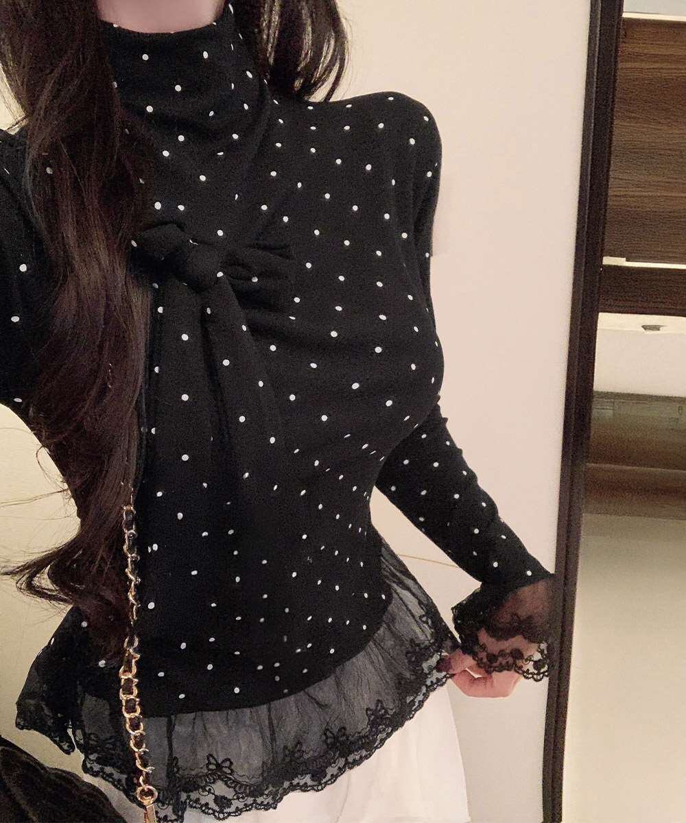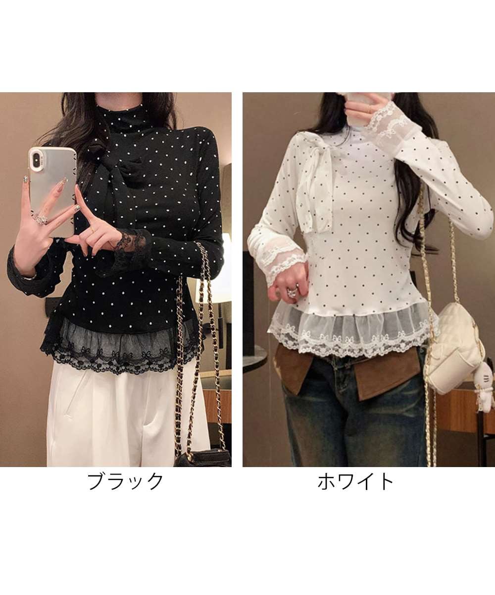 ドット柄とリボンディテールが目を引く、レース切り替えのハイネックトップス。